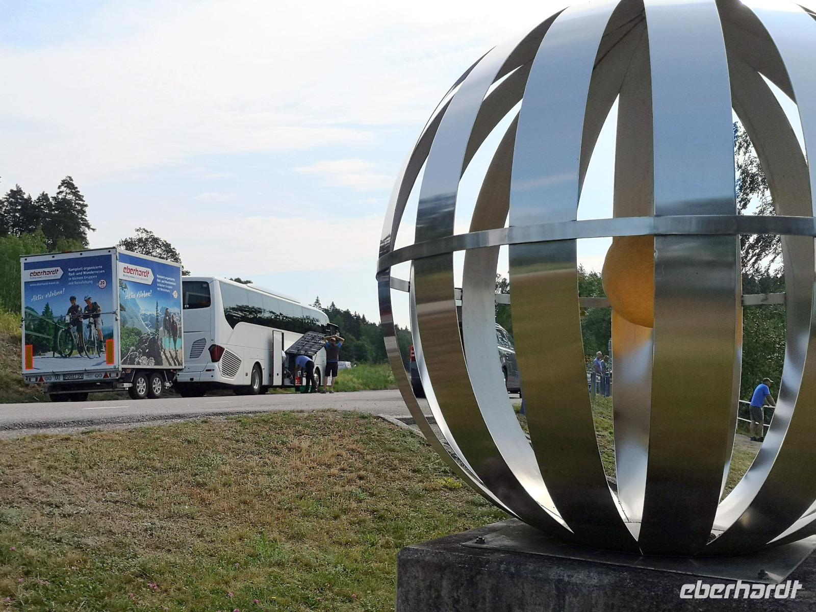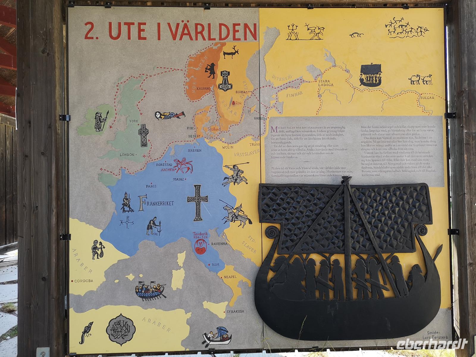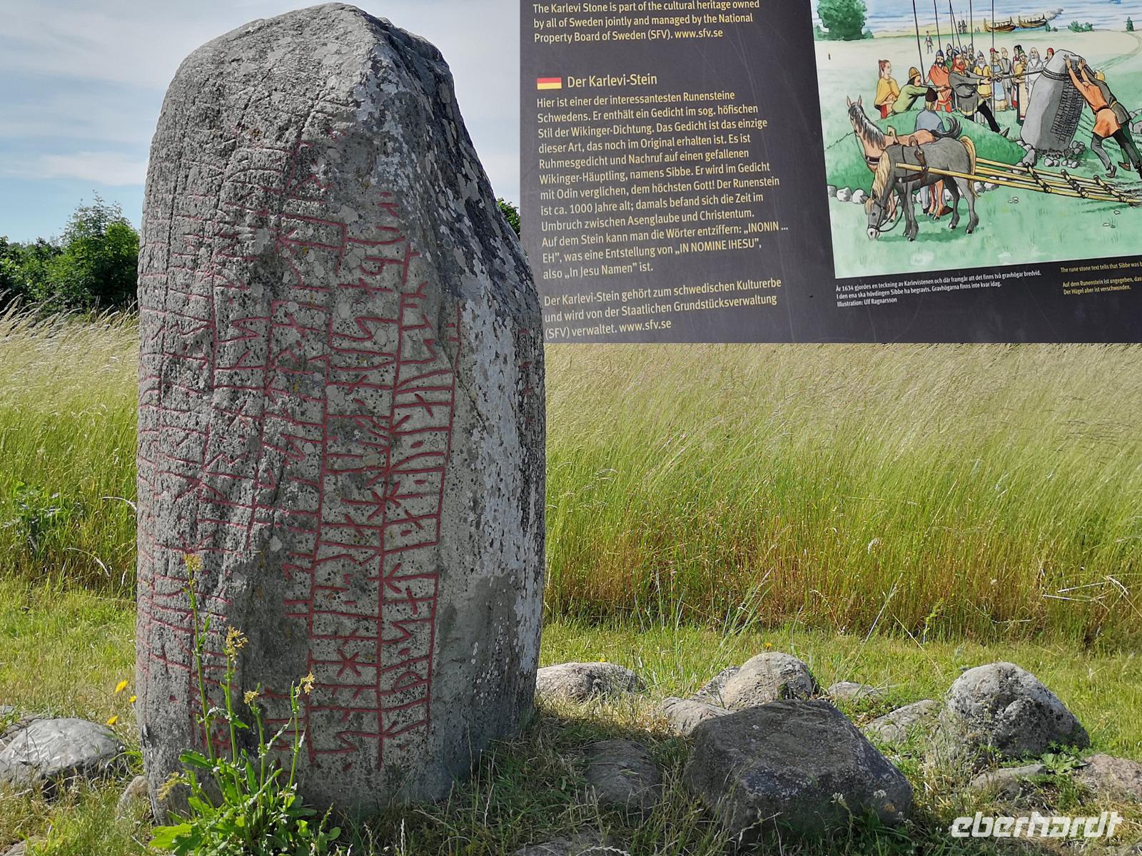 Der heutige Ausflugstag beinhaltet mehrere interessante Stopps plus Radetappe, weshalb wir schon um 8:30 Uhr starten. Von unserem Standort Linköping fahren wir ca. 60km Richtung Westen. Der Runenstein von Rök („Rökstenen") liegt ca. 20km nördlich von Gränna, wo wir gestern waren, ebenfalls am Vätternsee. Mit fast 4m Höhe ist der Runenstein der größte in Schweden; auf ihm findet man rund 750 Zeichen - die längste bekannte Runenschrift.