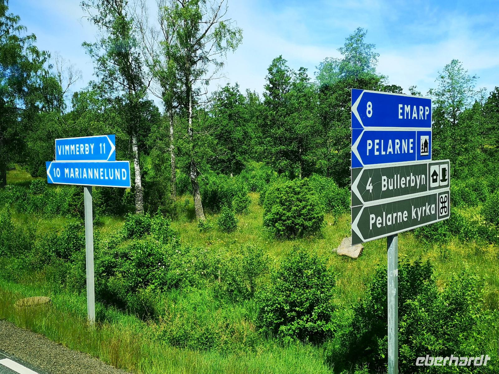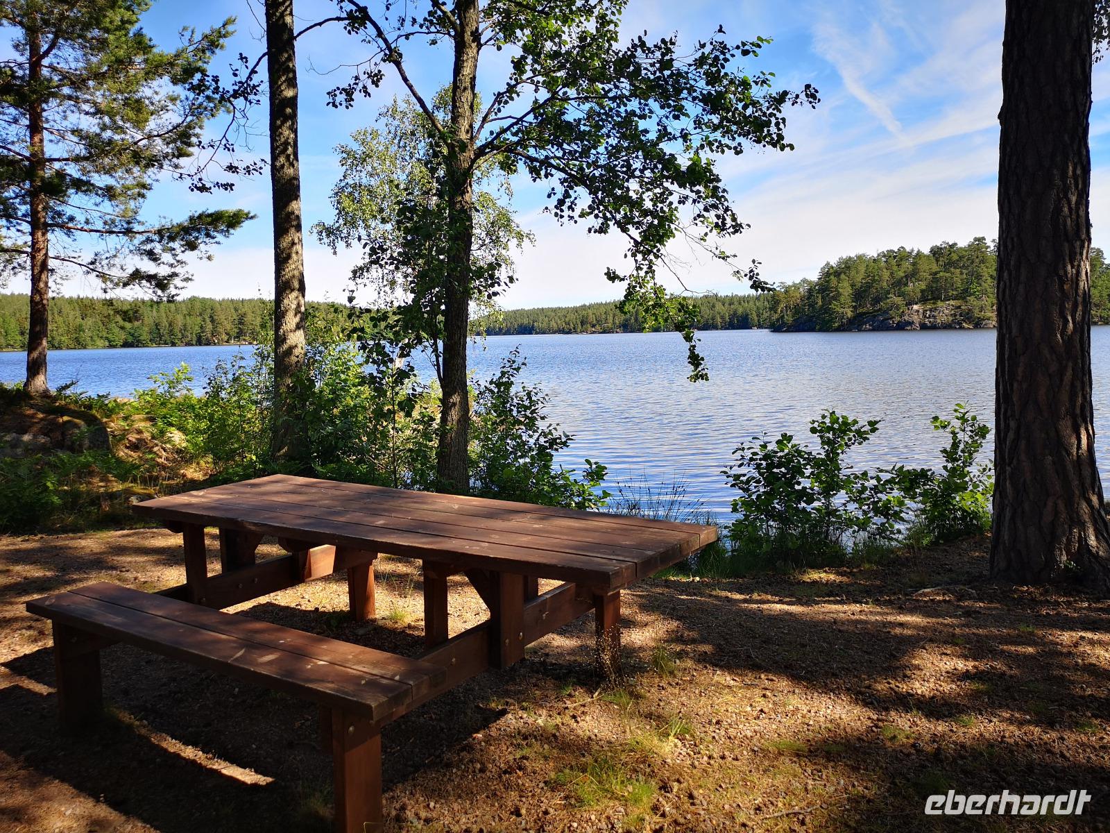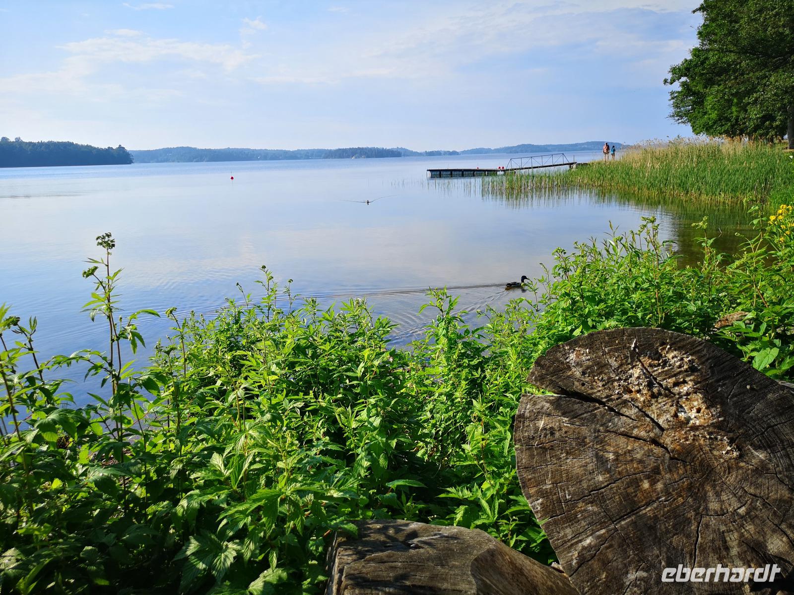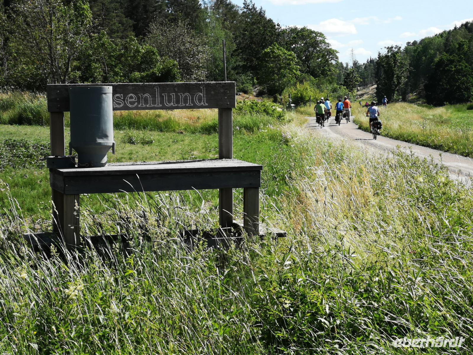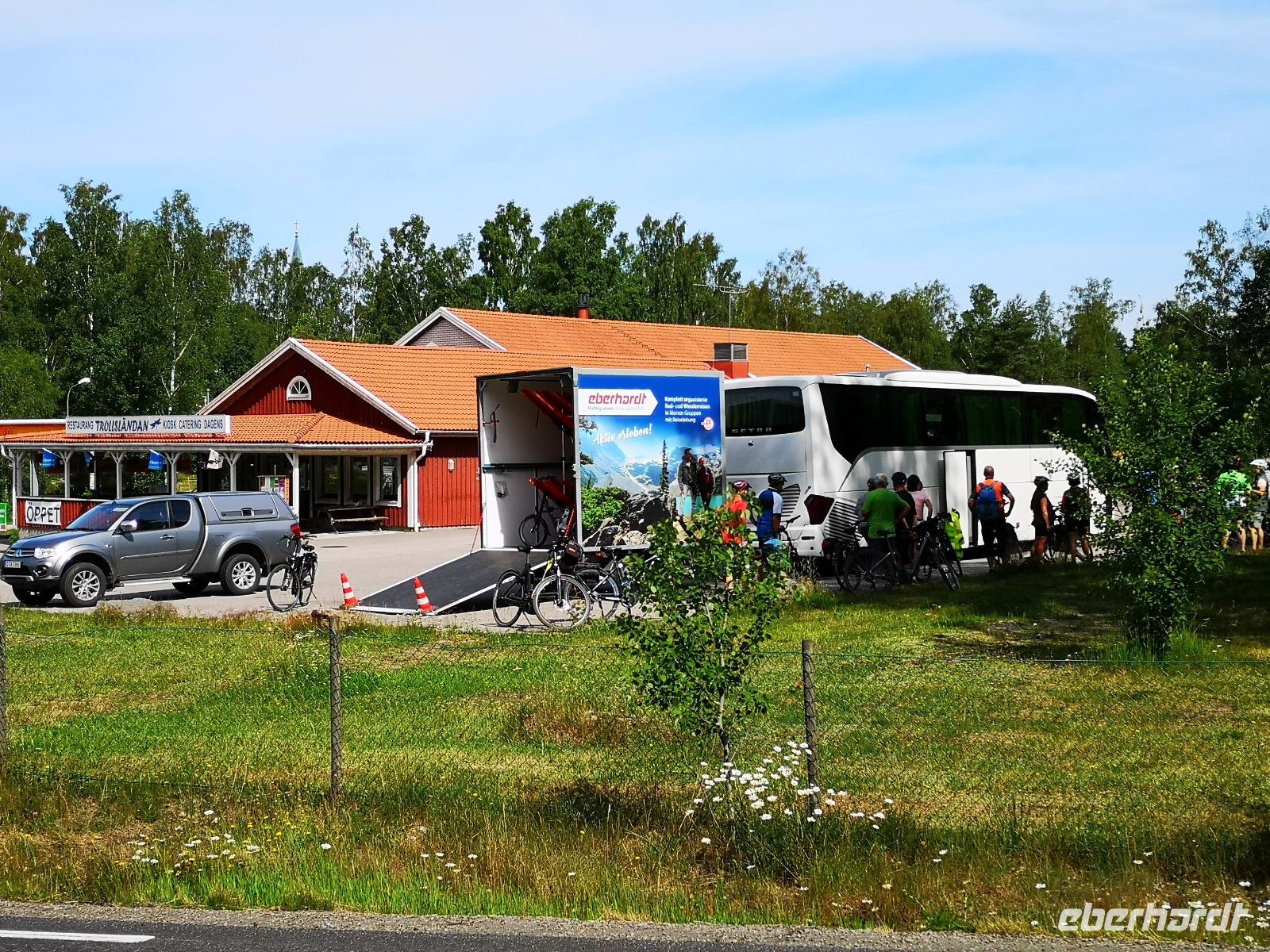 Bei Rävemåla, wo sich die Bundesstraßen (Riksvägar) 120 und 122 kreuzen, laden wir an einer Tankstelle die Räder für die letzte Etappe unserer Reise aus. Hier im südlichen Teil des Smålandes führt der Weg nach Hovmantorp durch Wälder und entlang einiger Seen. Aber nur Vorbeifahren war vielen zu wenig, und so ergab sich zur Mittagszeit doch noch ein erfrischendes Bad im flachen Virensee. Wir absolvieren dann noch die letzten Kilometer unserer Reise und verladen die Räder in Hovmantorp. Anschließend geht es zum Grönåsens Elchpark in der Nähe von Kosta. Im Anschluß an den Parkbesuchs gibt es noch eine „grill korv", eine Elch-Bratwurst, die man selbst grillen kann.