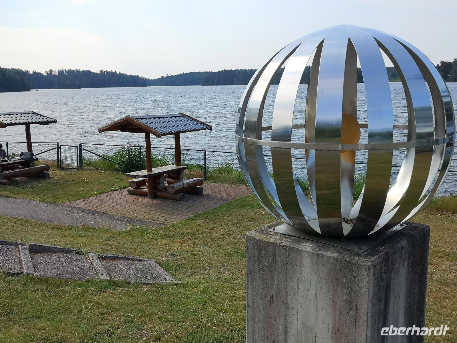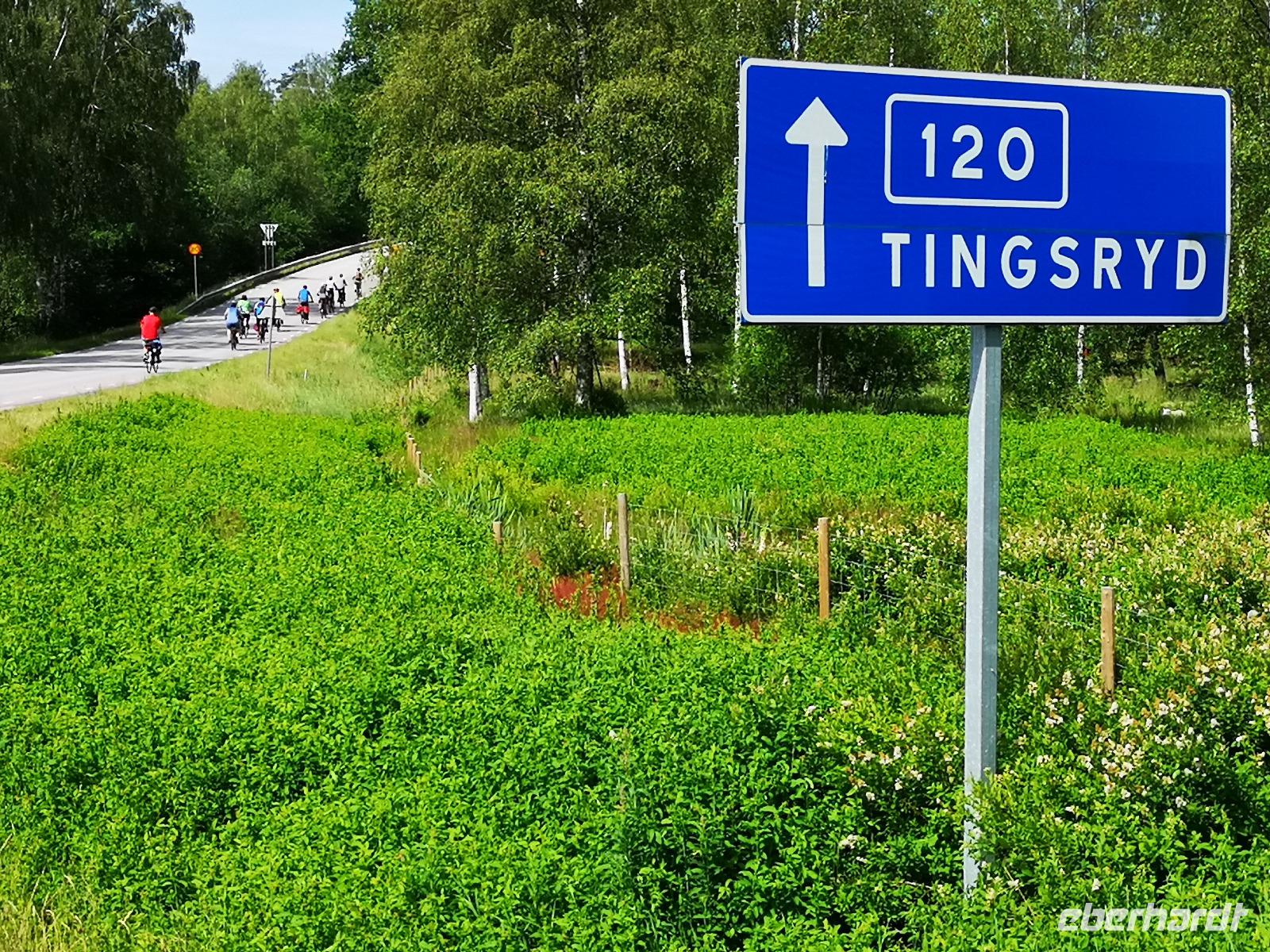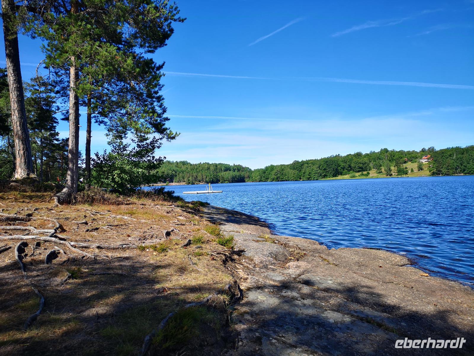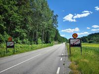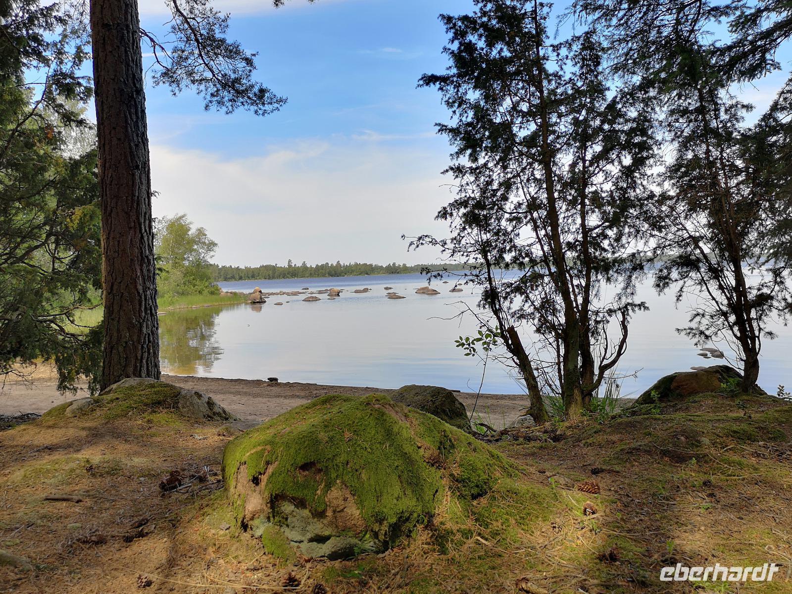 Bei Rävemåla, wo sich die Bundesstraßen (Riksvägar) 120 und 122 kreuzen, laden wir an einer Tankstelle die Räder für die letzte Etappe unserer Reise aus. Hier im südlichen Teil des Smålandes führt der Weg nach Hovmantorp durch Wälder und entlang einiger Seen. Aber nur Vorbeifahren war vielen zu wenig, und so ergab sich zur Mittagszeit doch noch ein erfrischendes Bad im flachen Virensee. Wir absolvieren dann noch die letzten Kilometer unserer Reise und verladen die Räder in Hovmantorp. Anschließend geht es zum Grönåsens Elchpark in der Nähe von Kosta. Im Anschluß an den Parkbesuchs gibt es noch eine „grill korv", eine Elch-Bratwurst, die man selbst grillen kann.