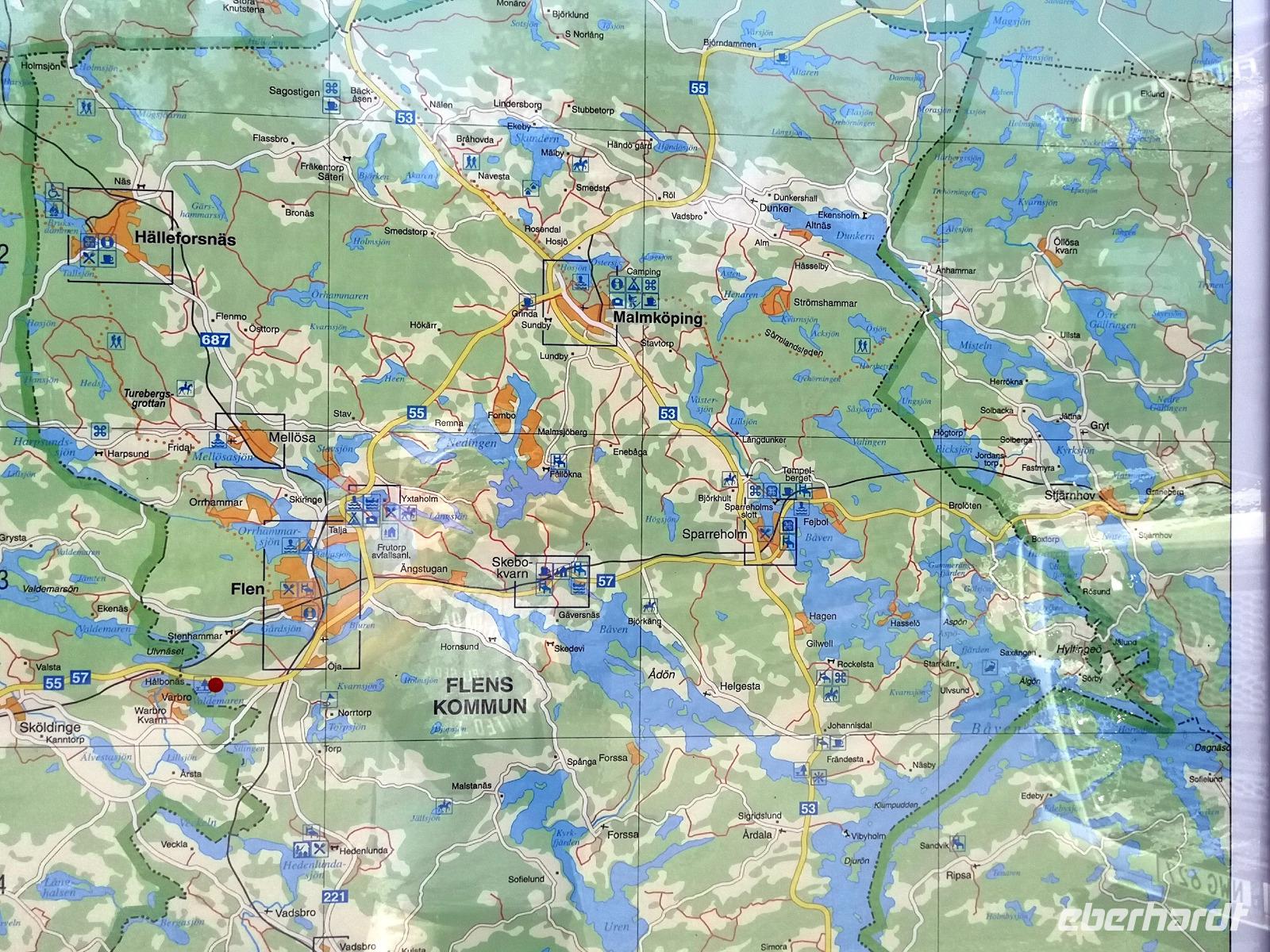 Nach zwei schönen und abwechslungsreichen Tagen in und um Linköping heißt es wieder Koffer packen, denn wir wollen heute weiter in die schwedische Hauptstadt Stockholm. Unterwegs sind natürlich wieder interessante Stopps eingeplant, so z.B. auch die erste Pause kurz nach 10:00 Uhr am Valdemaren-See in der Nähe von Flens (siehe Markierung links unten auf Foto mit der Umgebungskarte). Das Landschaftsbild dieser Gegend ist geprägt von unzähligen kleineren Seen. An Malmköping vorbei geht es weiter Richtung Nordosten, bis wir schließlich um halb zwölf Mariefred am Mälarensee erreichen. Wir freuen uns auf den Besuch des burgähnlichen Schlosses Gripsholm, welches 1537 von Gustav I. Wasa erbaut wurde.