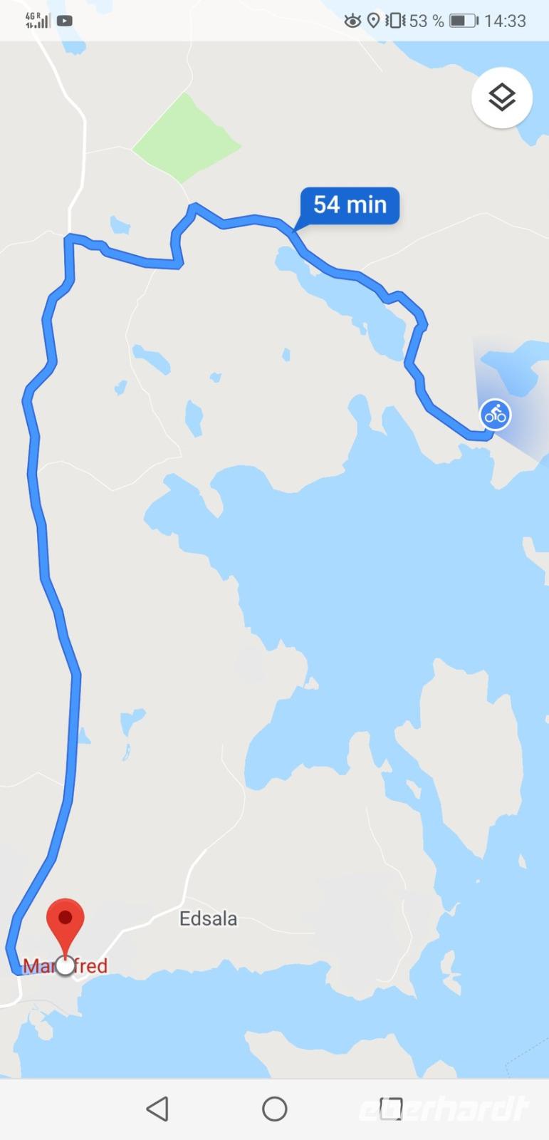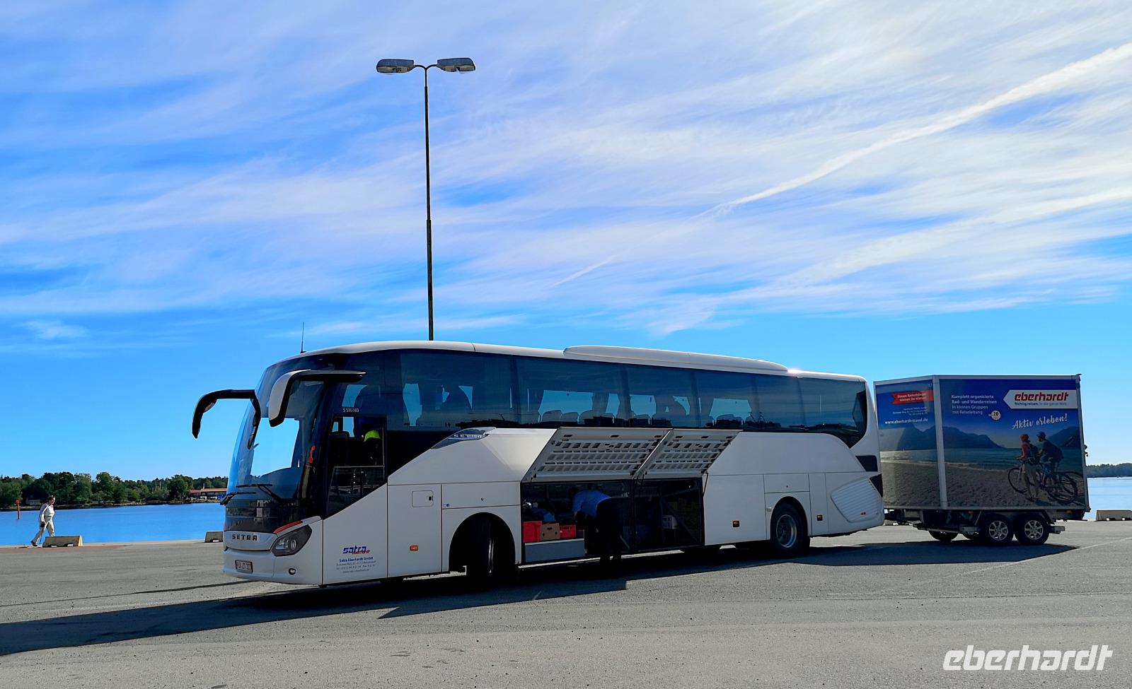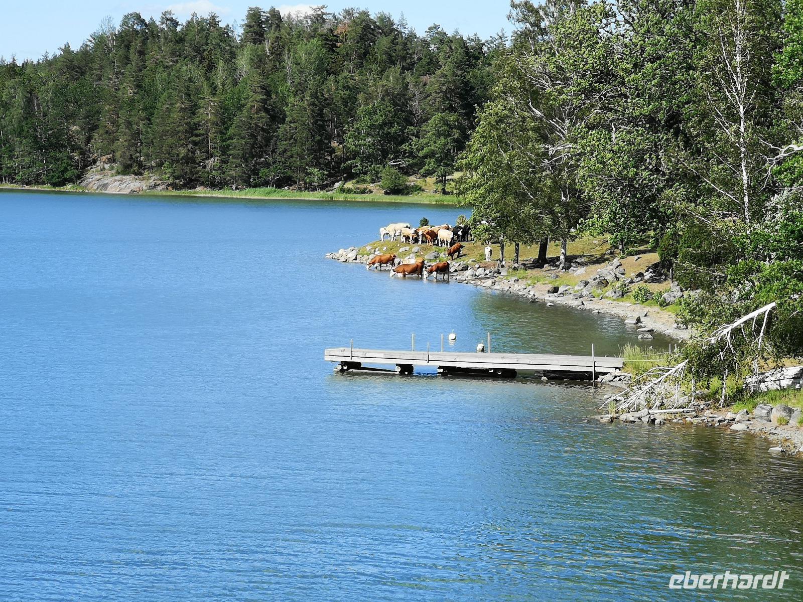 Da wir gestern erst spät ins Bett gekommen sind, fahren wir erst um 9:00 mit dem Bus los: bis Västervik sind es 273km, von denen 30 mit dem Rad gefahren werden. Erst einmal setzen wir mit der Fähre über den „Fjord" Bråviken über, von Säter nach Skenäs. Nach der Überfahrt und 30Min Busfahrt erreichen wir Söderköping, wo die Gruppe eine kurze Pause am Göta-Kanal einlegen kann; nach einer kurzen Weiterfahrt bis Valdemarsvik laden die beiden Reisebegleiter Armin und Jürgen die Räder aus, und um 14:30 ist die Gruppe am Hafen vorbei und auf dem Ostküstenradweg „Kustlinjen" Richtung Västervik unterwegs. Woran auch immer es liegen mag, wir kommen heute nicht so richtig in Schwung und haben bis 18:00 Uhr nur ca. 30km geschafft. Zum Hotel wären es nochmal 30km, weshalb wir entscheiden, den Bus zu nehmen, auch um nicht zu spät zu Abend zu essen. Nach dem Verladen, der Fahrt und dem Check-In im „Best Western Plus Västervik" treffen wir uns um 20:00 zum Abendessen.