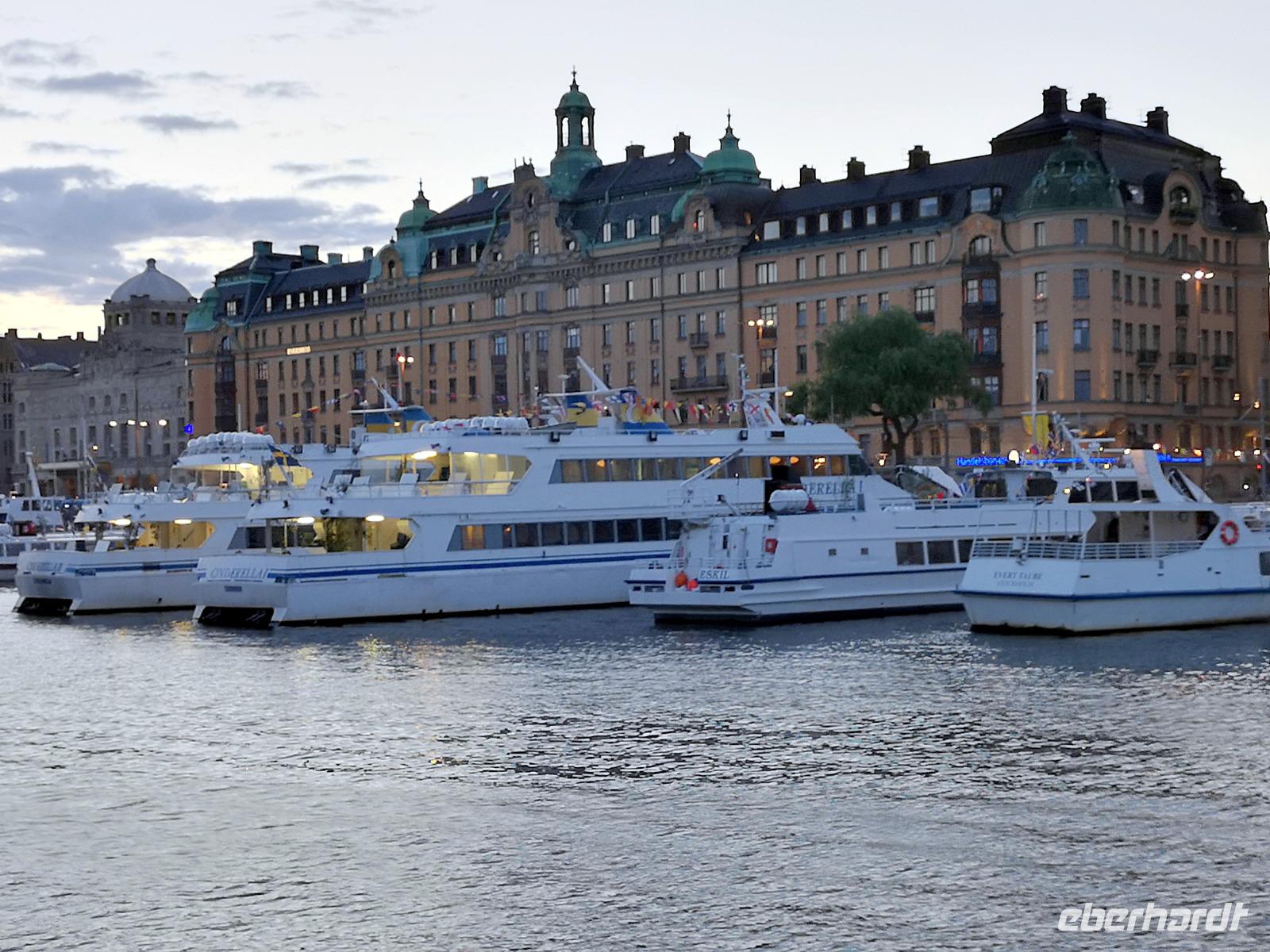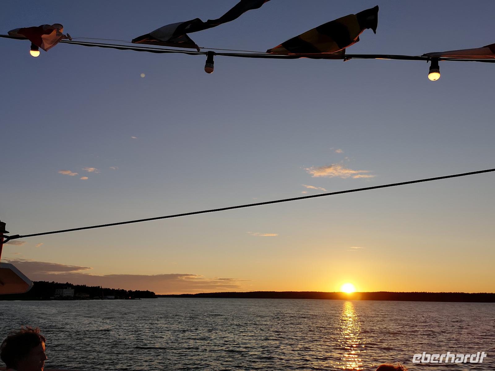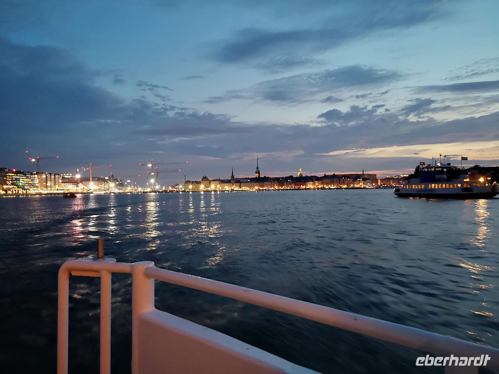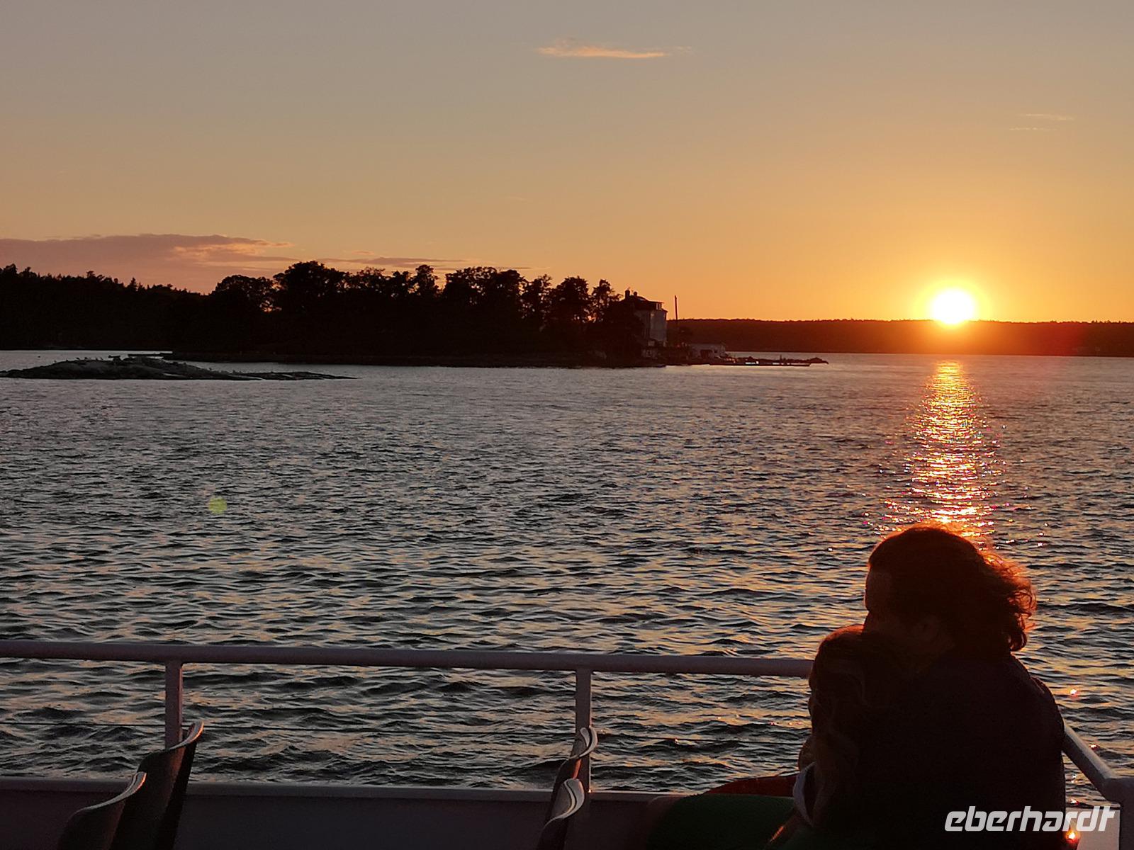 Trotz großen Andrangs schaffen wir es, rechtzeitig am „Tingsvallen" zu sein, um das Spektakel von Beginn an mitverfolgen zu können. Ab hier geht jeder seine eigenen Wege, feiert mit, nimmt eines der zahlreichen Gastroangebote wahr, spaziert durch den Tierpark, oder läuft ca. 15Min zu Fuß ins Stadtzentrum. Es ist reichlich Zeit, denn wir treffen uns erst um 19:00 Uhr wieder am „Nybrokajen 10", wo aus die dreistündige Schärenkreuzfahrt mit Krabben-Buffett beginnt. An dieser Stelle möchte ich ausnahmsweise nichts beschreiben, denn die Abendstimmung zu dieser Jahreszeit ist wirklich unbeschreiblich schön. Das muß man selbst erlebt haben! Die Rückfahrt zum Hotel erfolgt mit der „rosa Linie", der „Pendeltâg". Um Mitternacht dürfen sich alle zufrieden zur Nachtruhe begeben.