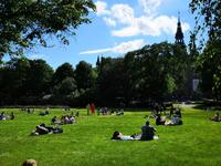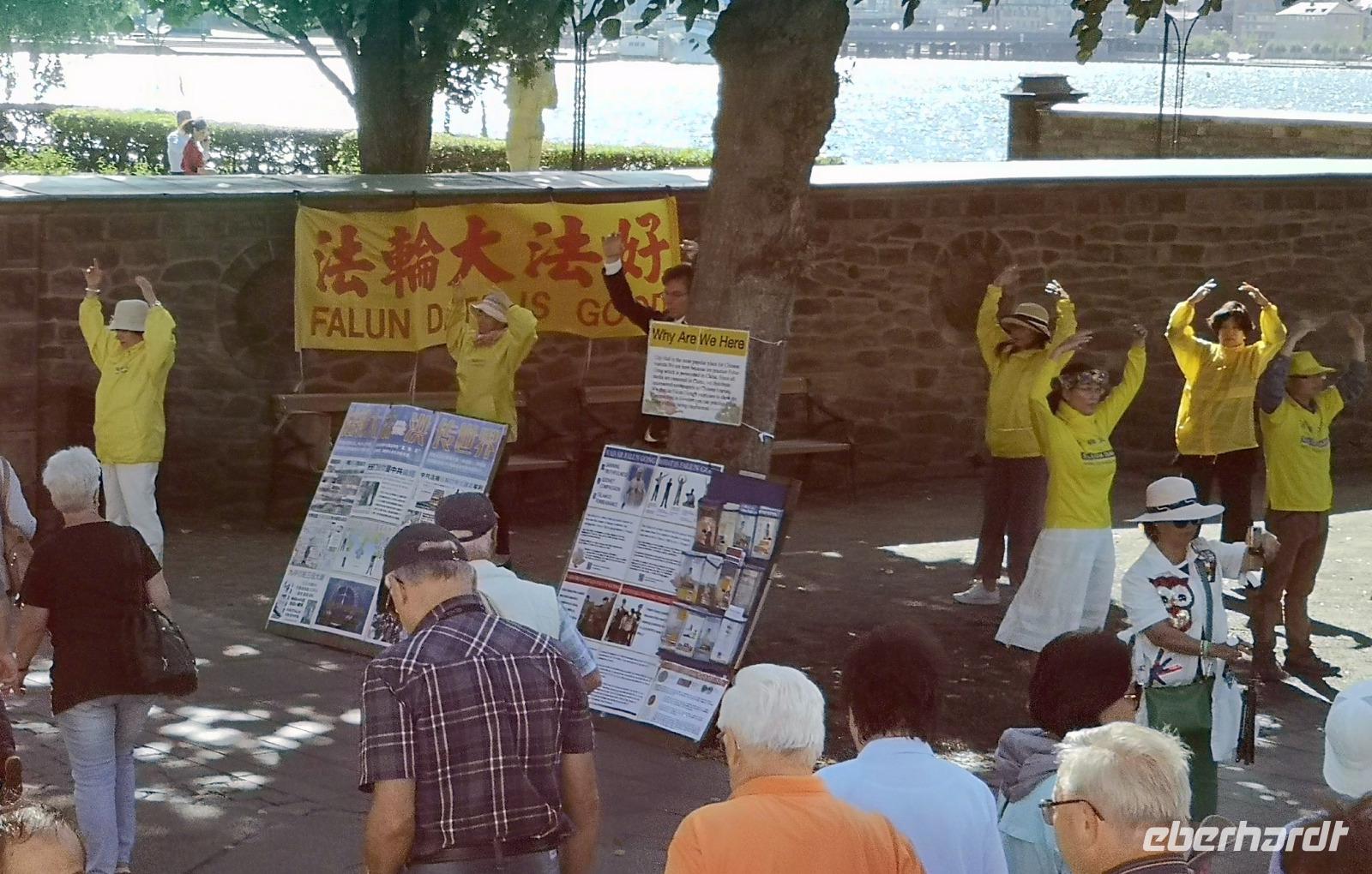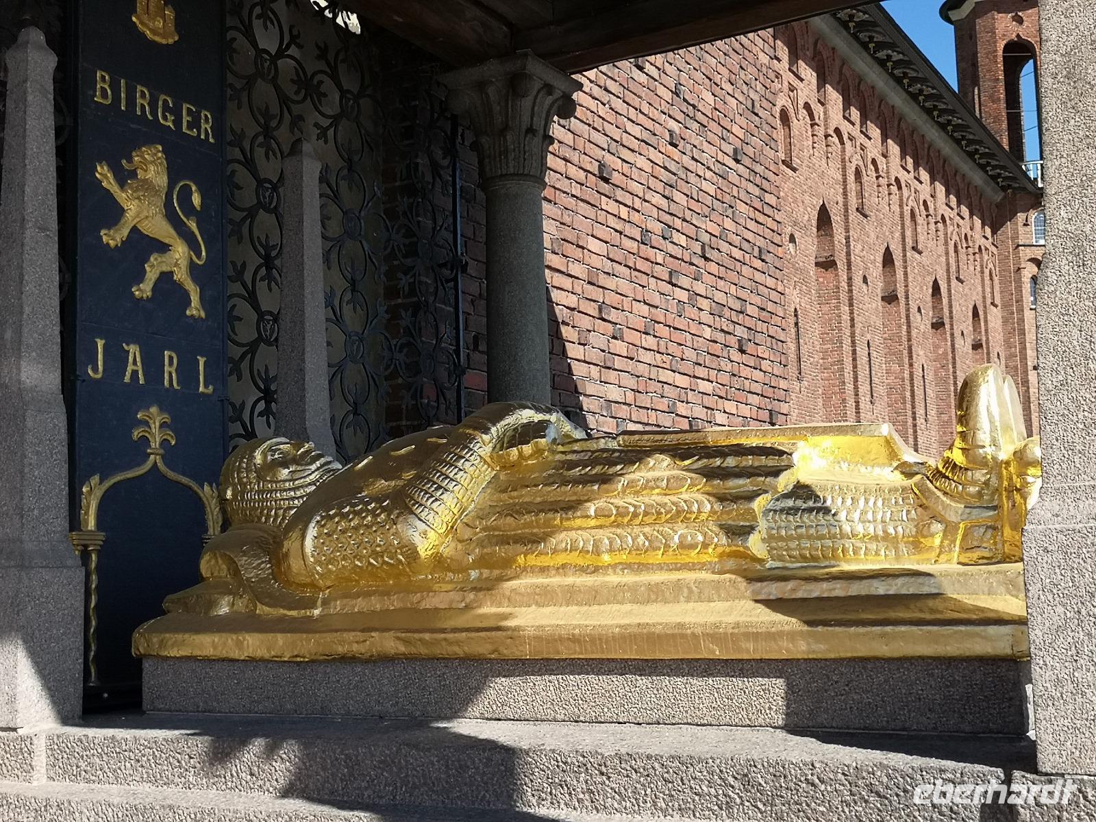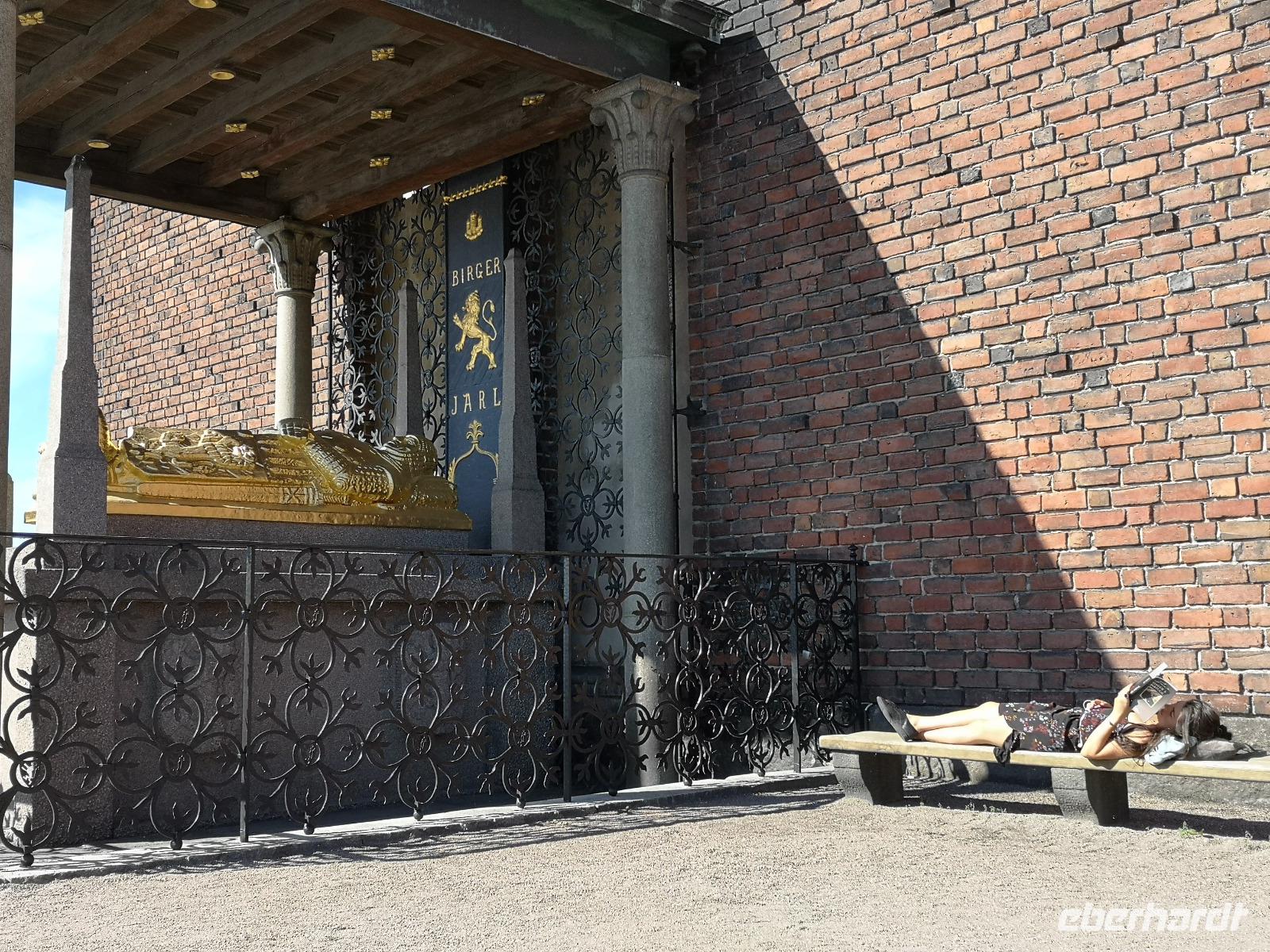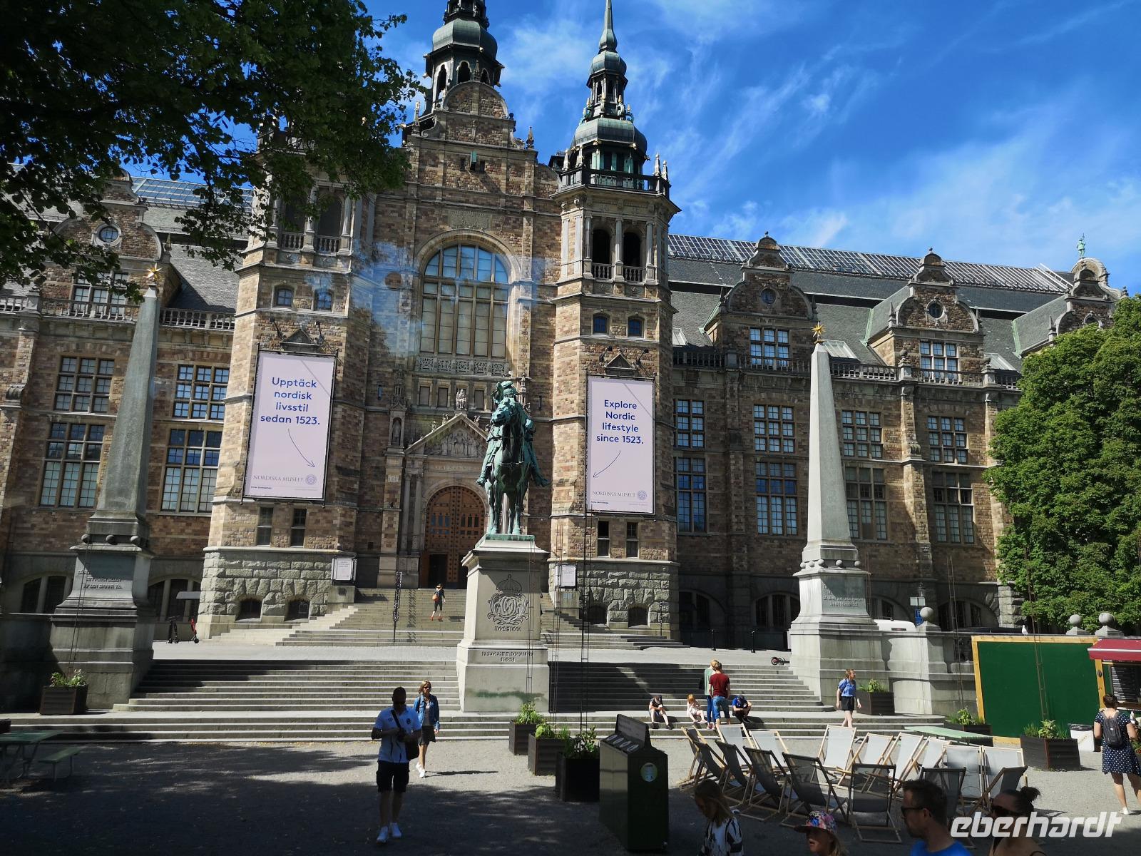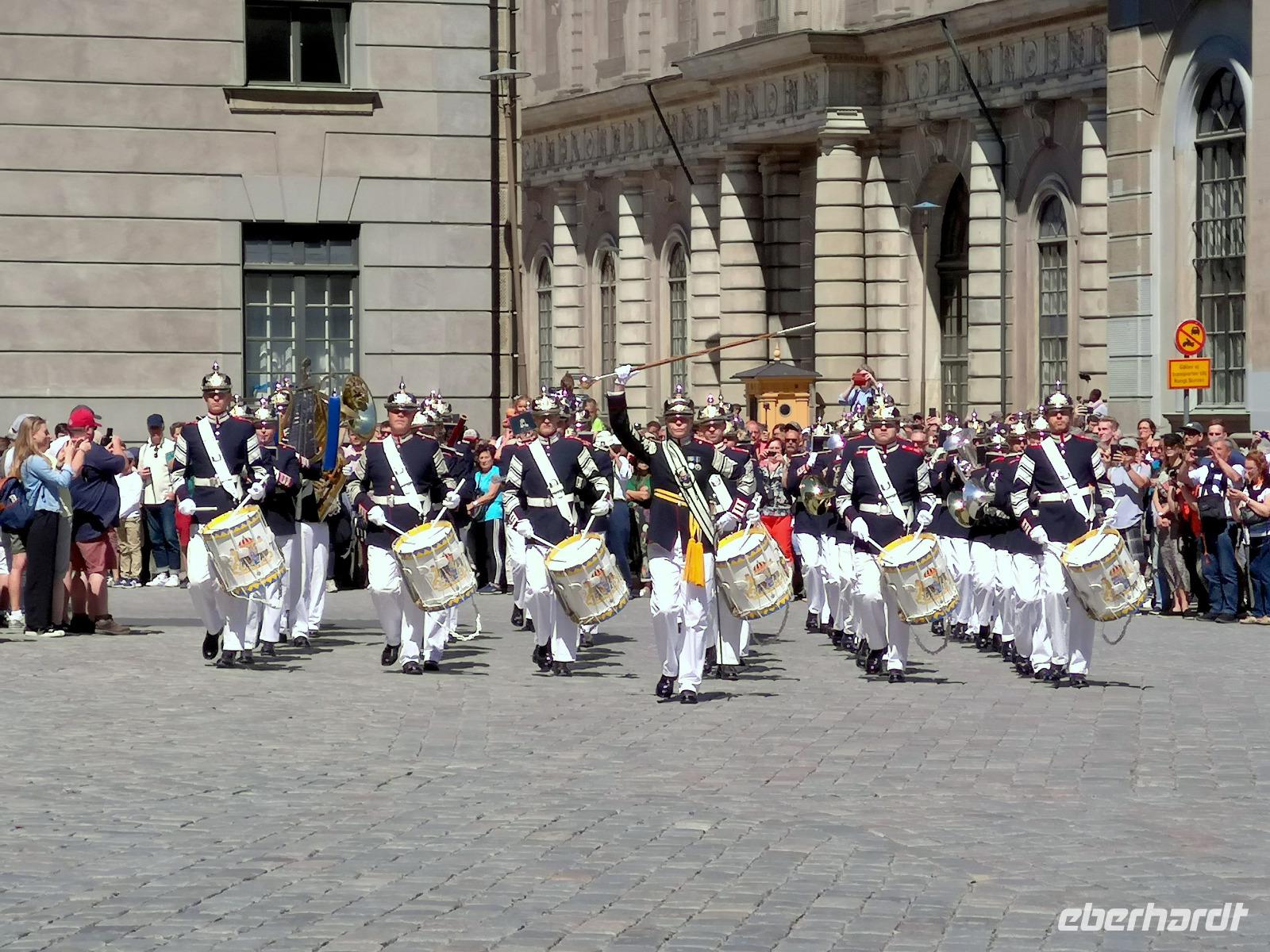 Der heutige Mittsommerabend ist Nationalfeiertag und dementsprechend wird allerorten gefeiert. Aber bevor wir uns unter das Feiervolk mischen, steht erst noch eine geführte Stadtrundfahrt auf dem Programm, beginnend am Stadshuset. Das etwa 100 Jahre alte Rathaus liegt am südöstlichen Spitz der Insel Kungsholmen am Riddarfjärden . Da hier alle Stadtrundfahrten beginnen, ist es entsprechend voll, und man trifft Touristen aus aller Welt. Am schönen Aussichtspunkt „Fjällgatan" halten wir 15 Minuten. Von hier blickt man über die ganze Stadt; besonders gut erkennt man -über das Fotomuseum hinweg- die Altstadt (Gamla Stan) linkerhand und den „Tiergarten" (Djurgarden) rechts, sowie rechts die nach Stockholm einfahrenden Kreuzfahrtschiffe. Nach der Stadtrundfahrt haben wir noch eine Stunde Freizeit im Zentrum, und u.a. Gelegenheit, den Wachwechsel am Schloss zu beobachten. Dann bringt uns der Bus zum Freilichtmuseum Skansen, wo um 14:00 die Mittsommer- Feierlichkeiten mit dem Aufstellen der Mittsommerstange beginnen.