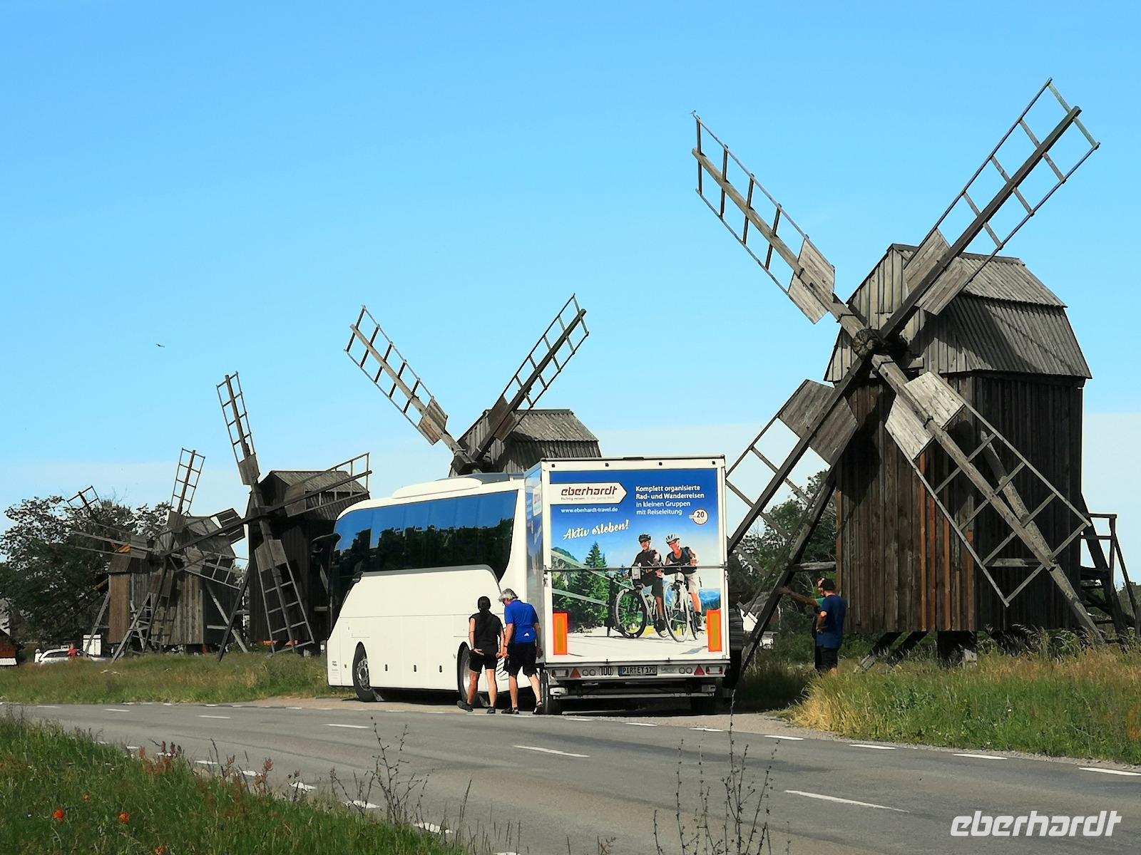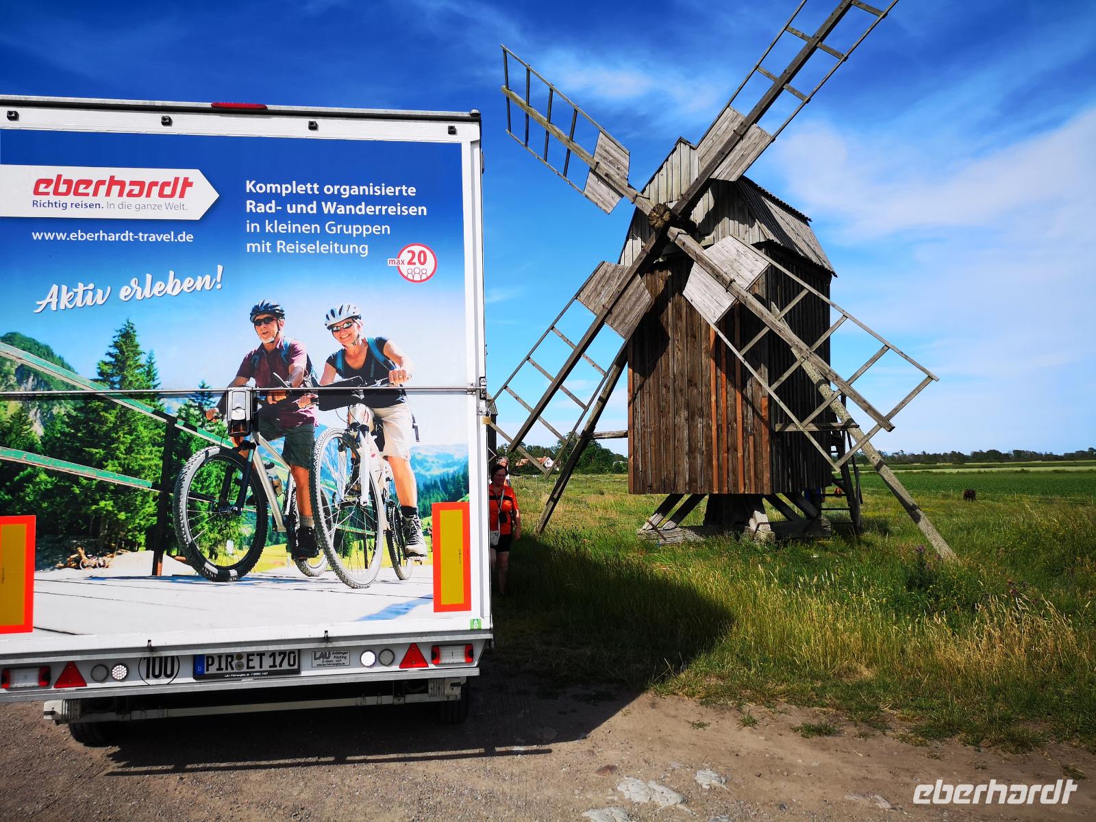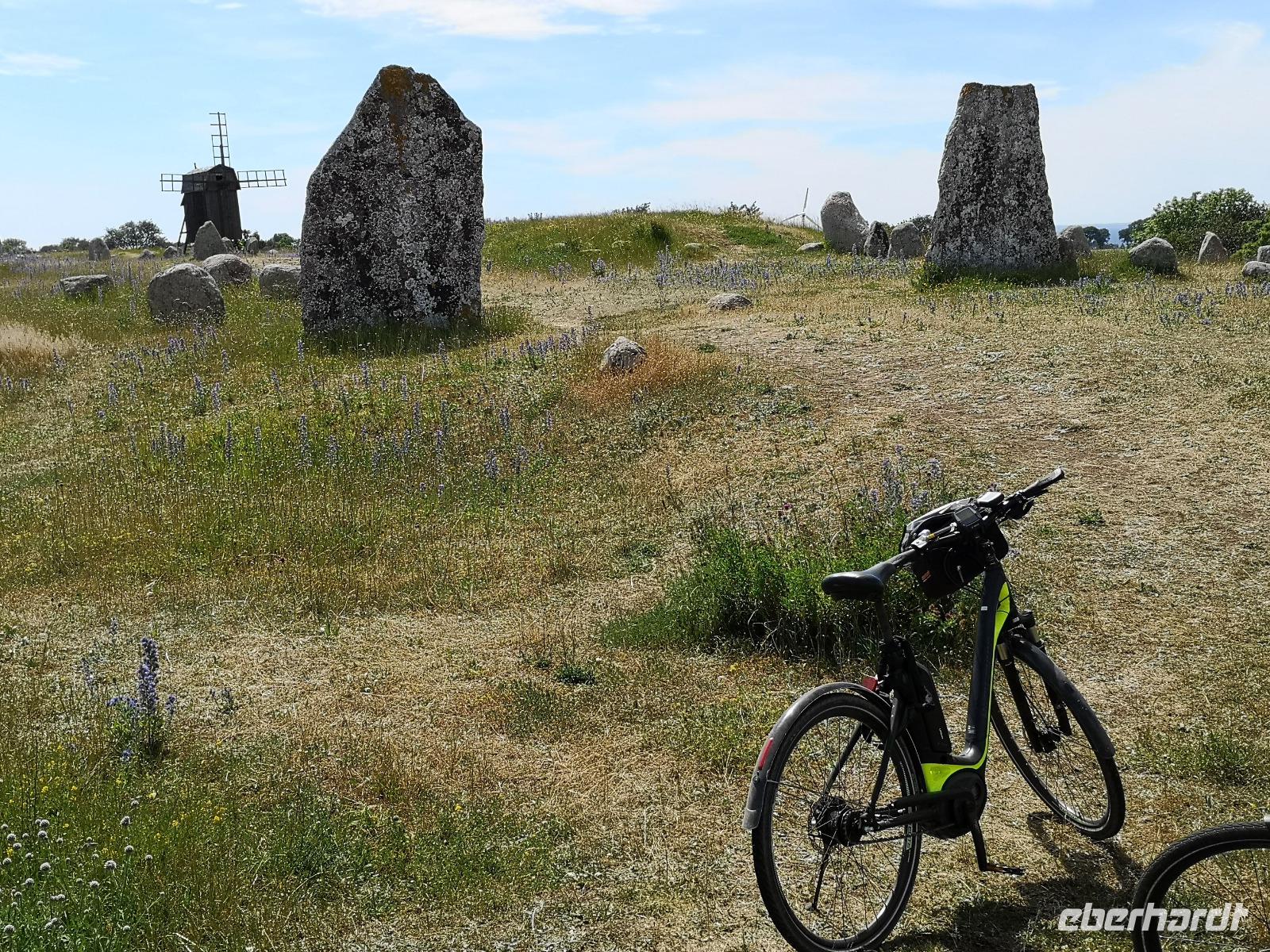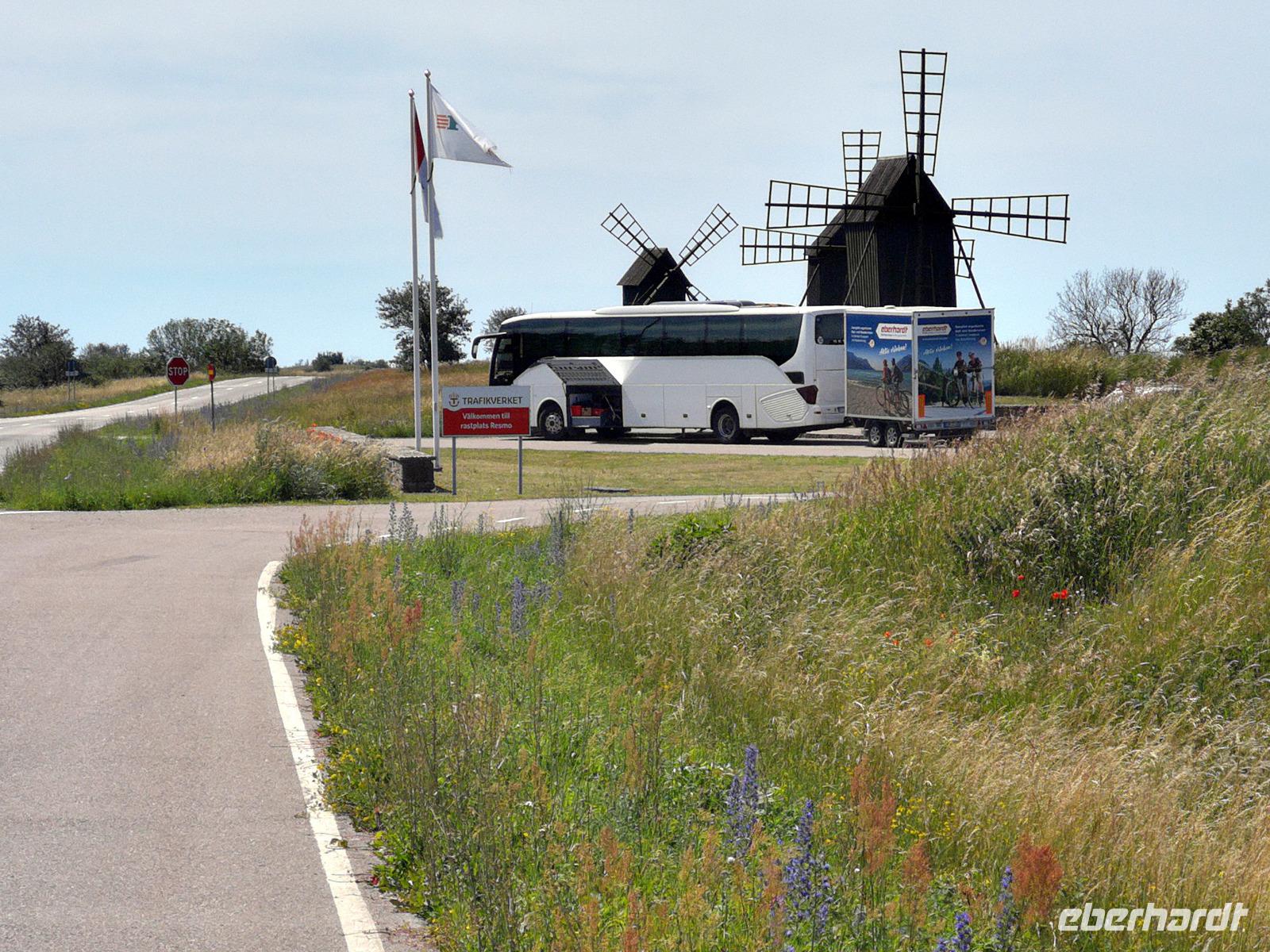 Wir kommen vorbei am „Gräberfeld Gettlinge", das trotz der bisherigen Forschungsergebnisse immer noch viele Rätsel aufgibt. Nur noch wenige Kilometer bis Hellby, wo die Räder wieder in den Anhänger geladen werden für die Weiterfahrt mit dem Bus. Auf der Strecke zur Sommerresidenz der königlichen schwedischen Familie halten wir nochmals an einem der Wahrzeichen Ölands, den Windmühlen von Lerkaka. Der Rückweg ist derselbe wie der Hinweg; die einzige Verbindung ist die Ölandbrücke. geht es zurück zum Hotel nach Kalmar, wo unser Abendessen heute schon um 19:00 serviert werden kann.