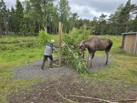 So nun aber gingen wir in das normale Tagesprogramm über, wir besuchen nun den Elchpark in Kosta und freuen uns schon diese großen Tiere von der Nähe aus zu beobachten. Da das Wetter so kalt und feucht ist scheint es, dass sich die Elche ungewöhnlich wohlfühlen. Sie waren sehr aktiv und zeigten sich nahe an den Futterstellen und wir hatten Gelegenheit wunderschöne Fotoaufnahmen von den Tieren zu machen. Besonders haben uns es die neugeborenen Zwillinge der Elchkuh Anna angetan, die ersten 6 Wochen alt sind und schon sehr sicher in der Nähe ihrer Mutter sich im Gehege bewegen. Trotz all der Sympathie mit den Elchen können wir der Versuchung nicht widerstehen eine Elchwurst zu kosten. Wir gehen gemeinsam zum vorbereiteten Barbecue und jeder grillt sich seine Wurst selbst und gemeinsam verspeisen wir dann diese leckere Besonderheit.