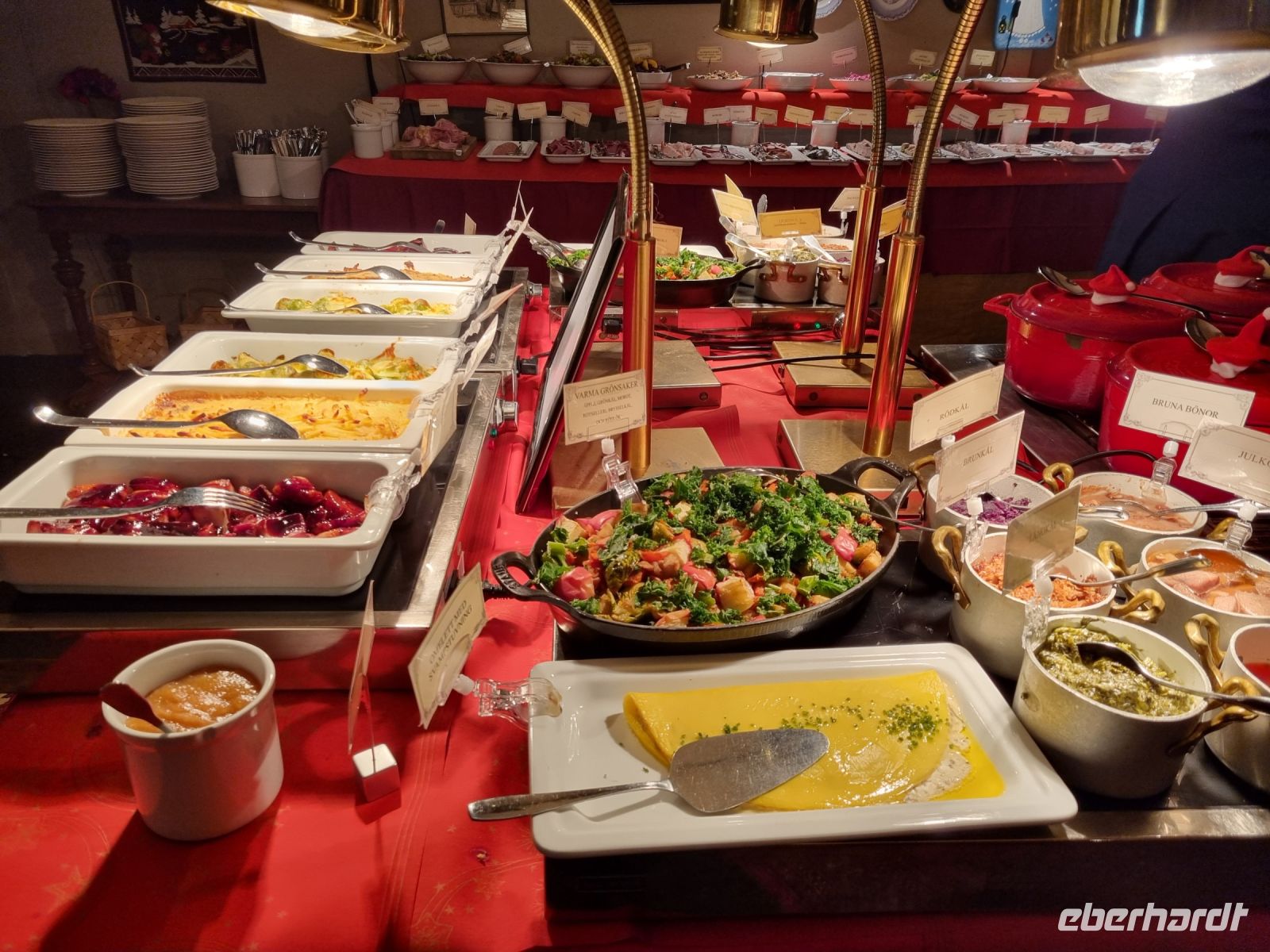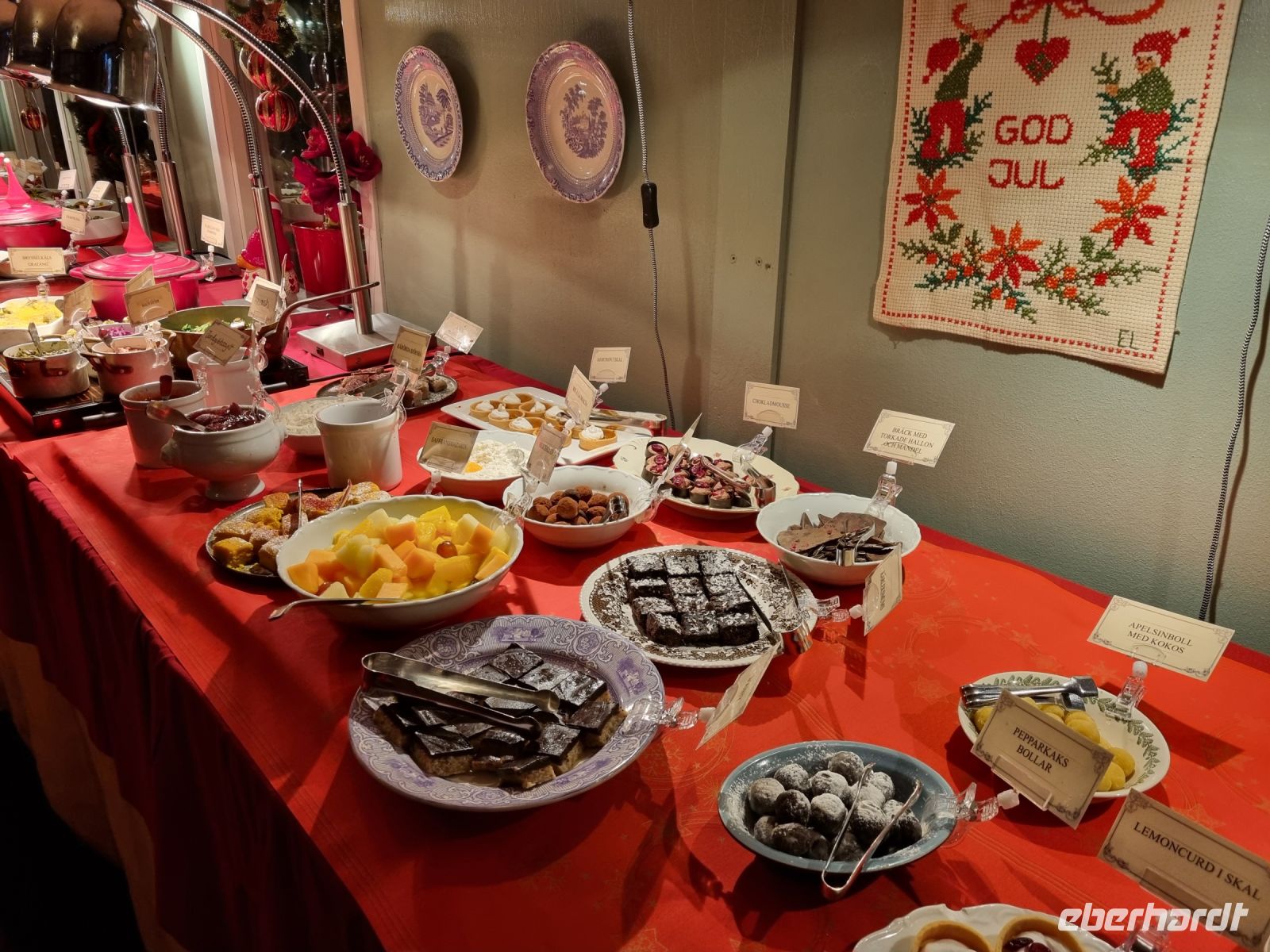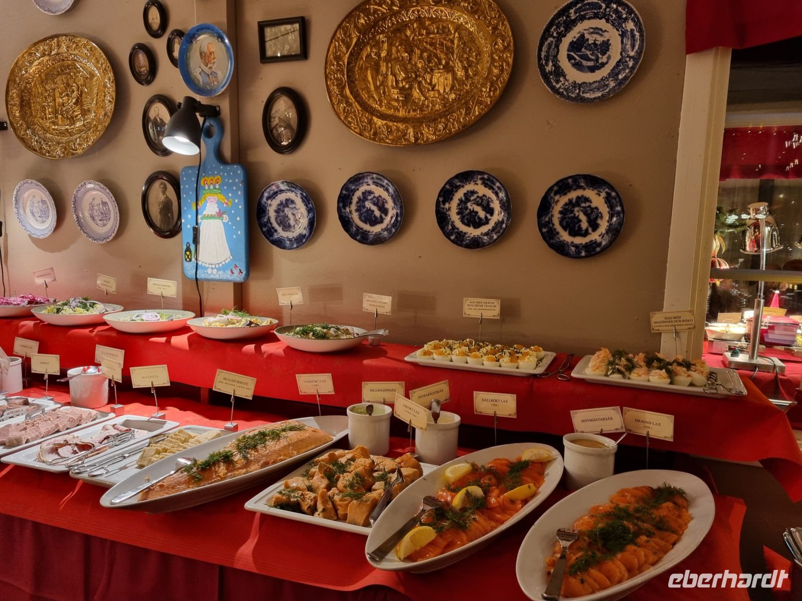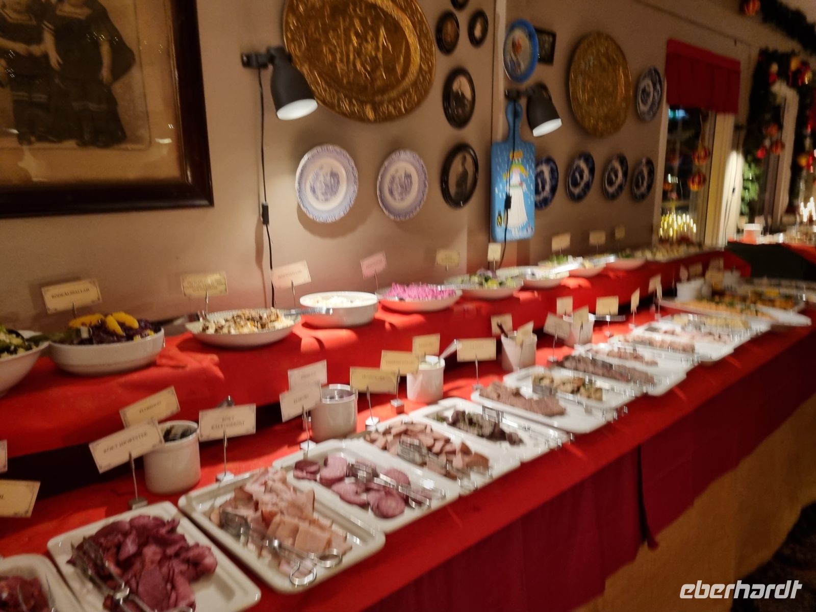 Mit dem Schiff oder auf Wunsch auch mit dem Bus ging es dann zurück nach Stockholm. Die Tram Nr. 7 brachte uns zur Haltestelle Nordisches Museum/Vasamuseum. Ein kurzer Spaziergang, und schon waren wir am bekannten Restaurant „Ulla Winbladh“, wo ein typisch schwedisches Weihnachtsessen auf uns wartete. Dieses Weihnachtsessen, ein großes Buffet, nennt man hier Julbord. Es hat in Schweden eine lange Tradition. Alle Räume waren sehr schön weihnachtlich dekoriert. Das reichhaltige Buffet war eine Augenweide. Und wir probierten möglichst viele der erlesenen Leckerbissen, auch Janssons Versuchung, einen schmackhaften Auflauf aus Kartoffeln.
