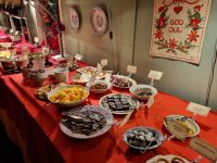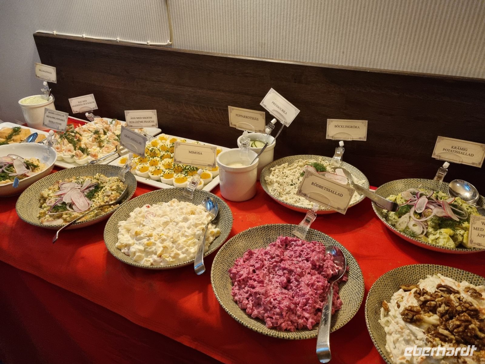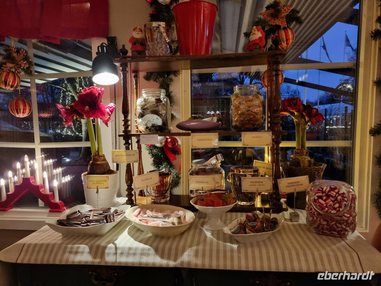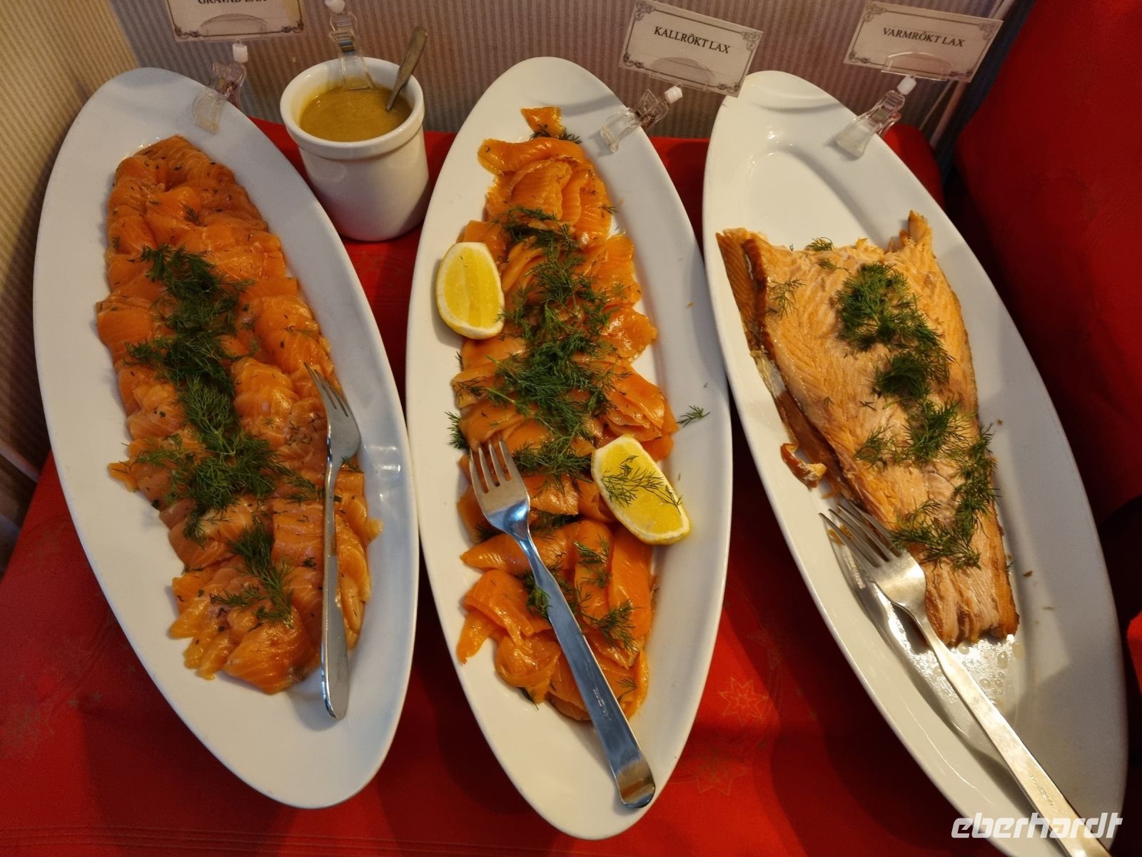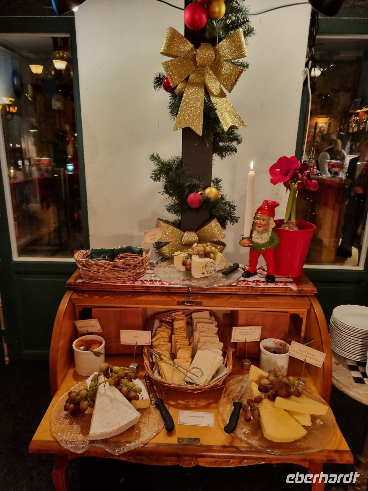 Mit dem Schiff oder auf Wunsch auch mit dem Bus ging es dann zurück nach Stockholm. Die Tram Nr. 7 brachte uns zur Haltestelle Nordisches Museum/Vasamuseum. Ein kurzer Spaziergang, und schon waren wir am bekannten Restaurant „Ulla Winbladh“, wo ein typisch schwedisches Weihnachtsessen auf uns wartete. Dieses Weihnachtsessen, ein großes Buffet, nennt man hier Julbord. Es hat in Schweden eine lange Tradition. Alle Räume waren sehr schön weihnachtlich dekoriert. Das reichhaltige Buffet war eine Augenweide. Und wir probierten möglichst viele der erlesenen Leckerbissen, auch Janssons Versuchung, einen schmackhaften Auflauf aus Kartoffeln.