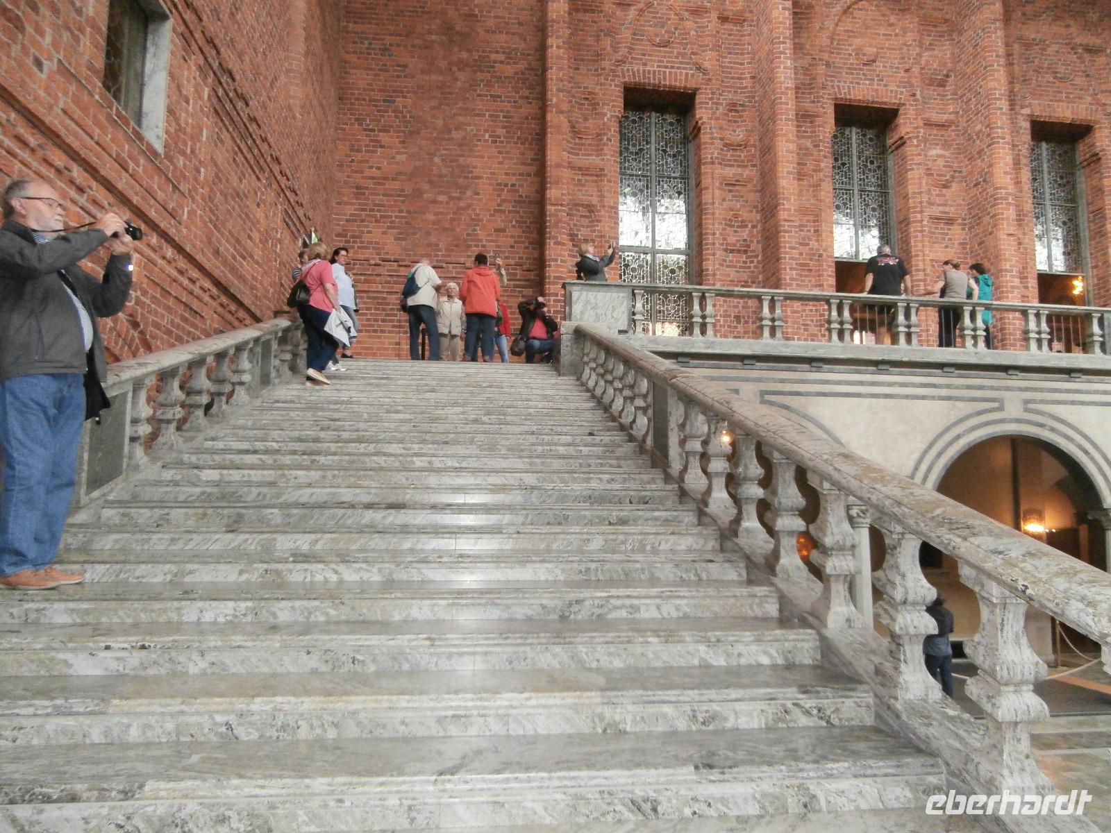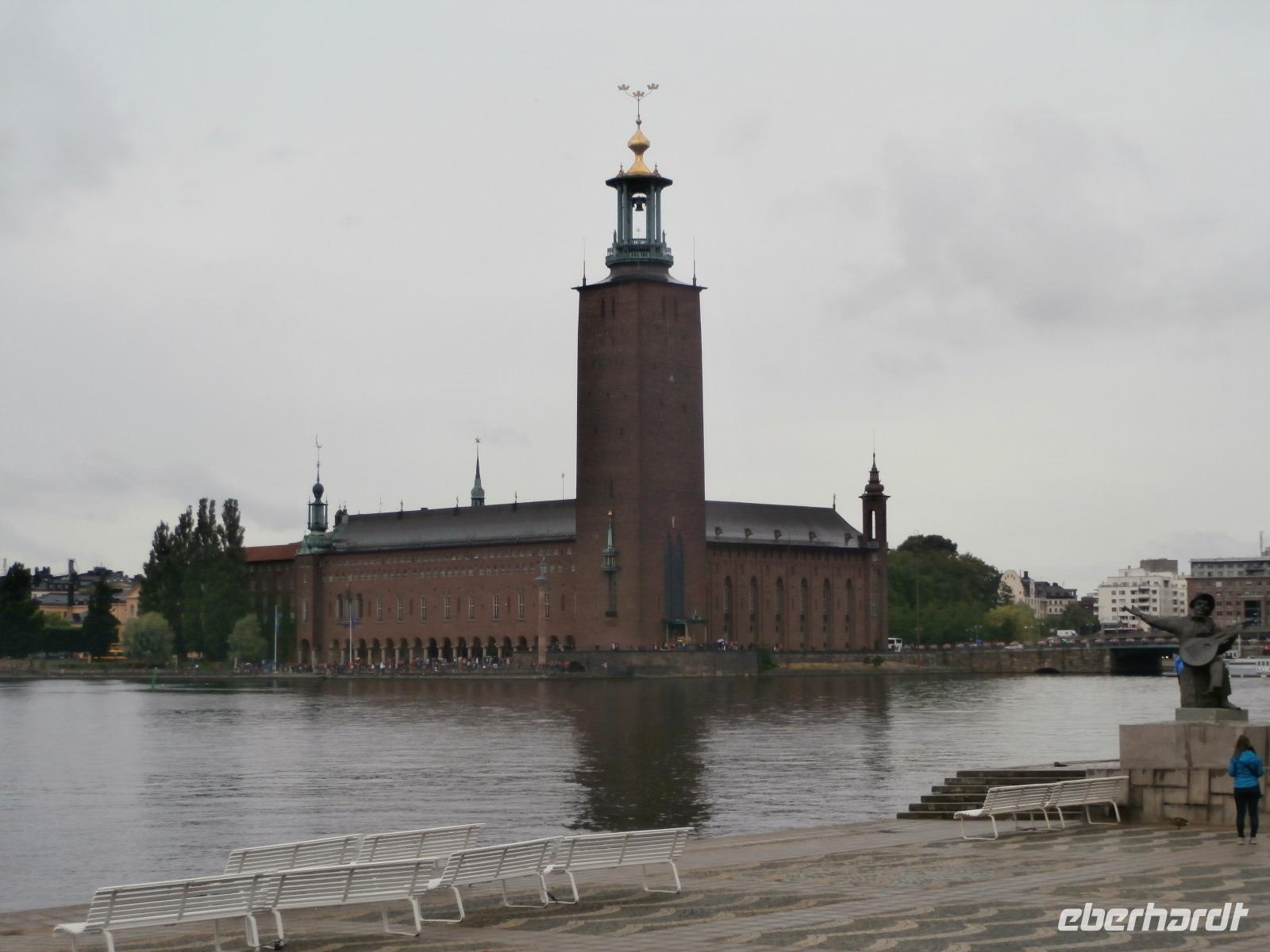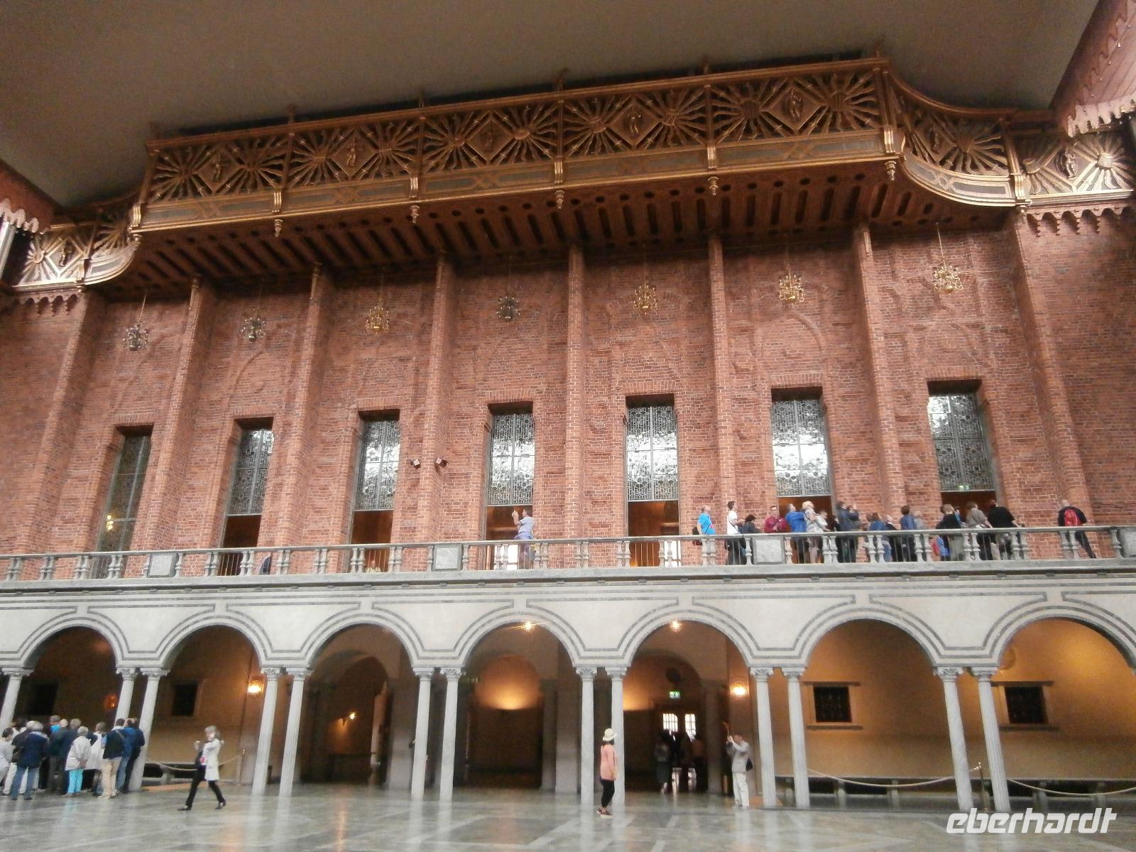 Zur Stadtrundfahrt mit dem Kleinbus werden wir von Renata, unserer Reiseleiterin und einem netten Fahrer, am Hotel abgeholt. Als ersten Halt haben wir die schöne Aussicht über die Stadt oberhalb vom Wickinger Terminal. Es fängt an zu regnen, aber wir sitzen im Bus und erfahren während der Rundfahrt viel Interesanntes zur Stadtgeschichte, über die Königshäuser, die Mentalität der Schweden, das Leben der Menschen in Stockholm. Am Stadshuset machen wir Station und besichtigen gemeinsam dieses fantastische Haus. Renata erklärt ganz viel und wir sprechen auch über Politik, Abgeordnete und die Regierung.