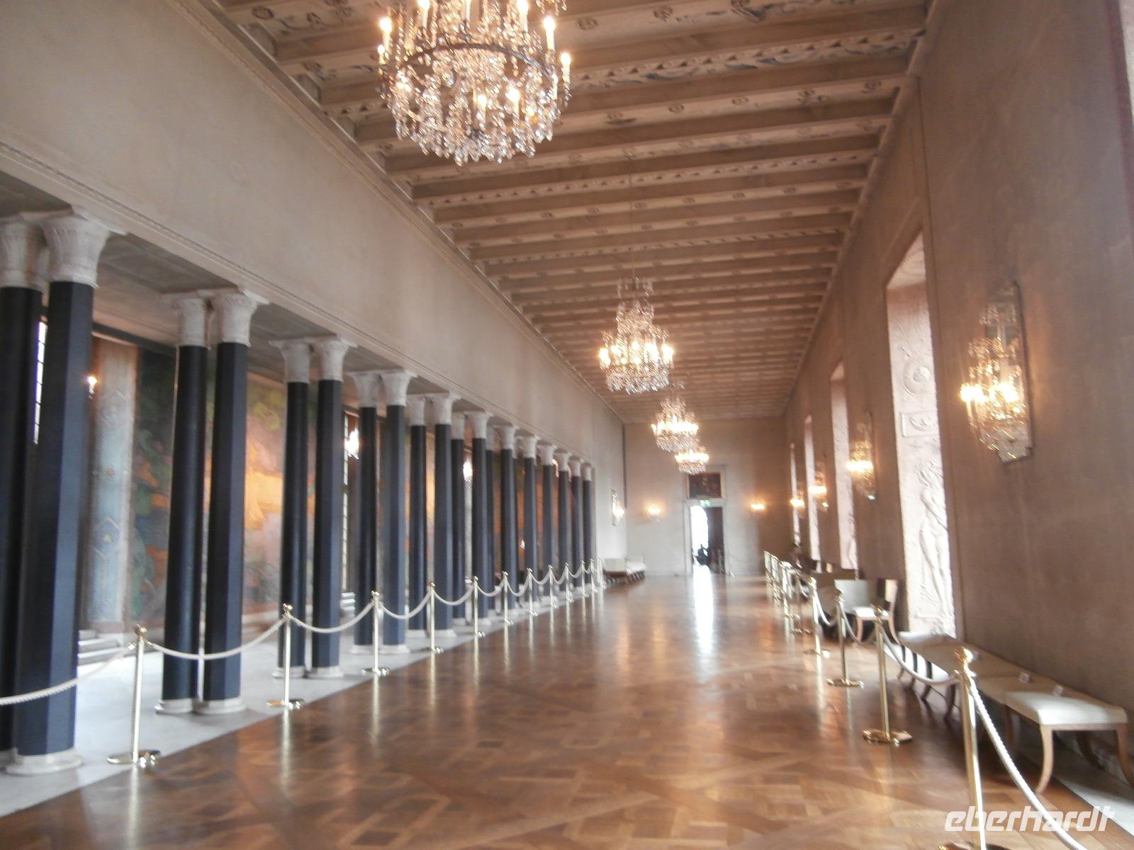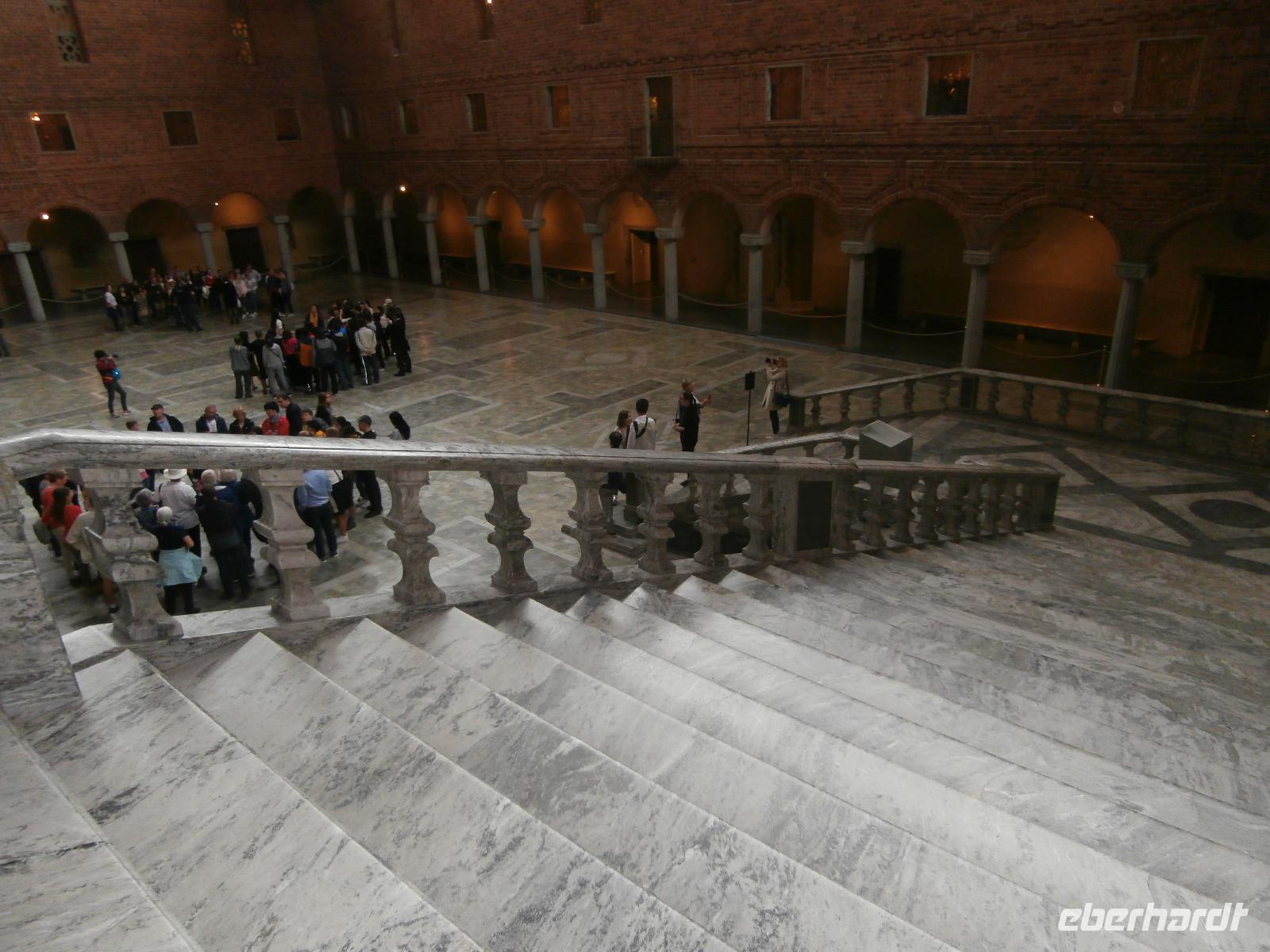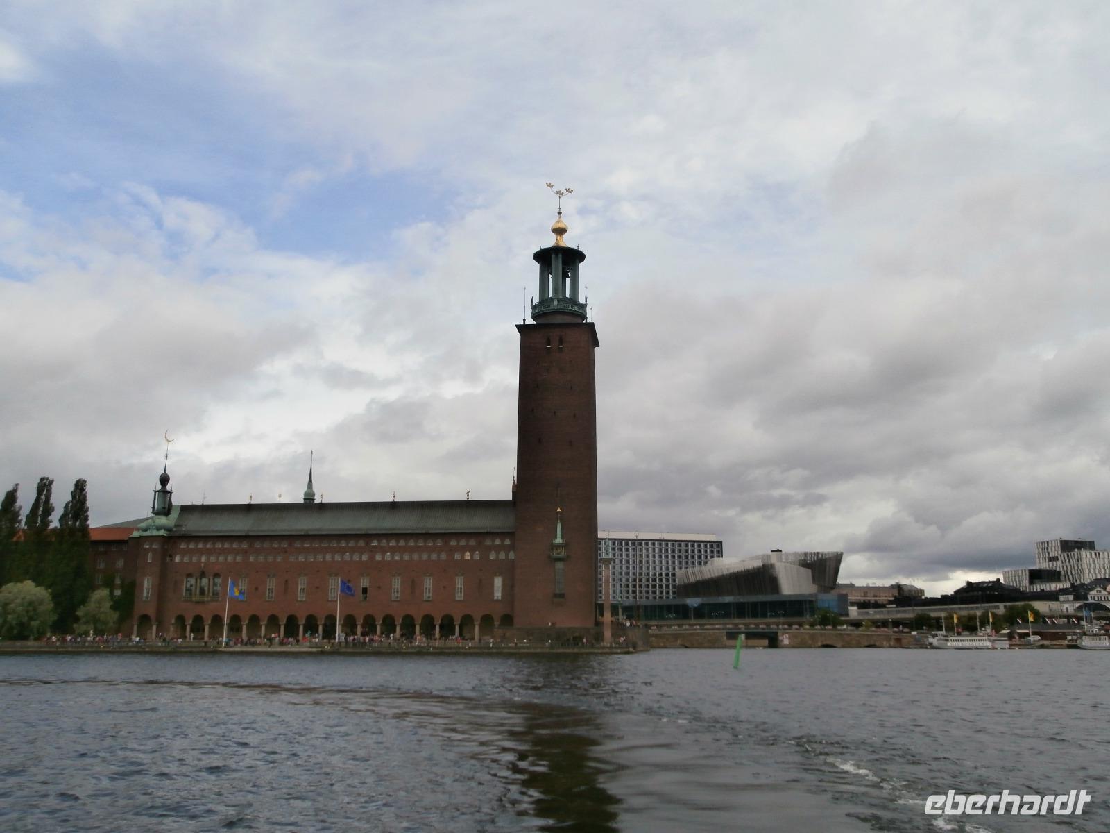 Zur Stadtrundfahrt mit dem Kleinbus werden wir von Renata, unserer Reiseleiterin und einem netten Fahrer, am Hotel abgeholt. Als ersten Halt haben wir die schöne Aussicht über die Stadt oberhalb vom Wickinger Terminal. Es fängt an zu regnen, aber wir sitzen im Bus und erfahren während der Rundfahrt viel Interesanntes zur Stadtgeschichte, über die Königshäuser, die Mentalität der Schweden, das Leben der Menschen in Stockholm. Am Stadshuset machen wir Station und besichtigen gemeinsam dieses fantastische Haus. Renata erklärt ganz viel und wir sprechen auch über Politik, Abgeordnete und die Regierung.