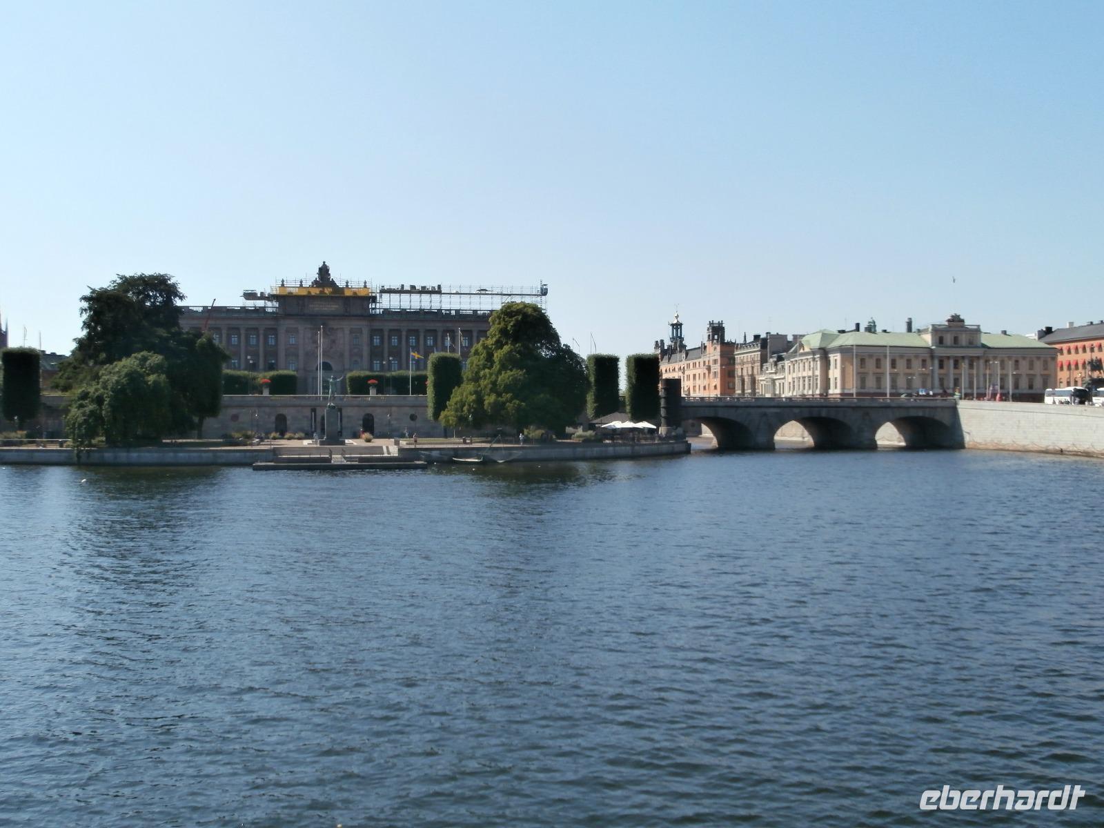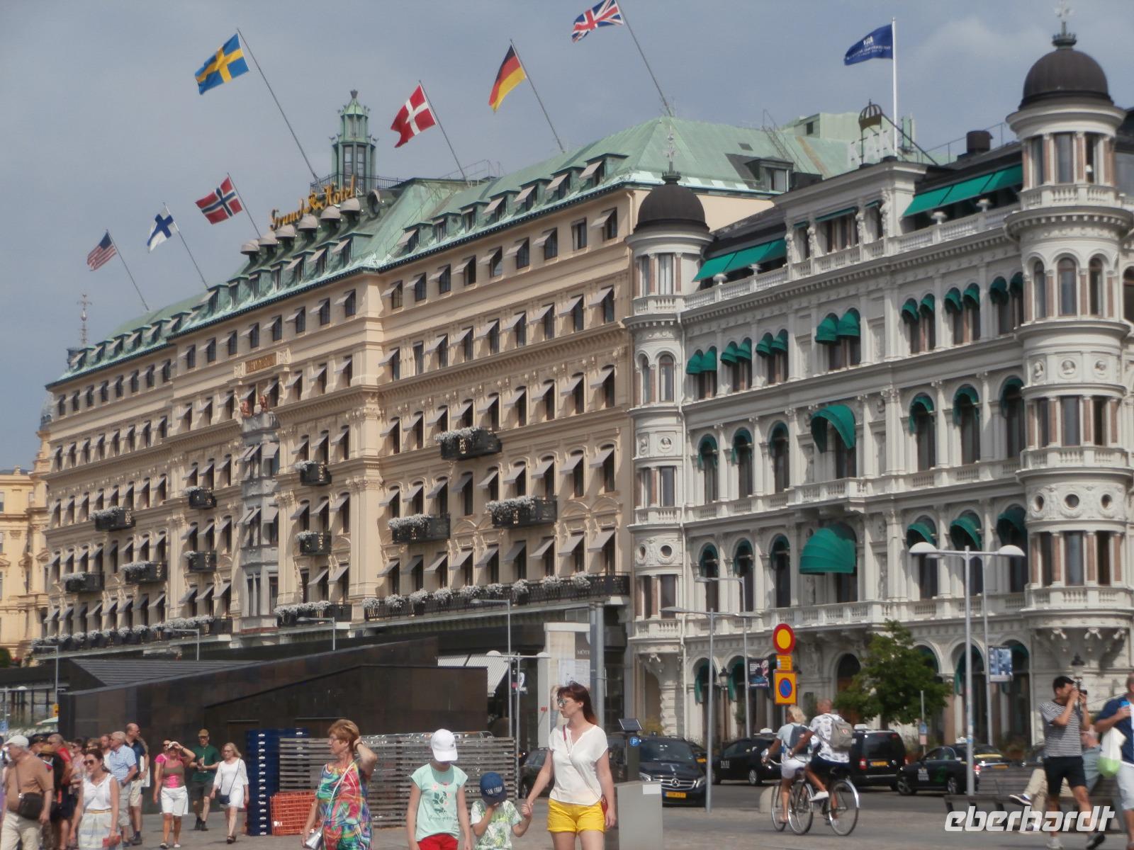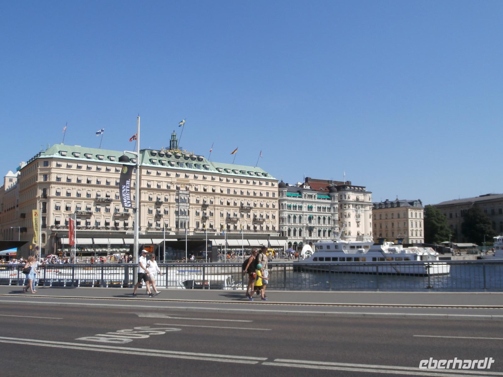 Und wieder ein Tag mit hohen Temperaturen, es wird uns allen bald zu viel. Heute geht es mit dem Schiff über den Mälarensee hinaus nach Drottningholm, zur historischen Schlossanlage aus dem 18. Jahrhundert. König Carl XVI. Gustav und Silvia treffen wir nicht im Schloss von Drottningholm an. Bei einem Rundgang betrachten wir uns die freigegebenen Räume, das Schloss ist der Wohnsitz des schwedischen Königspaares mit prunkvollen Paradezimmern, die sind ganzjährig geöffnet. Gegen 12 Uhr findet die Wachablösung statt, schön mit zu erleben. Besonders beeindruckend ist das Schlosstheater, welches wir uns bei einer sehr schönen Führung in deutscher Sprache ansehen. Es werden im Sommer immer noch Stücke und Opern aufgeführt, zum Einsatz kommt die uralte Theatertechnik. Zum gemeinsamen Spaziergang durch die herrlichen Parkanlagen bis zum Chinesischen Lustschlösschen brechen wir nach der Führung im Schlosstheater auf. Die Rückfahrt nach Stockholm mit dem Schiff ist angenehm und nach einer Stunde legen wir wieder am Rathaus an. Wir spazieren gemeinsam bis zur nächsten U Bahnstation, mit der Bahn fahren wir bis zum Kungsträdgarden. Nach etwas Freizeit zum Verweilen oder Shoppen, fahren wir mit der Straßenbahn Nr: 7 auf die Insel Djurgarden. Im Restaurant "Ulla Winbladh" treffen wir uns zum Abschiedsessen, heute wird es von Eberhardt Travel wieder organisiert. Wir sind begeistert vom Restaurant, tolles Ambiente, schöne Einrichtung und leckere Speisen. Mit dem Boot geht es zum Hotel Elite Marina Tower zurück.
