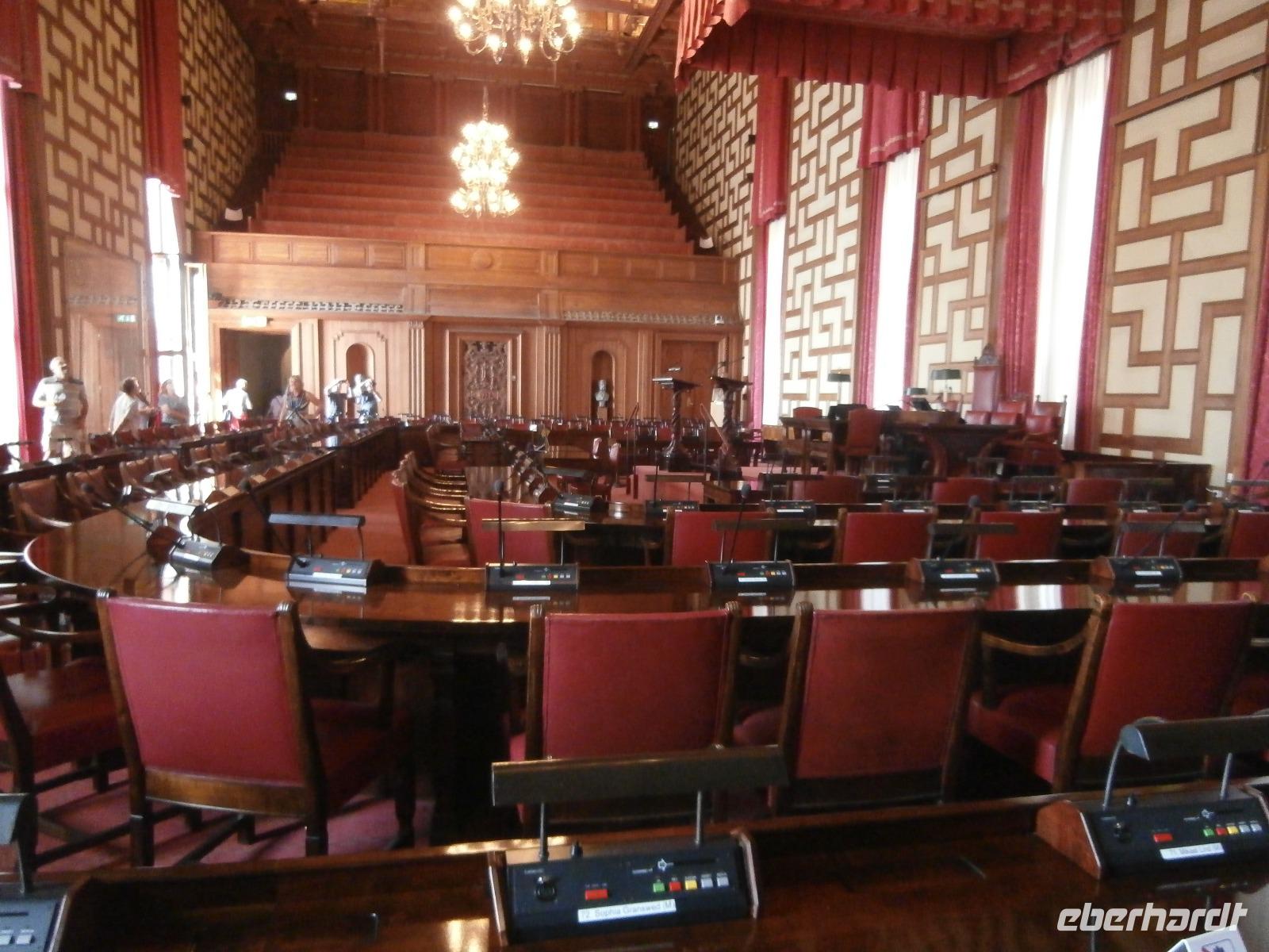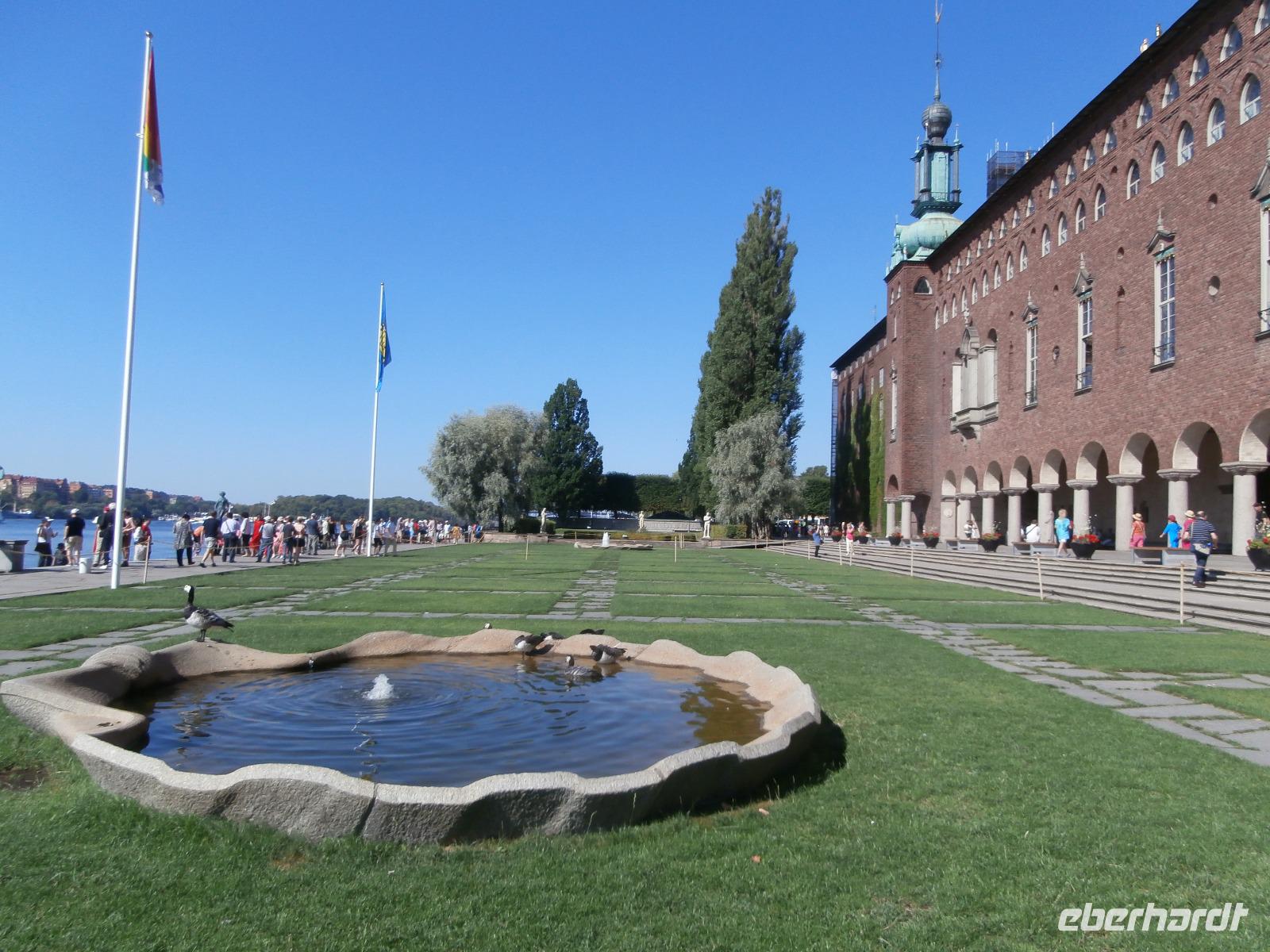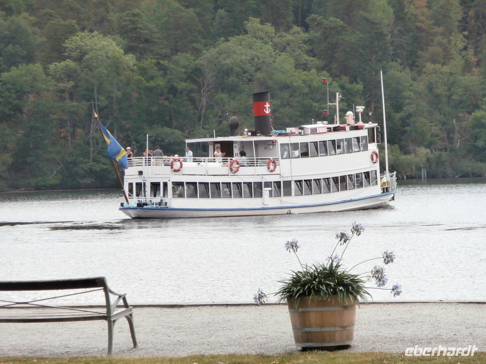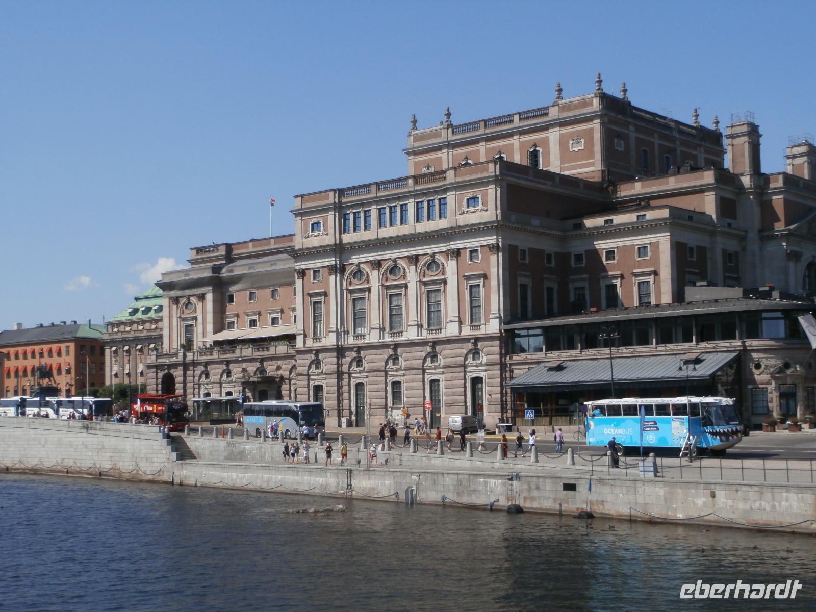 Und wieder ein Tag mit hohen Temperaturen, es wird uns allen bald zu viel. Heute geht es mit dem Schiff über den Mälarensee hinaus nach Drottningholm, zur historischen Schlossanlage aus dem 18. Jahrhundert. König Carl XVI. Gustav und Silvia treffen wir nicht im Schloss von Drottningholm an. Bei einem Rundgang betrachten wir uns die freigegebenen Räume, das Schloss ist der Wohnsitz des schwedischen Königspaares mit prunkvollen Paradezimmern, die sind ganzjährig geöffnet. Gegen 12 Uhr findet die Wachablösung statt, schön mit zu erleben. Besonders beeindruckend ist das Schlosstheater, welches wir uns bei einer sehr schönen Führung in deutscher Sprache ansehen. Es werden im Sommer immer noch Stücke und Opern aufgeführt, zum Einsatz kommt die uralte Theatertechnik. Zum gemeinsamen Spaziergang durch die herrlichen Parkanlagen bis zum Chinesischen Lustschlösschen brechen wir nach der Führung im Schlosstheater auf. Die Rückfahrt nach Stockholm mit dem Schiff ist angenehm und nach einer Stunde legen wir wieder am Rathaus an. Wir spazieren gemeinsam bis zur nächsten U Bahnstation, mit der Bahn fahren wir bis zum Kungsträdgarden. Nach etwas Freizeit zum Verweilen oder Shoppen, fahren wir mit der Straßenbahn Nr: 7 auf die Insel Djurgarden. Im Restaurant "Ulla Winbladh" treffen wir uns zum Abschiedsessen, heute wird es von Eberhardt Travel wieder organisiert. Wir sind begeistert vom Restaurant, tolles Ambiente, schöne Einrichtung und leckere Speisen. Mit dem Boot geht es zum Hotel Elite Marina Tower zurück.