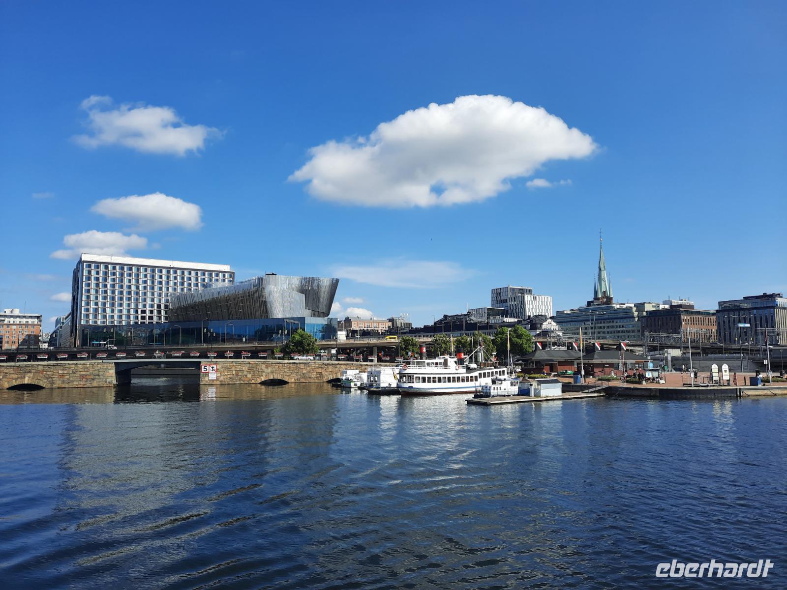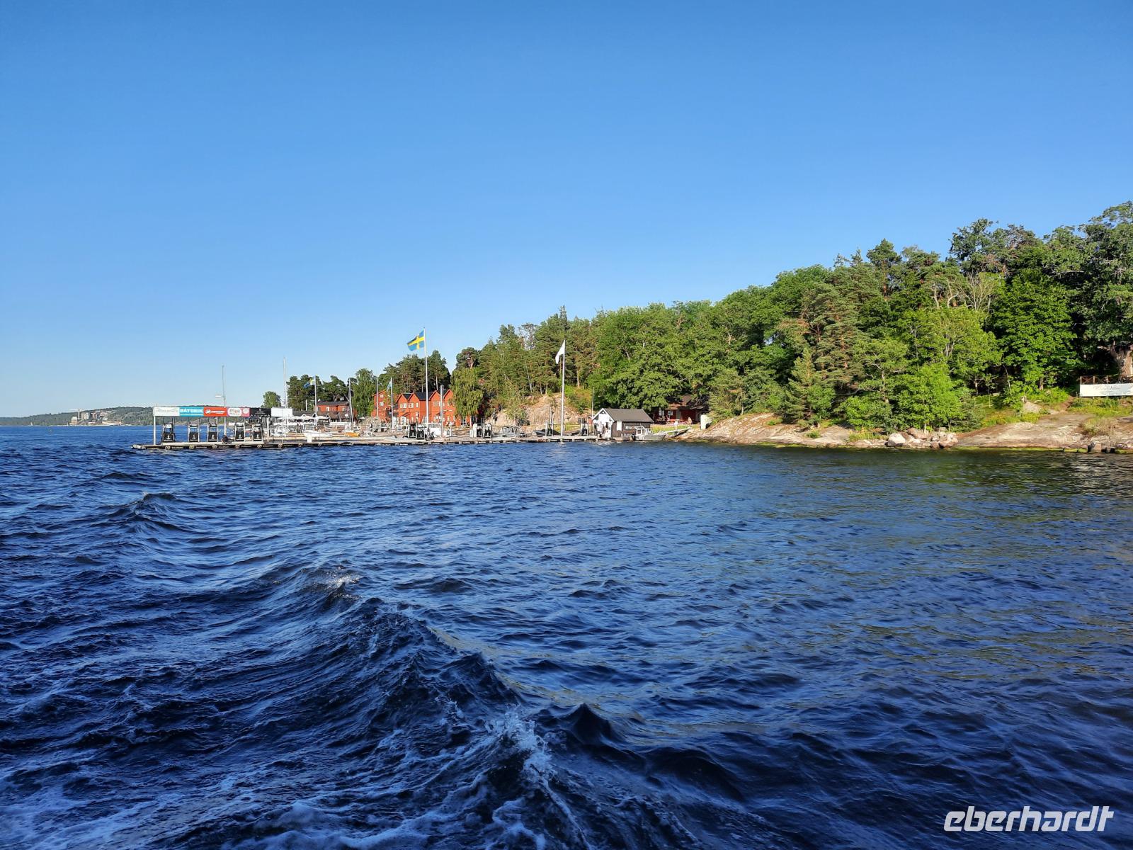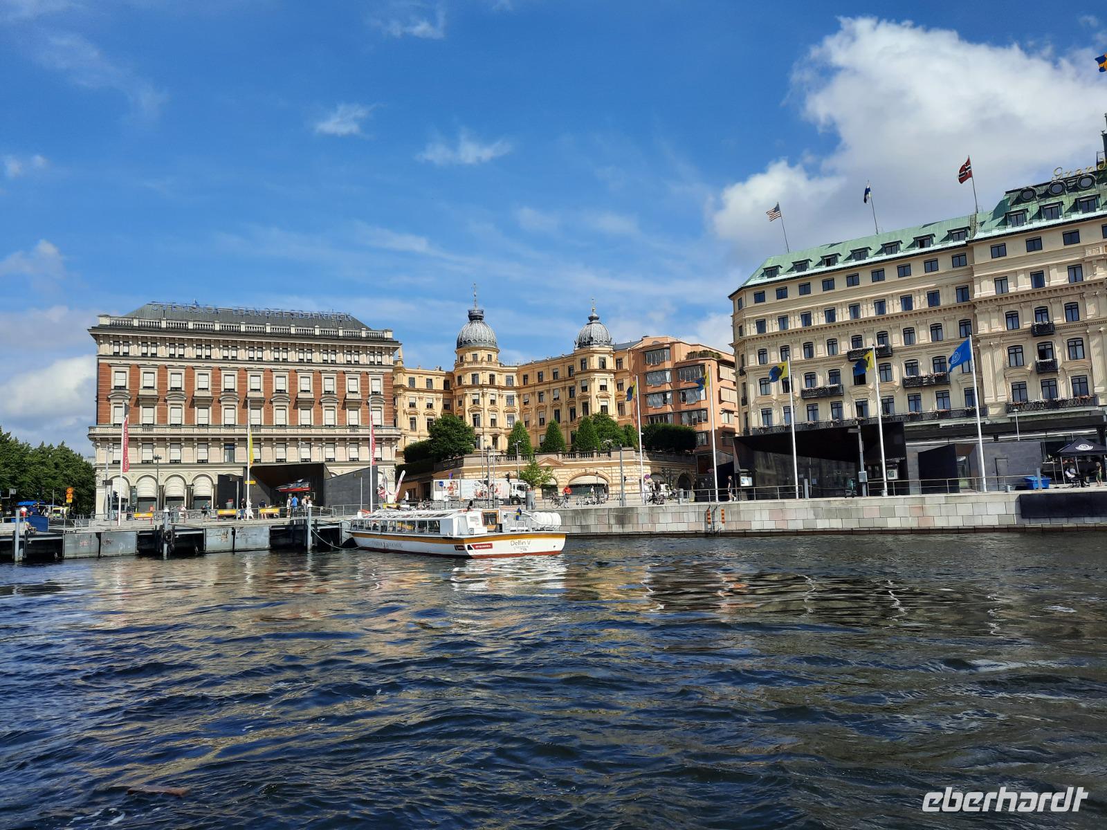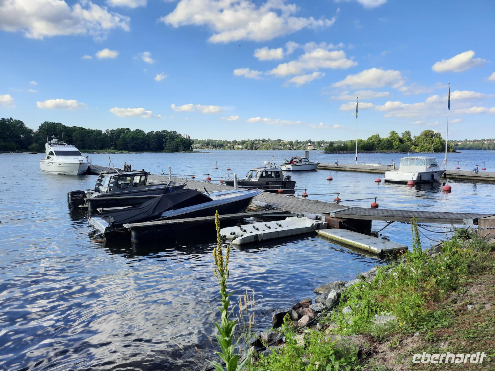 Gegen 9.30 Uhr kam ich mit 3 Reisegästen am neuen Berliner Flughafen an und dort trafen wir dann auch den Rest unserer kleinen „Reisefamilie". Die erste Aufregung hatten wir bereits hinter uns, denn kurz vor Berlin gab es eine Vollsperrung der Autobahn und nichts ging mehr... Zum Glück wandte sich das Blatt zum Guten und wir trafen dennoch pünktlich am Check-in-Schalter der Scandinavian Airlines (SAS) ein. Was wir hier noch nicht wussten - unser Flieger hatte ebenso Verspätung! Mit einer 1-stündigen Verspätung hob unser Flugzeug dann endlich gg. 12 Uhr in den Berliner Himmel ab und mit etwas Rückenwind erreichten wir nach einer Flugzeit von etwas mehr als einer Stunde den nördlich von Stockholm gelegenen Flughafen Arlanda. Hier wurden wir bereits von einem netten Taxifahrer erwartet. Ich kaufte noch zügig im Terminal die Stockholm Travel-Cards, unsere Fahrkarten für die Nutzung der öffentlichen Verkehrsmittel während unseres Stockholm-Aufenthaltes. Mit ihr konnten wir uns dann in den nächsten Tagen per Schiff, Bus, U-Bahn und auch Straßenbahn in der schwedischen Hauptstadt bewegen - sehr praktisch! Nun ging es also mit dem Taxi in die Innenstadt hinein und am frühen Nachmittag trafen wir schließlich im modernen 4-Sterne Elite Hotel Marina Tower, ganz nah am Zentrum gegenüber der Insel Djurgarden gelegen. ein. Wir bezogen unsere Zimmer und wenig später trafen wir uns dann für eine erste gemeinsame Erkundungstour wieder. Zunächst fuhren wir mit einem Linienschiff hinüber zur Insel Djurgarden und spazierten vorbei an einigen Museen, u. a. am Vasa-Museum in Richtung Strandvägen, einer boulevardartigen Prachtstraße im Herzen der Stadt... Anschließend ging es mit dem Linienschiff zum Hotel zurück und so hatten wir zumindest schon heute ein paar schöne erste Eindrücke der Stadt erhaschen können. Eine kurze Pause im Hotel und schon brachen wir zu einem ersten gemeinsamen Abendessen auf. Nur wenige Gehminuten vom Hotel entfernt und in sehr schöner Lage speisten wir im Restaurant „Docklands" im Stadtteil Nacka. Die Lage ist einfach herrlich, am Wasser außerhalb des Zentrums und auf dem Weg zu den Schären. Wir konnten sogar Plätze auf der Terrasse ergattern und hatten an diesem lauen Sommerabend tolle Blicke auf das Wasser, die umliegende Natur und große Schiffe, die zeitweilig an uns vorbeifuhren. Bei einem schmackhaften Abendessen lernten wir uns näher kennen, ehe wir müde in unsere Betten fielen, denn der Anreisetag begann sehr früh und ein langer Tag war nun zu Ende.