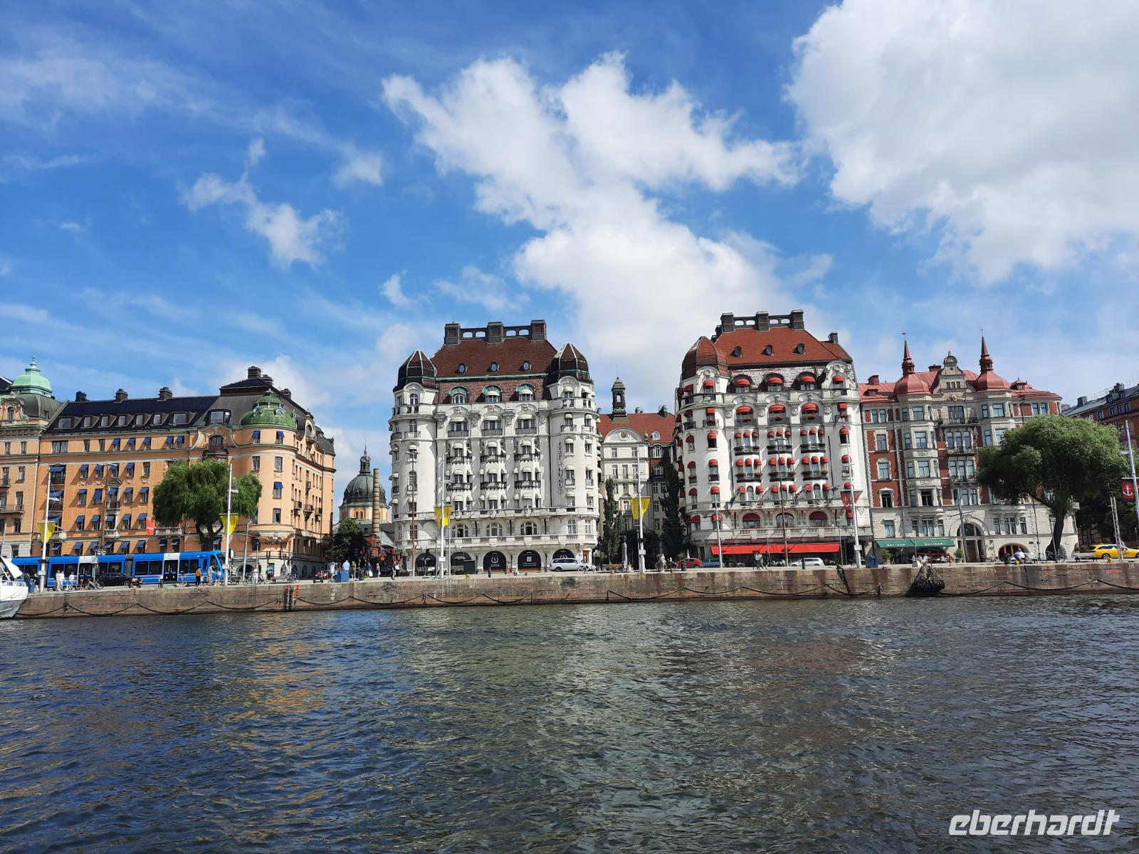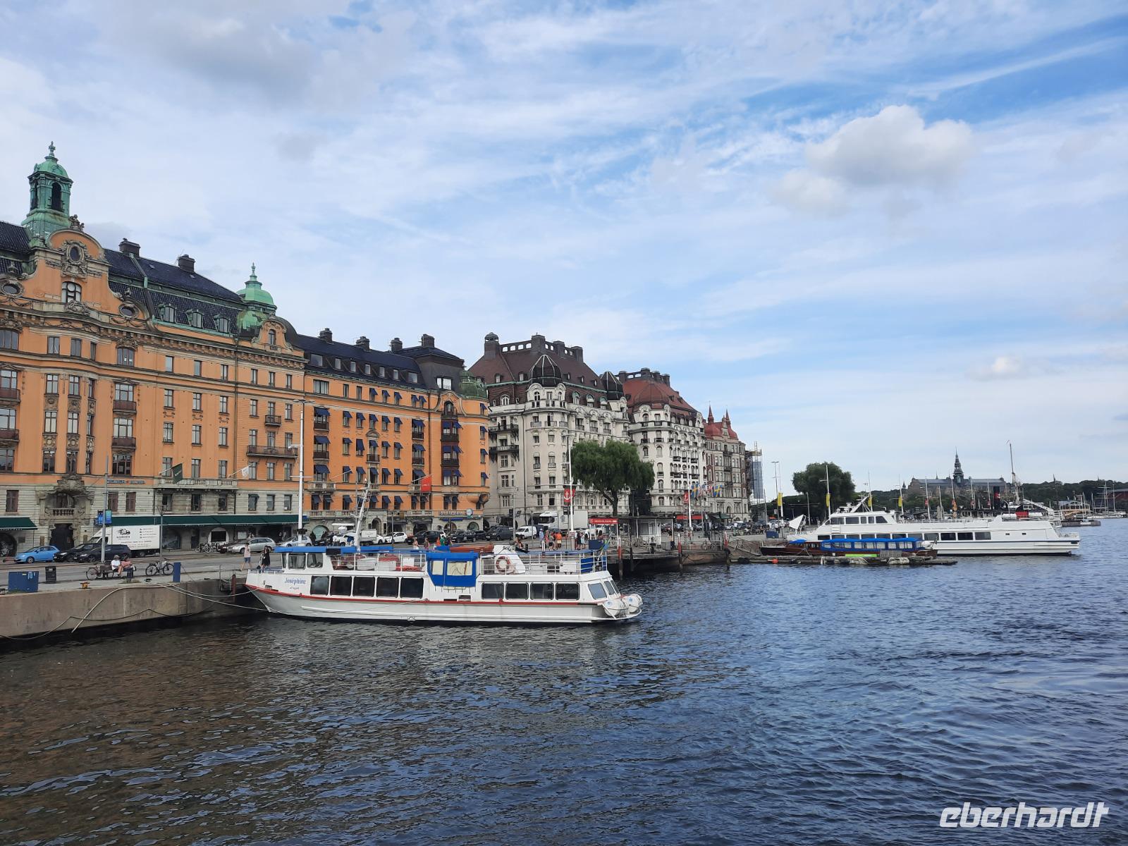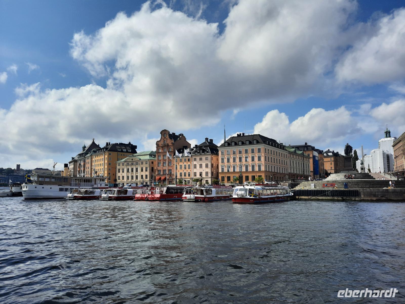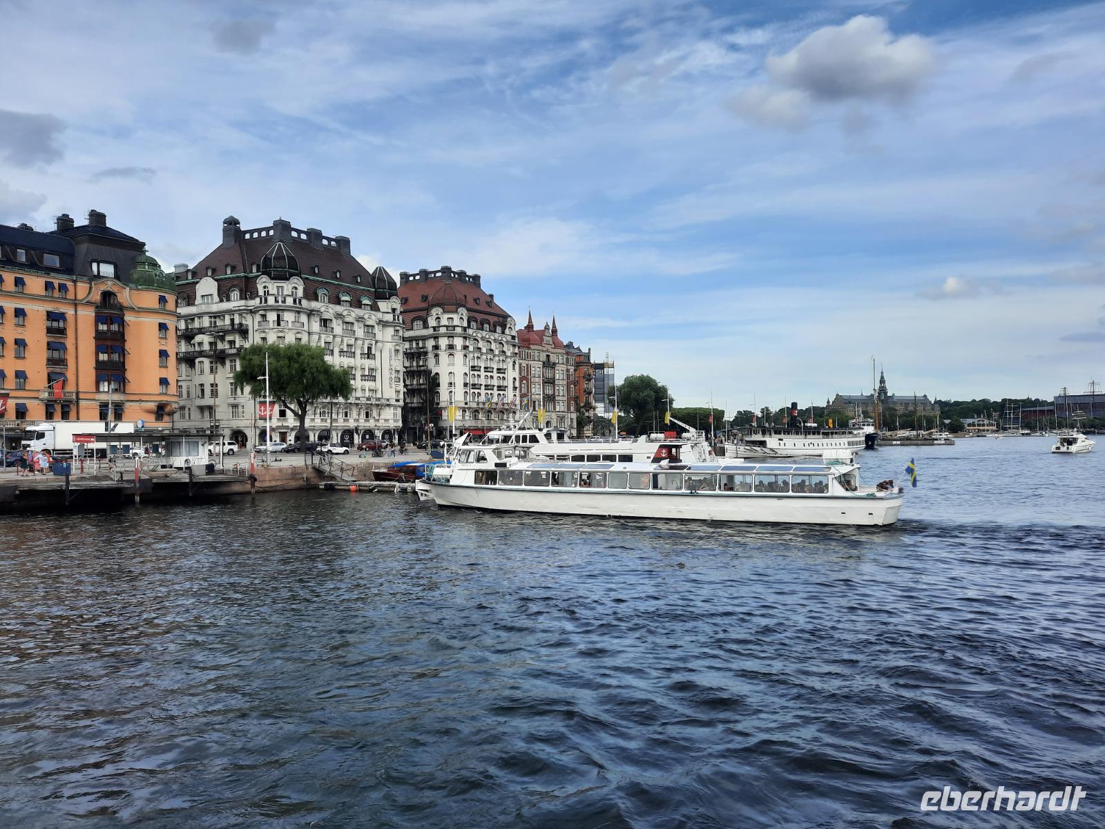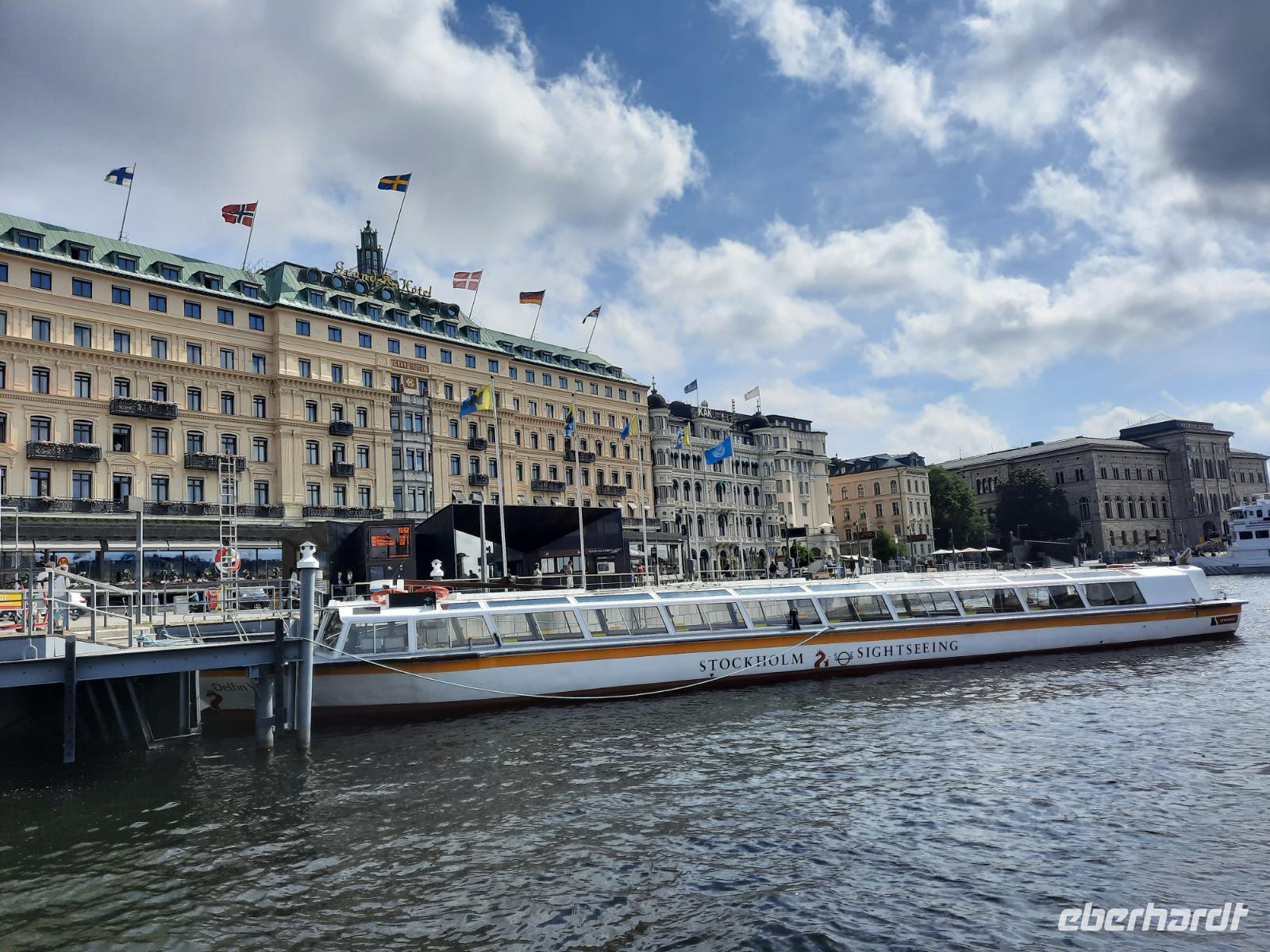 Gegen 9.30 Uhr kam ich mit 3 Reisegästen am neuen Berliner Flughafen an und dort trafen wir dann auch den Rest unserer kleinen „Reisefamilie". Die erste Aufregung hatten wir bereits hinter uns, denn kurz vor Berlin gab es eine Vollsperrung der Autobahn und nichts ging mehr... Zum Glück wandte sich das Blatt zum Guten und wir trafen dennoch pünktlich am Check-in-Schalter der Scandinavian Airlines (SAS) ein. Was wir hier noch nicht wussten - unser Flieger hatte ebenso Verspätung! Mit einer 1-stündigen Verspätung hob unser Flugzeug dann endlich gg. 12 Uhr in den Berliner Himmel ab und mit etwas Rückenwind erreichten wir nach einer Flugzeit von etwas mehr als einer Stunde den nördlich von Stockholm gelegenen Flughafen Arlanda. Hier wurden wir bereits von einem netten Taxifahrer erwartet. Ich kaufte noch zügig im Terminal die Stockholm Travel-Cards, unsere Fahrkarten für die Nutzung der öffentlichen Verkehrsmittel während unseres Stockholm-Aufenthaltes. Mit ihr konnten wir uns dann in den nächsten Tagen per Schiff, Bus, U-Bahn und auch Straßenbahn in der schwedischen Hauptstadt bewegen - sehr praktisch! Nun ging es also mit dem Taxi in die Innenstadt hinein und am frühen Nachmittag trafen wir schließlich im modernen 4-Sterne Elite Hotel Marina Tower, ganz nah am Zentrum gegenüber der Insel Djurgarden gelegen. ein. Wir bezogen unsere Zimmer und wenig später trafen wir uns dann für eine erste gemeinsame Erkundungstour wieder. Zunächst fuhren wir mit einem Linienschiff hinüber zur Insel Djurgarden und spazierten vorbei an einigen Museen, u. a. am Vasa-Museum in Richtung Strandvägen, einer boulevardartigen Prachtstraße im Herzen der Stadt... Anschließend ging es mit dem Linienschiff zum Hotel zurück und so hatten wir zumindest schon heute ein paar schöne erste Eindrücke der Stadt erhaschen können. Eine kurze Pause im Hotel und schon brachen wir zu einem ersten gemeinsamen Abendessen auf. Nur wenige Gehminuten vom Hotel entfernt und in sehr schöner Lage speisten wir im Restaurant „Docklands" im Stadtteil Nacka. Die Lage ist einfach herrlich, am Wasser außerhalb des Zentrums und auf dem Weg zu den Schären. Wir konnten sogar Plätze auf der Terrasse ergattern und hatten an diesem lauen Sommerabend tolle Blicke auf das Wasser, die umliegende Natur und große Schiffe, die zeitweilig an uns vorbeifuhren. Bei einem schmackhaften Abendessen lernten wir uns näher kennen, ehe wir müde in unsere Betten fielen, denn der Anreisetag begann sehr früh und ein langer Tag war nun zu Ende.