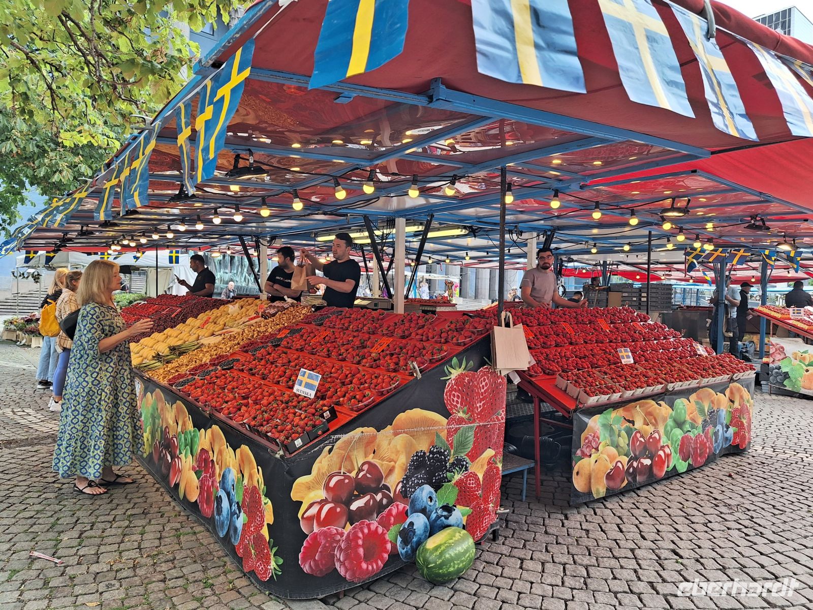Nach der Besichtigung der Markthalle kauft Renate weitere Köstlichkeiten ein, die wir gegenüber im gemütlichen Kirchgarten unter schattenspendenden Bäumen verzehren: Janssons Versuchung, Västerbottenostpaj und Moltebeeren.