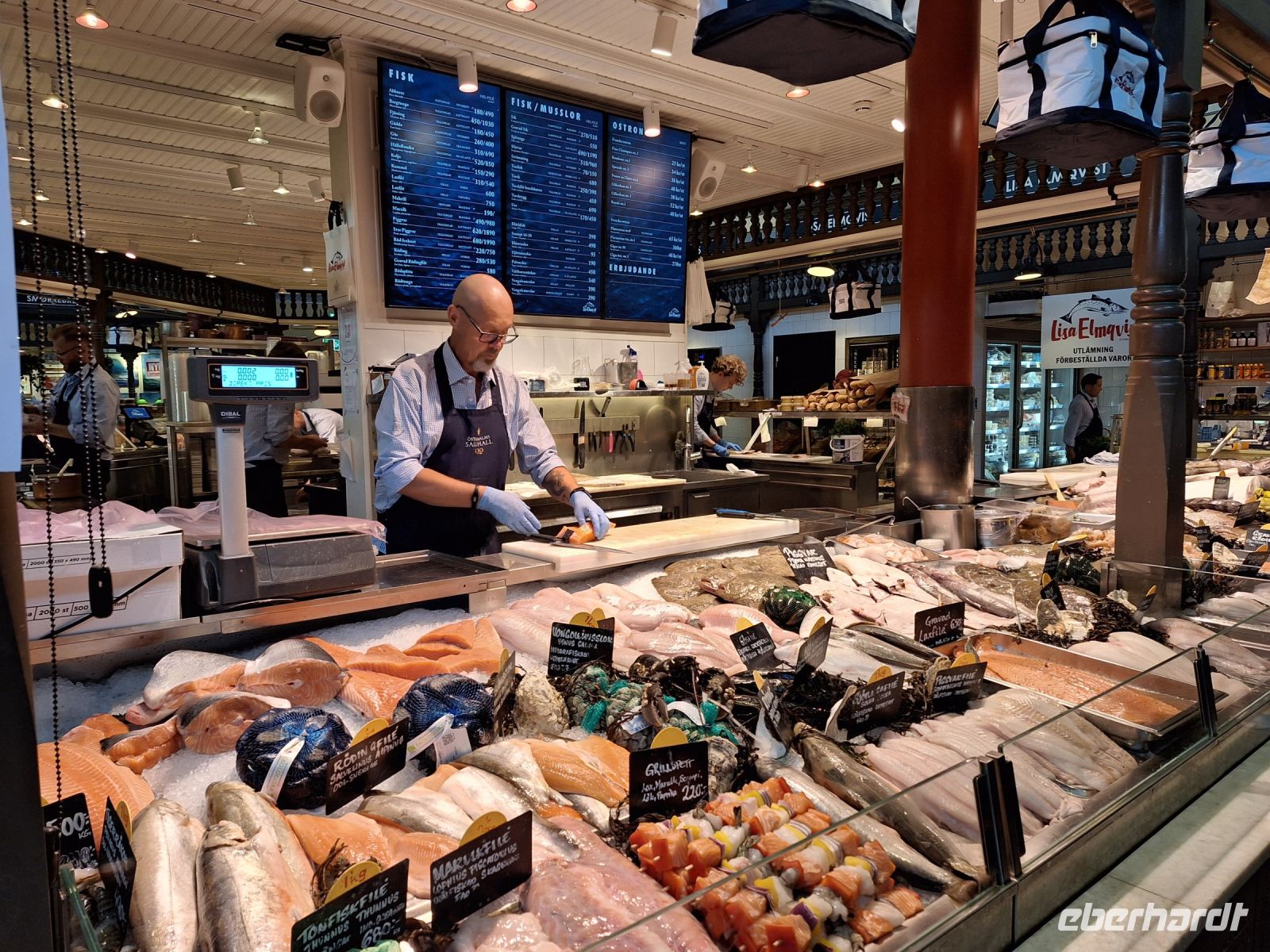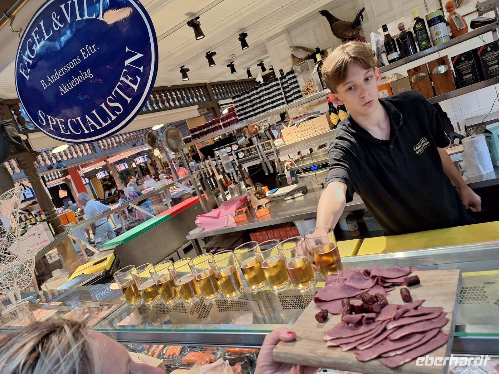 Viel zu schnell geht die Busfahrt voller Informationen durch Renata zu Ende und an der Östermalms Saluhall verabschieden wir unseren freundlichen Busfahrer. Nun geht es zu Fuß weiter. Die 1888 eröffnete historische Markthalle wurde erst 2020 komplett renoviert und ist wunderschön. Unter der bemerkenswerten Architektur gibt es alle Delikatessen, die man sich vorstellen kann. Wir probieren zunächst Elchaufschnitt, Bärenwurst und Rentierherz mit einem Gläschen Leichtbier.