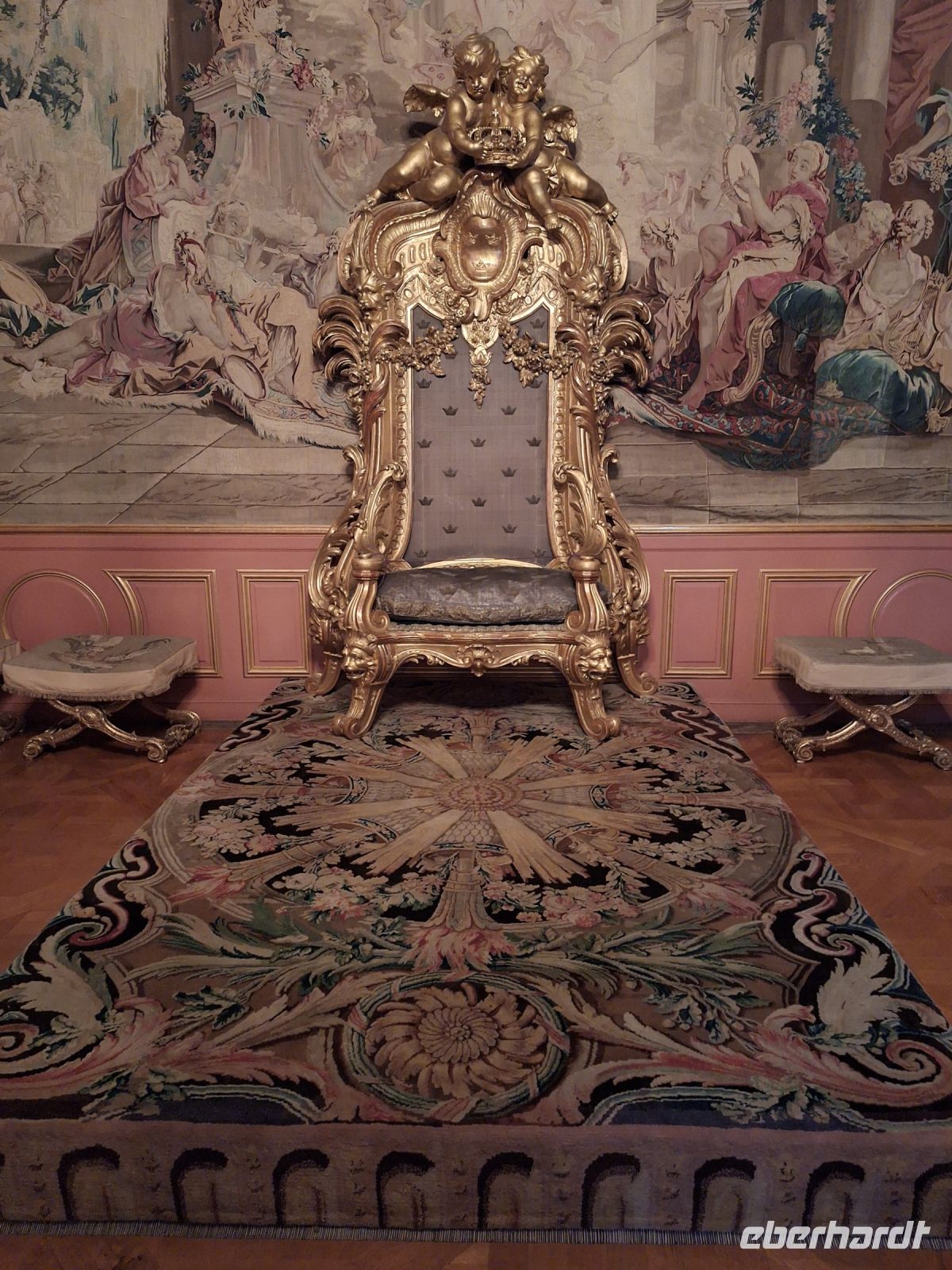 Wir starten per Minibus nach Södermalm, wo wir die Aussicht von einer der ältesten Straßen Stockholms ‚Fjällgatan‘ zum Fotografiemuseum und in Richtung Gamla Stan genießen. Weiter geht’s – wir passieren Langholmen, wo ein früheres Gefängnis heute u.a. ein Hotel beherbergt. Hier kann man also mal ein paar Nächte hinter „schwedischen Gardinen“ verbringen. Am Stadshus (Rathaus) angekommen, erwartet uns eine kleine Sensation. Wir entdecken die Königliche Gondel, die sonst nicht öffentlich zu besichtigen ist. Sie wird gerade geputzt und „flott gemacht“, vermutlich wird das Königspaar sie heute noch benutzen, um zu den 100jährigen Jubiläumsfeierlichkeiten zu kommen. Letztere sind auch der Grund, warum wir nicht in das Rathaus hinein können, aber später gibt es dafür einen tollen Ersatz im Königspalast.