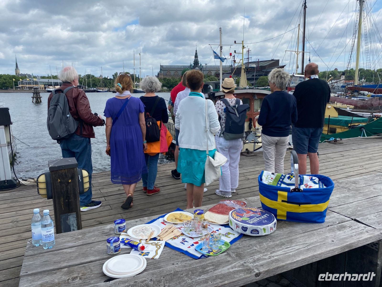 Am Hafen richtet Renata dann unser erstes Picknick aus. Sie hat jede Menge leckere Kostproben dabei: Knäckebrot, Hering, Kaviar und natürlich Aquavit. Dazu lernen wir ein fröhliches schwedisches Trinklied „Helan Går“, dessen Melodie uns nun als Ohrwurm begleitet.