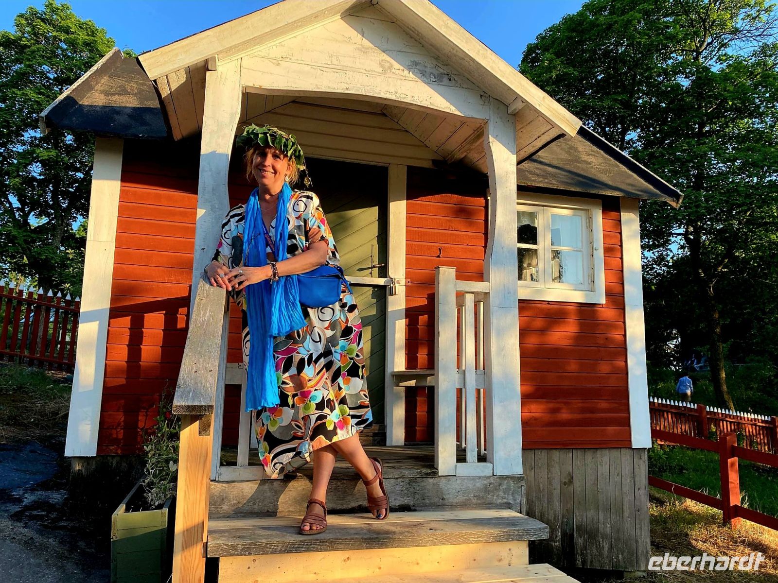 Wir bestaunen traditionelles Kunsthandwerk, es gibt schwedische Delikatessen und wir erleben folkloristische Musik und Tänze. Was ist das für Erlebnis, was für eine herrliche Stimmung! Fast jeder Kopf ist mit einem Blumen- oder Birkenkranz geschmückt, Jung & Alt singen und tanzen mit. Weil viele zum ersten Mal dabei sind, wirkt das teilweise etwas chaotisch, aber durch die Mischung aus Einheimischen und Touristen wird ein riesiges Vergnügen daraus.