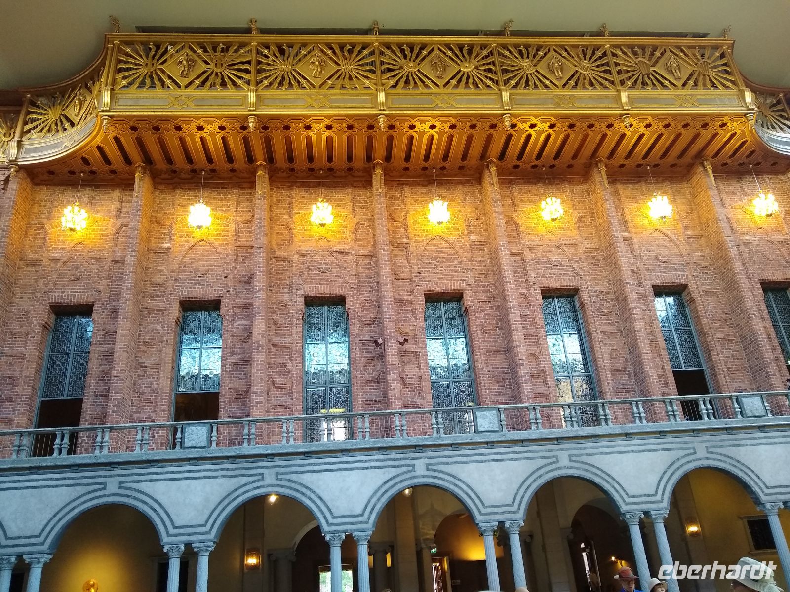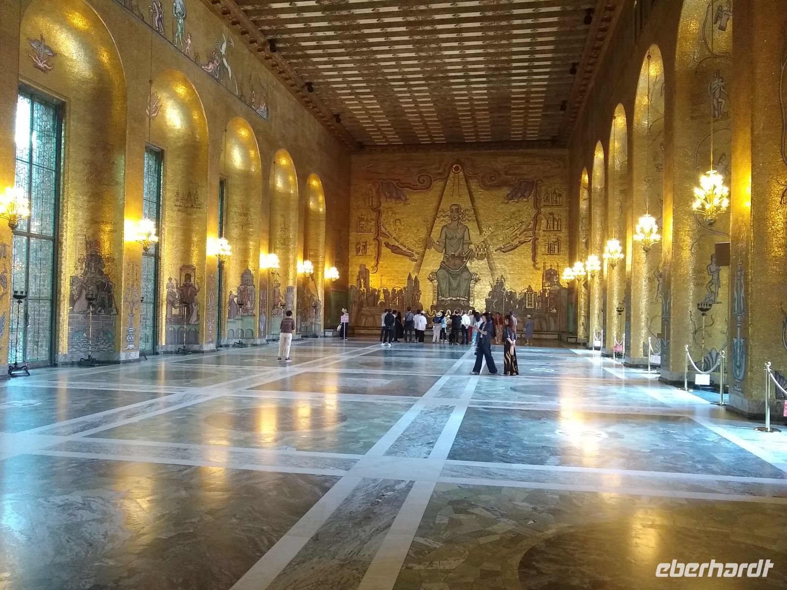Die Führung durch das Rathaus, in dem alljährlich das festliche Bankett zu Ehren der Nobelpreisträger stattfindet, zählt zu den wichtigsten Programmpunkte bei der Besichtigung von Stockholm. Die prachtvolle Treppe, der goldenen Saal mit den historischen Szenen in Mosaik und der blauen Saal in dem der Bankett stattfindet, beeindrucken immer. Kein Bankett, aber eine schöne Verkostung schwedischer Produkte erleben wir im Stadtteil Östermalm, in der Markthalle. Bärensalami, Renntierschinken, Elchfleisch, Käse und Knäckebrot sind auch dabei. Bier und ein Glas Aquavit ebenso.