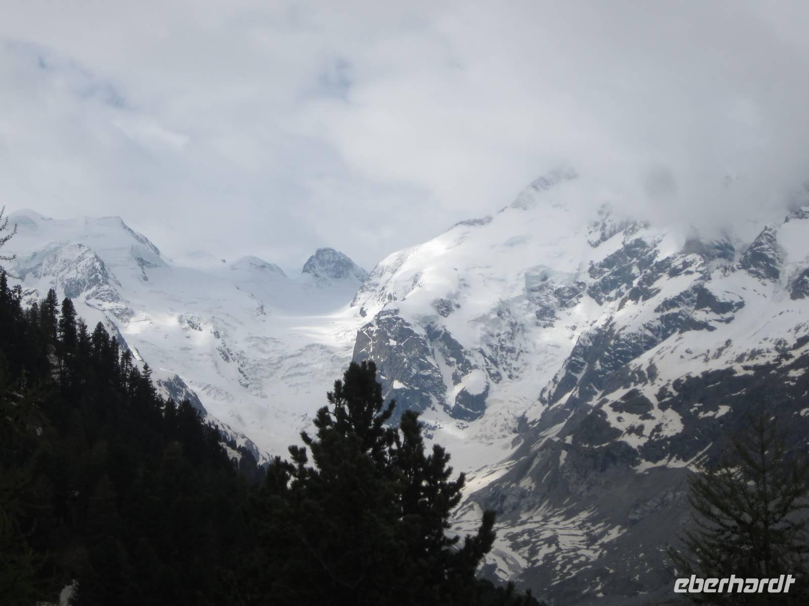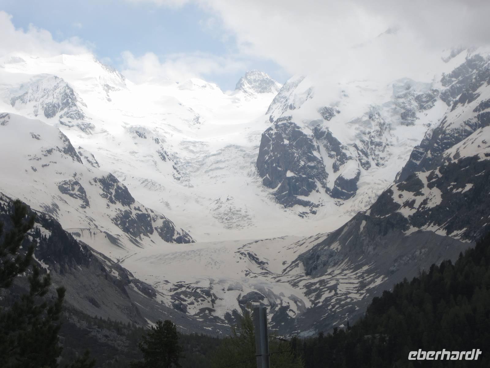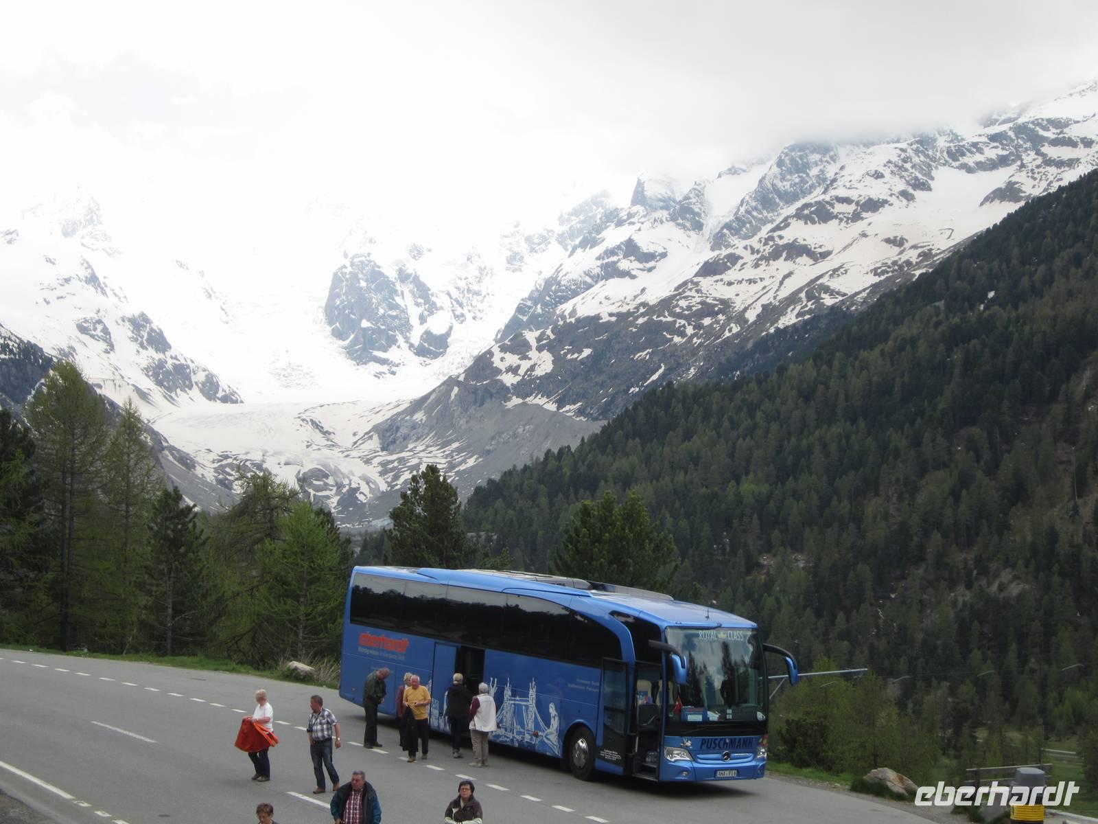 Nach dem Frühstück geht es nach Pontresina. Auf der Strecke fahren wir unseren ersten Pass den Flüela (2383 m). Unser Fahrer Reiner bewältigt die Kehren sicher und perfekt. Somit können wir uns voll und ganz auf die Bergwelt konzentrieren. Die Berge, die Blumenvielfalt der Bergwiesen und die Fahrt am Inn entlang ist schon ein Erlebnis. Wir wollen aber nach Pontresina, um mit dem Bernina-Express, der höchsten Bahnverbindung, die offen - ohne Scheiteltunnel - über die Alpen führt, nach Tirano. Begeisterung bei allen Gästen, vor allem natürlich bei den Fotografen. Die Berge und Gletscher, die Schönheit der Natur können wir bei schönem Wetter erleben.