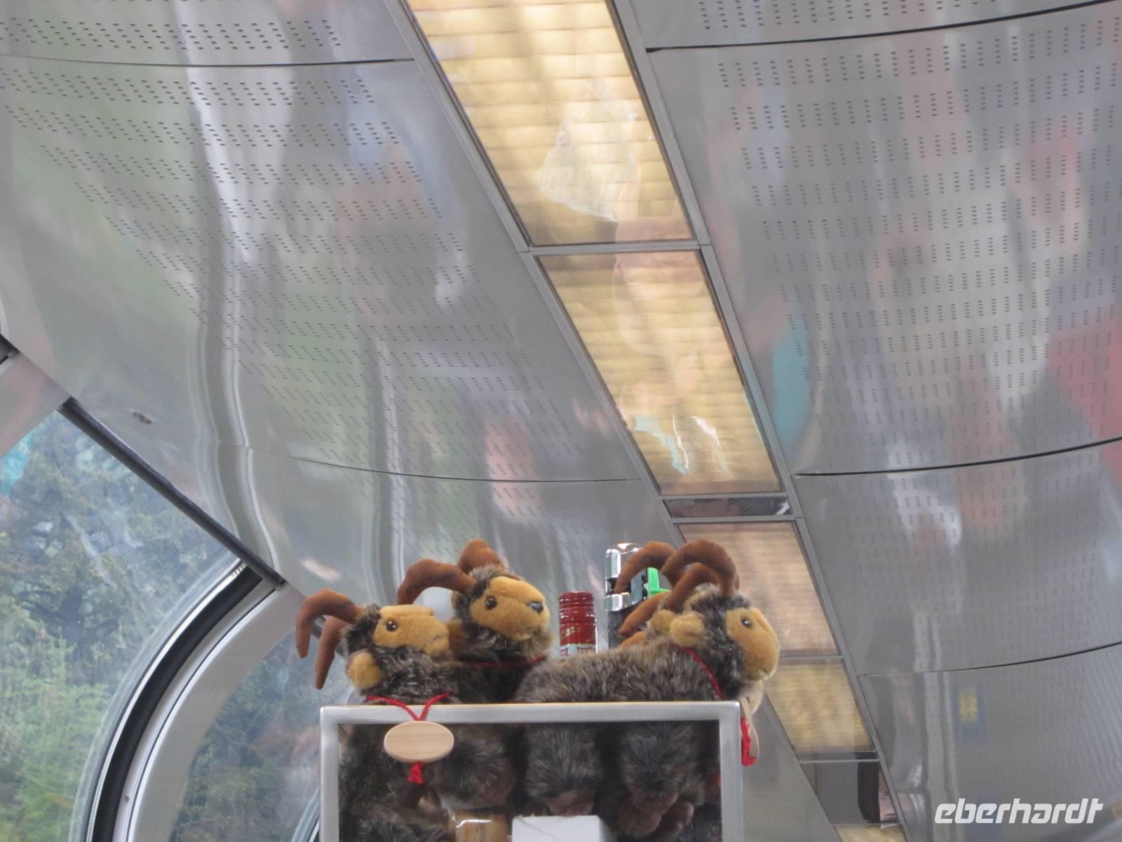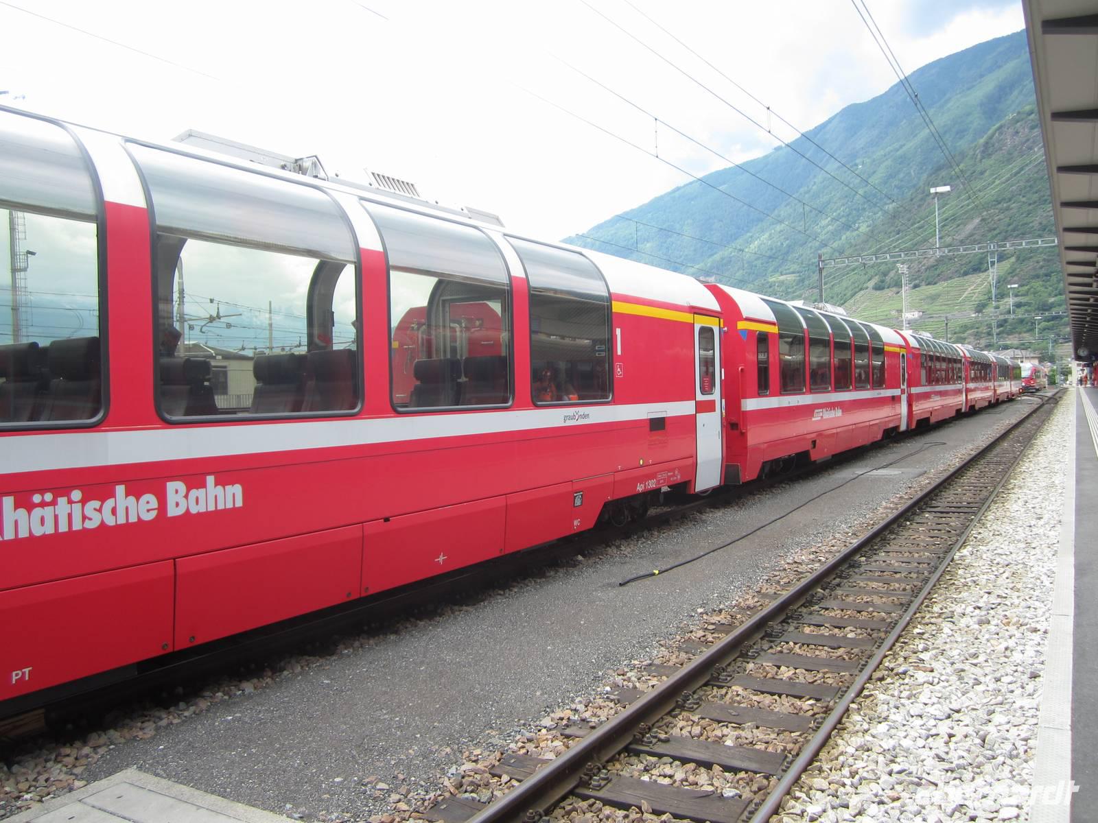 10.36 Uhr fahren wir mit dem Regionalzug nach Filisur. Hier steht für uns der „langsamste Schnellzug der Welt" bereit. Eine Reservierung für Eberhardt Gäste zeigt uns unseren Waggon. Die Fotografen wollen natürlich ans Fenster. Aber die Panoramawagen des Glacier Expresses bieten allen Gästen eine allerbeste Aussicht auf die Umgebung. Unsere Panoramafahrt kann beginnen.