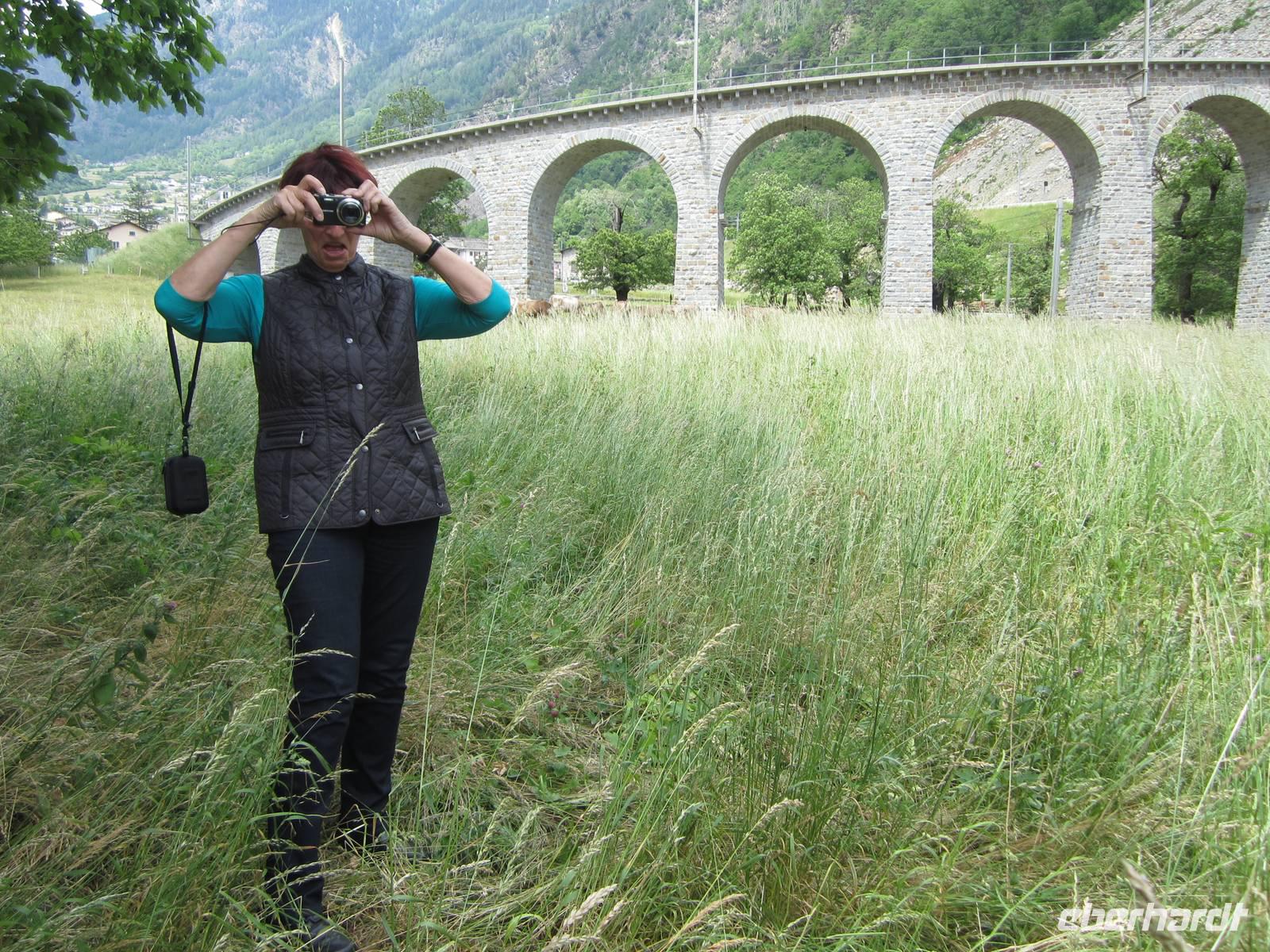 Eine Stunde haben wir Zeit und die Gruppe teilt sich. Ein Teil nutzt die Zeit, die schönen Blumenwiesen zu fotografieren. Ein anderer Teil wartet auf den Glacier-Express am Fuß des Viaduktes und einige von uns wandern zu dem ca. 100 m hohen Fotostopp. Ein besonderes Erlebnis und langsamsten Schnellzug von "oben" zu fotografieren. Einige Informationen der Räthischen Bahn füge ichbei.