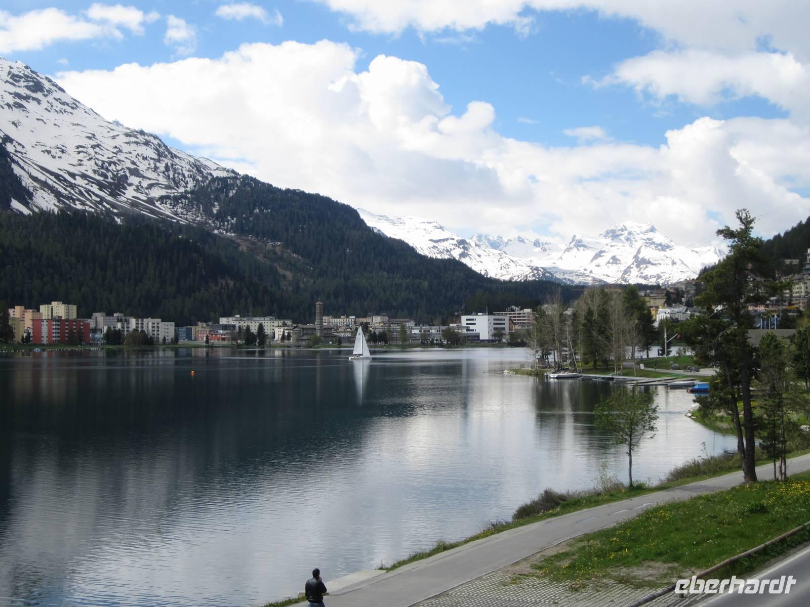 Nun geht es nach St. Moritz als „Top of The World" der in aller Welt berühmte exklusivste und teuerste Wintersportort der Alpen. Anderthalb Stunden nehmen wir uns Zeit, den Ort zu erkunden. Die Hotelpaläste und Geschäfte sind zum großen Teil noch geschlossen. Wir bummeln durch St. Moritz Dorf und genießen dabei das schöne Wetter.