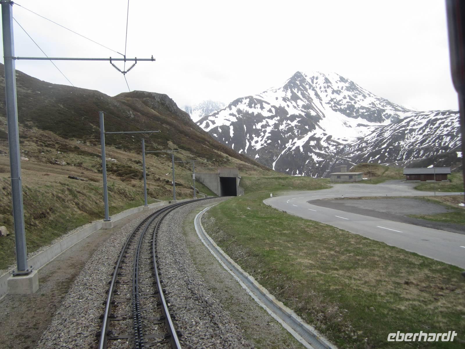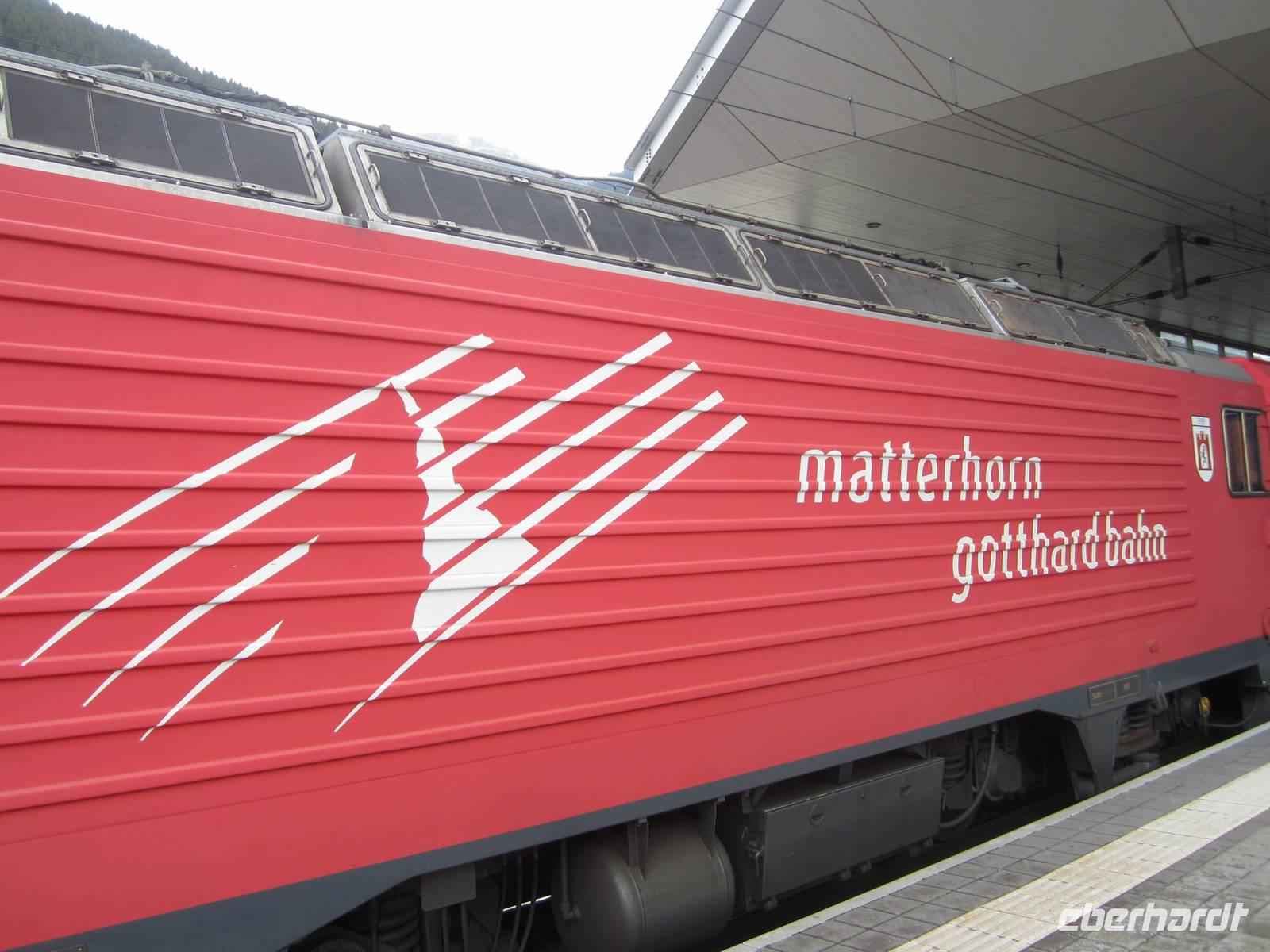 Weitere schöne Eindrücke erhalten wir auf der Fahrt nach Zermatt. Dazu gehört Disentis mit der ältesten Benediktinerabtei der Schweiz. Aber auch der Bahnhof ist ein wichtiger Punkt der Reise. Die folgenden Strecken werden teilweise so steil, dass der Zug auf die Hilfe einer Zahnstange angewiesen ist. Nun erklimmen wir den höchsten Punkt der Reise, den 2033 m hohen Oberalppass. Nach steiler Abfahrt sehen wir Andermatt. Auf unserer weiteren Strecke durchfahren wir den Furka - Basis - Tunnel. 15 km lang und 15 min Fahrzeit. Der Bau des Tunnels (1982) macht es möglich, dass die Bahn das ganze Jahr betrieben werden kann.