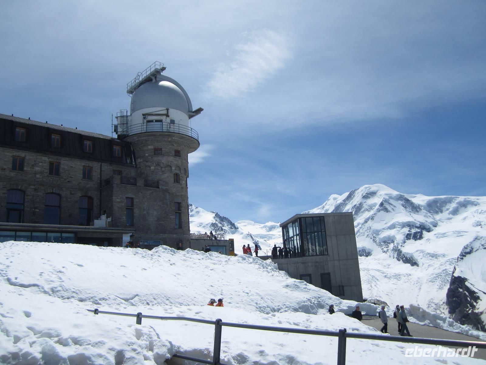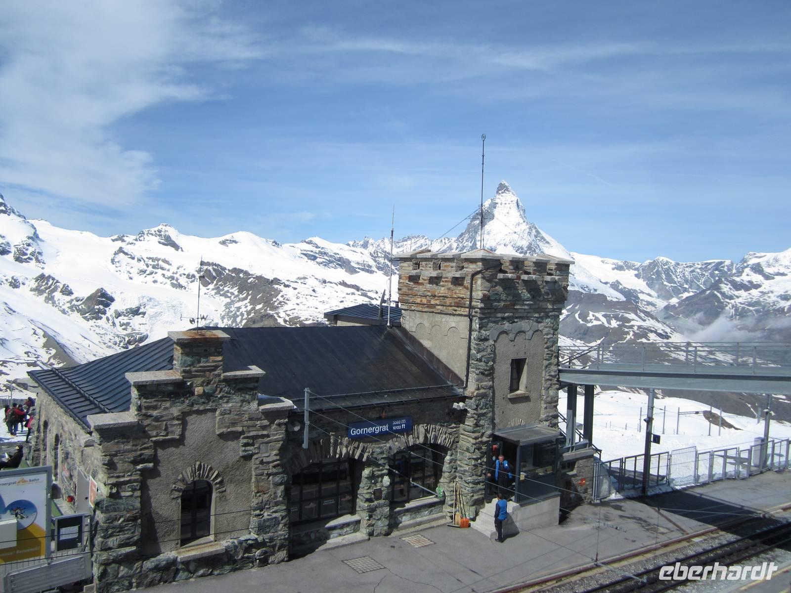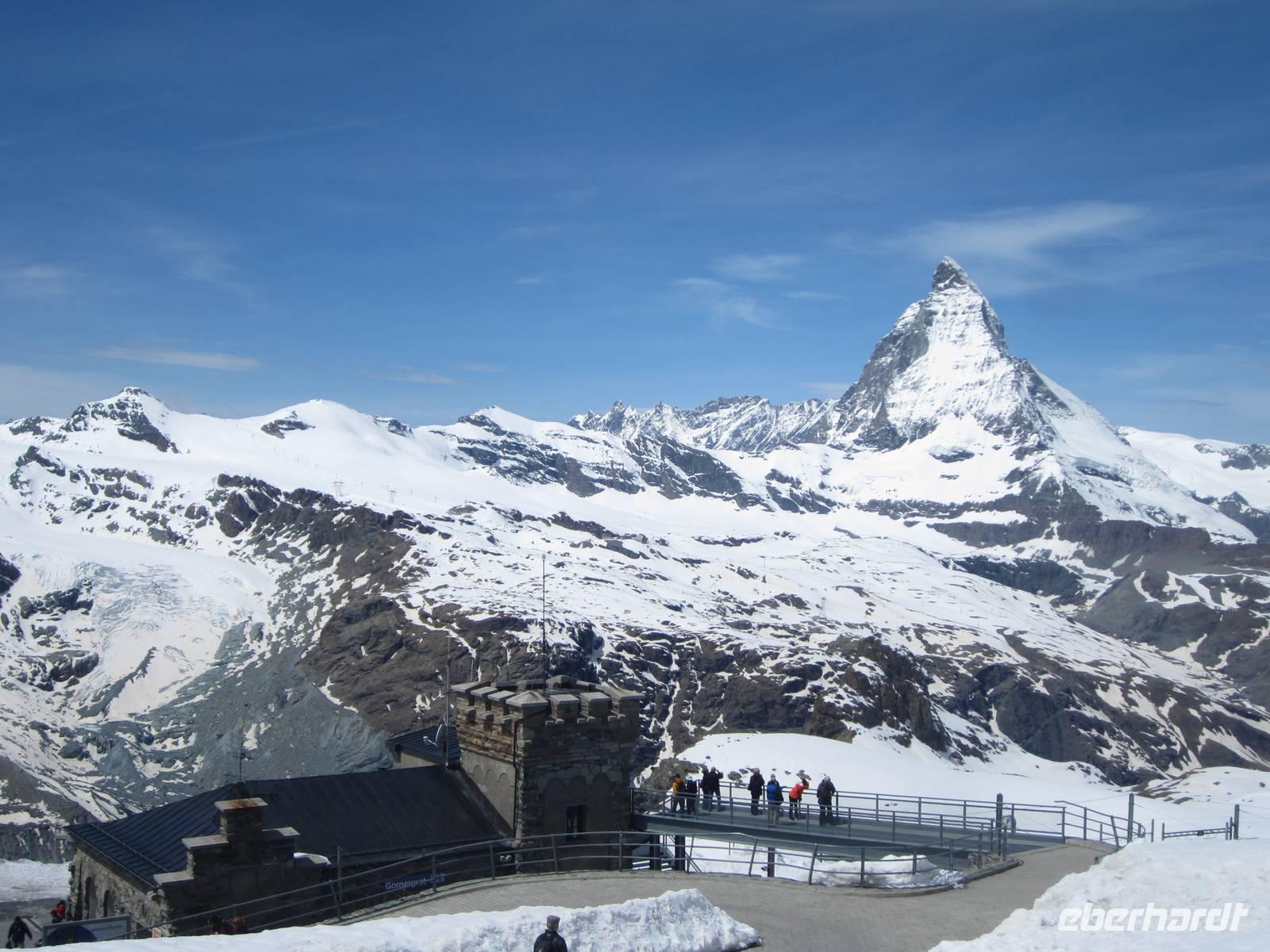Reiner ist mit unseren Koffern schon an der Rezeption. Schnell sind die Zimmer bezogen und wir lassen bei einem guten Abendessen den Tag ausklingen.Tag, ZermattNach dem Aufwecken, Blick zu den Bergen. Wir haben Glück, kalte Temperaturen in der Nacht und schon teilweise blauer Himmel am Morgen. Der größte Teil der Gruppe fährt zum Gornergrat. Wir nehmen den Zug 09.36 Uhr. Es sind noch wenige Gäste unter,wegs, die Tagestouristen kommen später und wir können die Ruhe auf den Gornergrat genießen. Die Berge zeigen sich in voller Schönheit mit viel Schnee. Um wandern zu können muss man die tieferen Regionen nutzen.