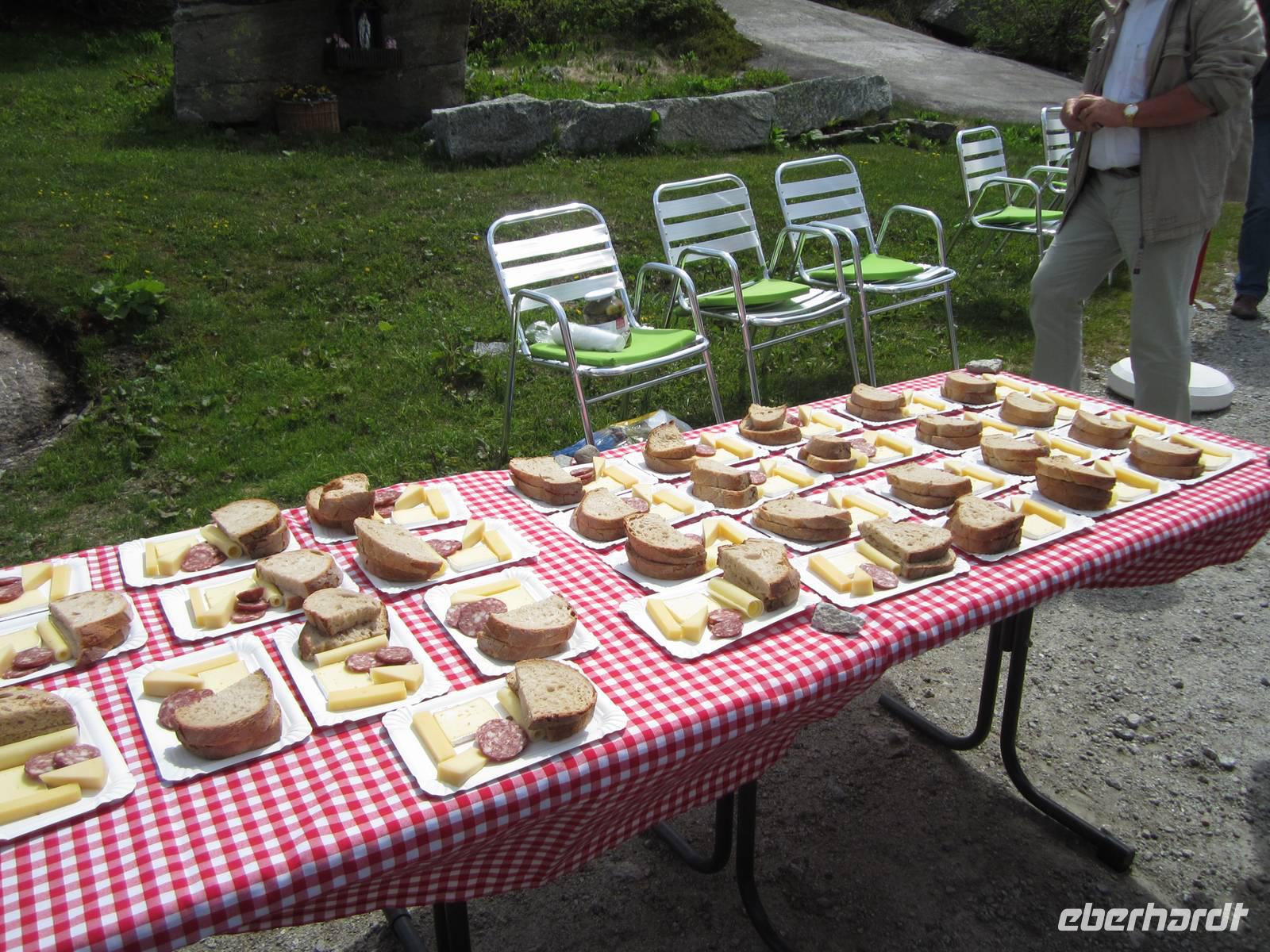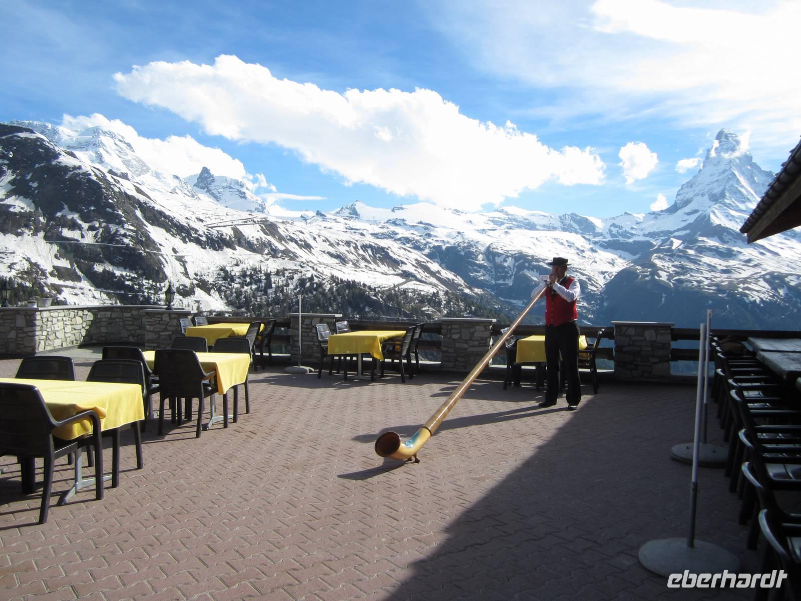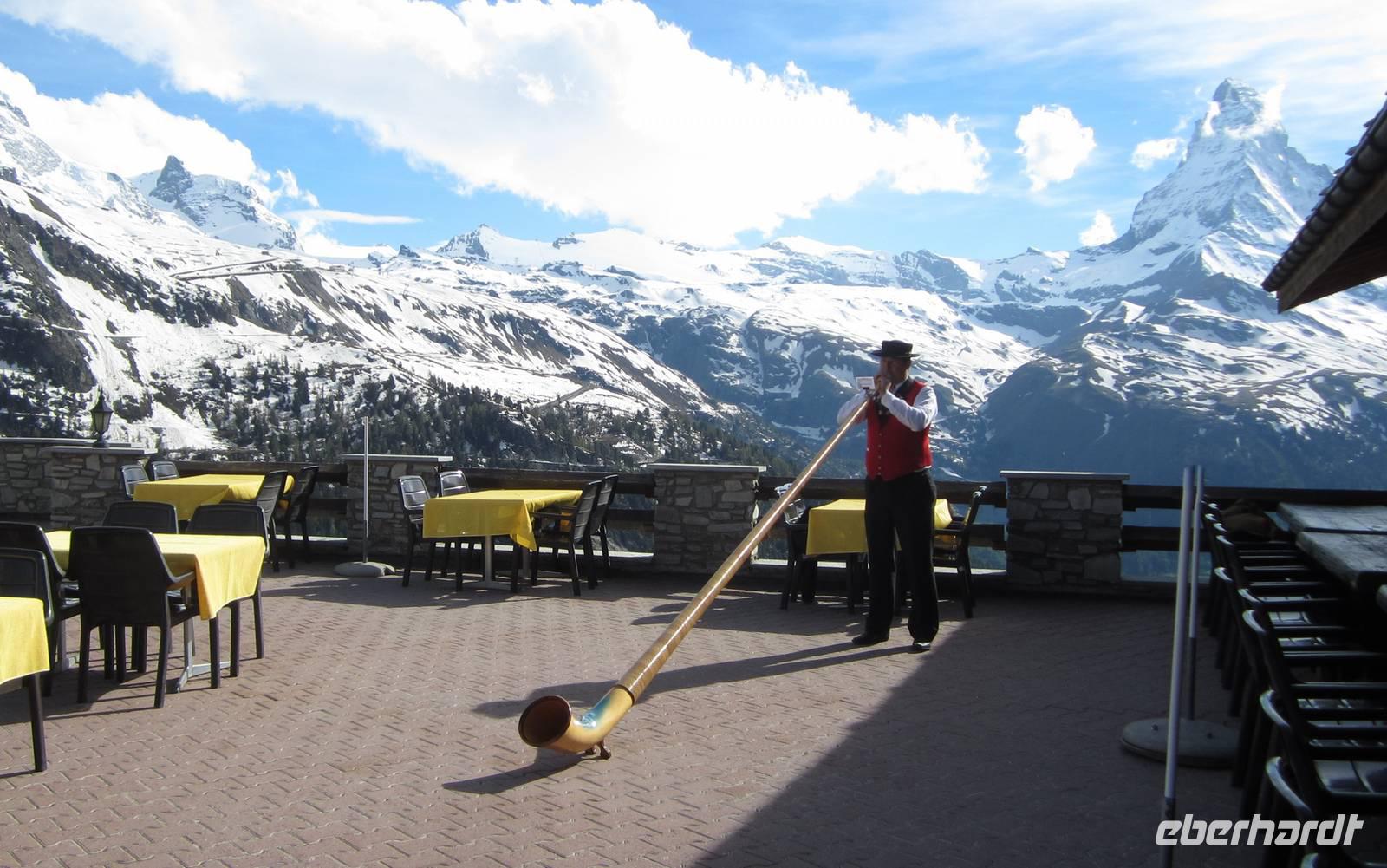 Begrüßt werden wir von einem Alphornbläser. Bei einem typisch schweizerischen Käseraclette und typischer Schweizer Folklore