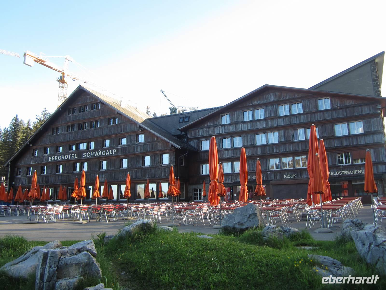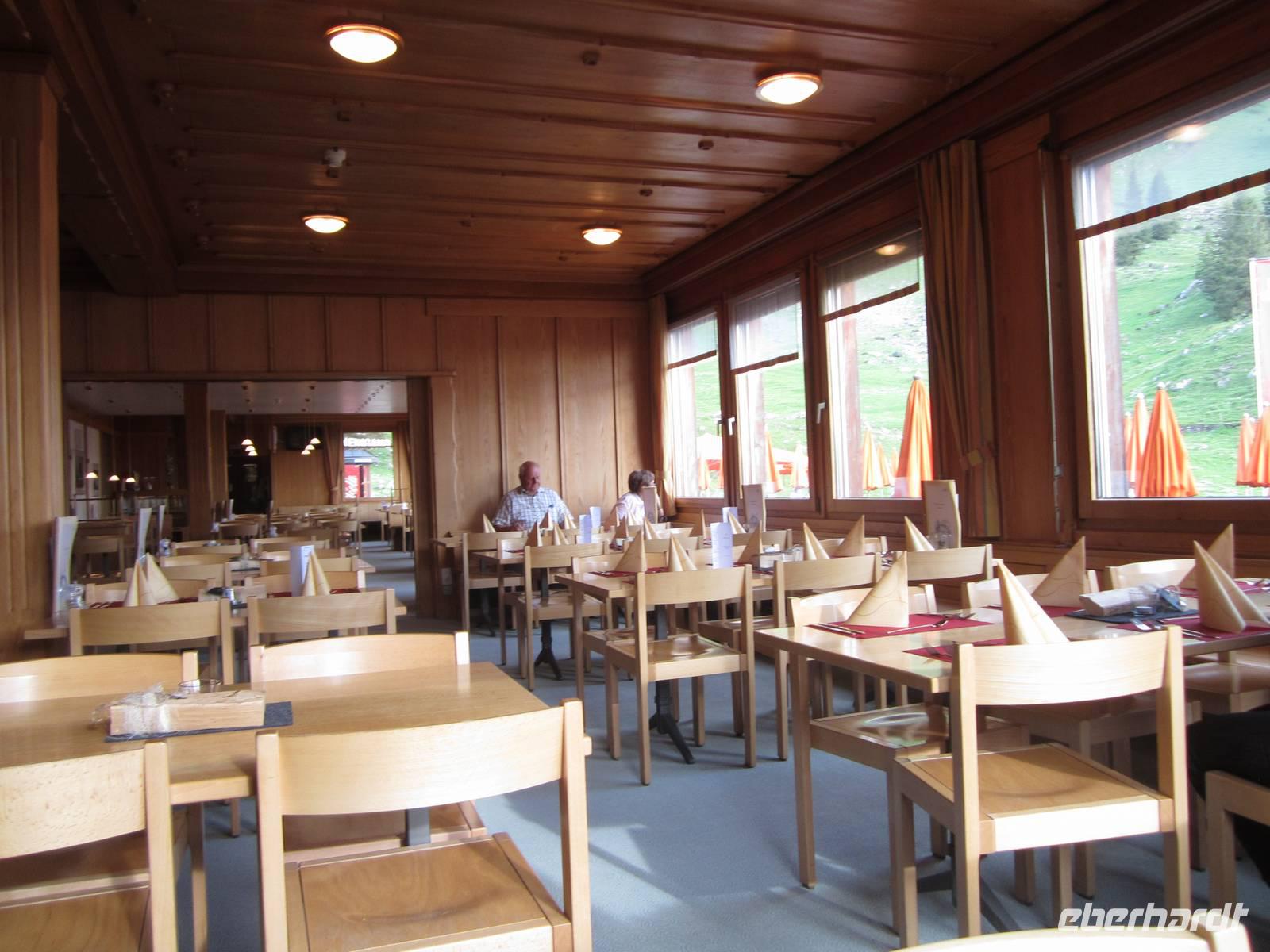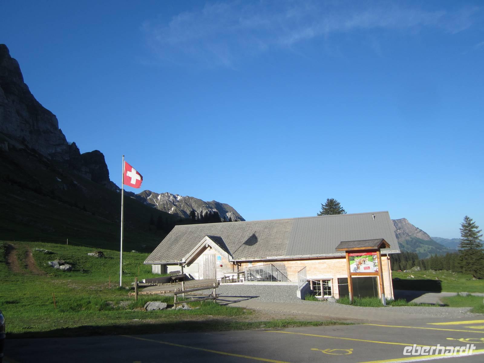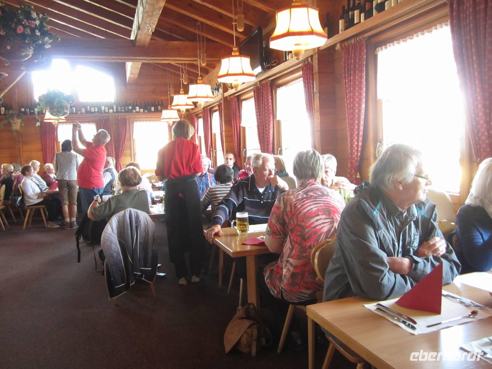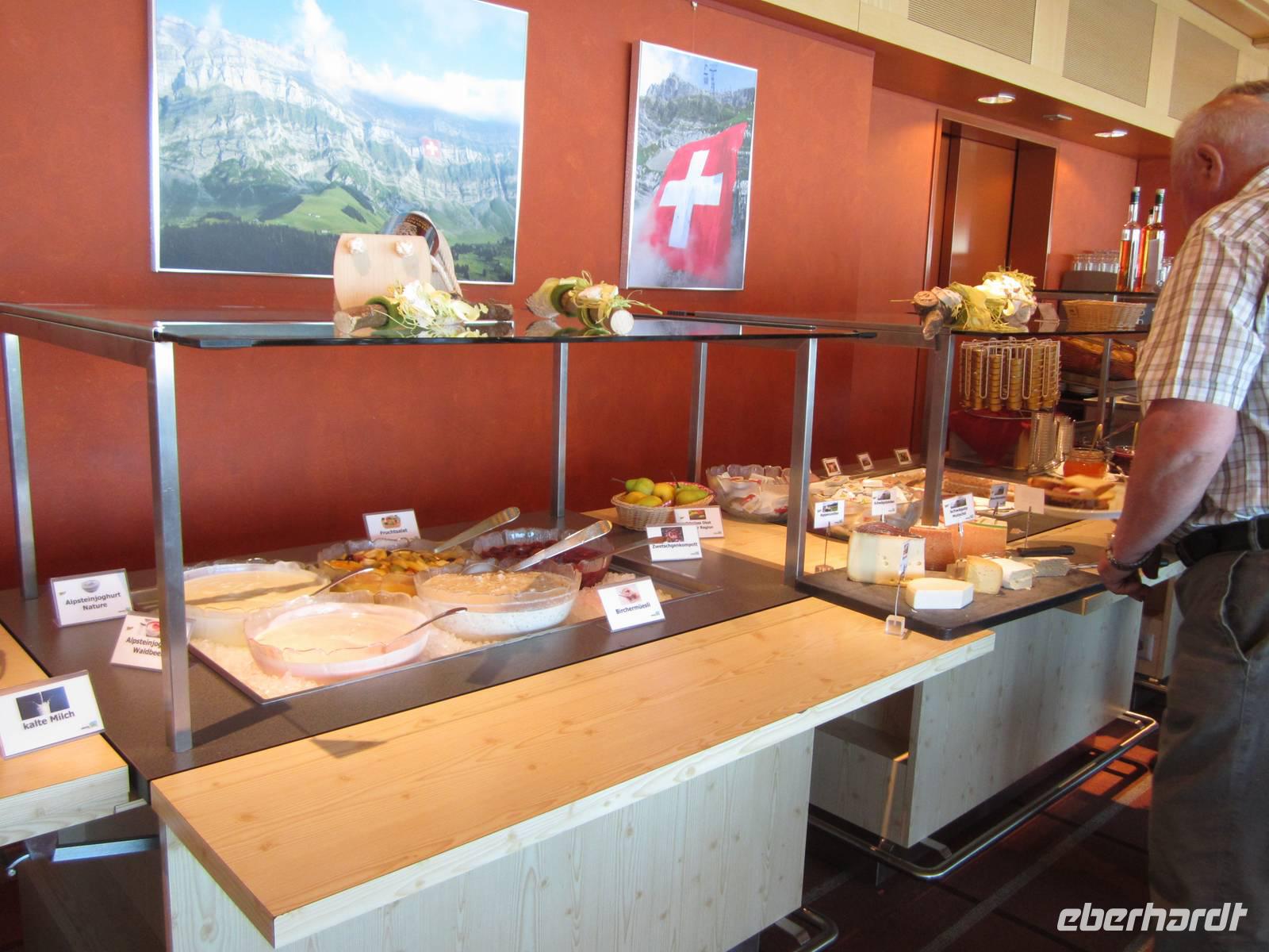 Wir wollen die erste Bahn zum Säntis nehmen gegen 7.15 Uhr werden die Koffer in den Bus geladen und wir laufen zur Bahnstation. Mit dem Wetter klappt es heute wieder.Das Frühstück auf dem Säntis im Panoramarestaurant lässt keine Wünsche offen. Die beliebten Rösti und auch der gute Appenzeller und Urnäscher Käse liegen für uns auf dem Büfett.
