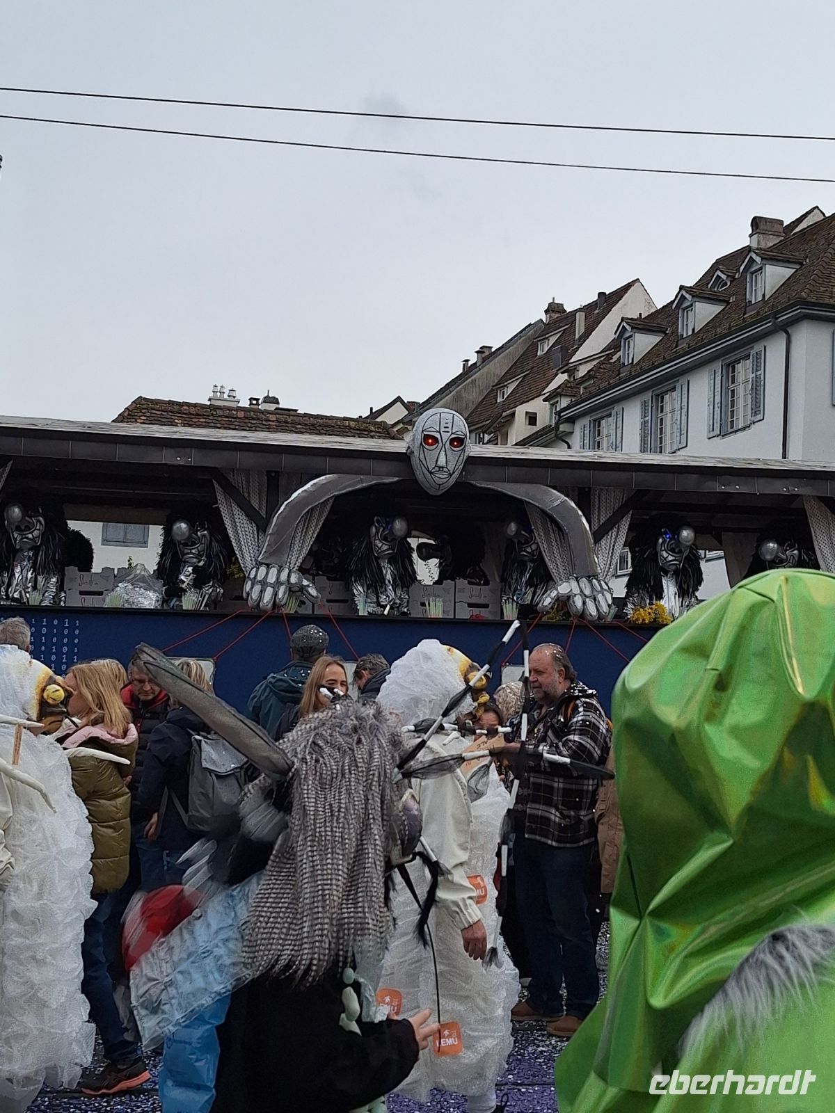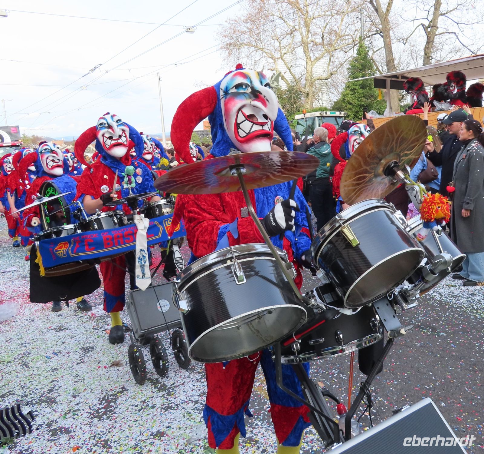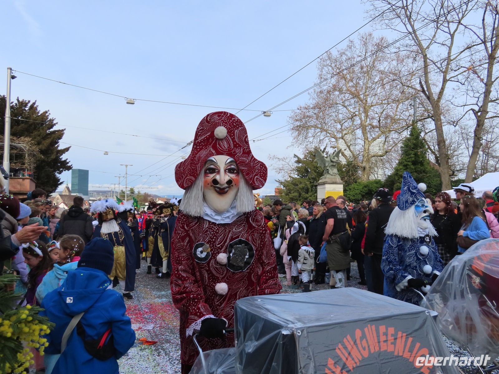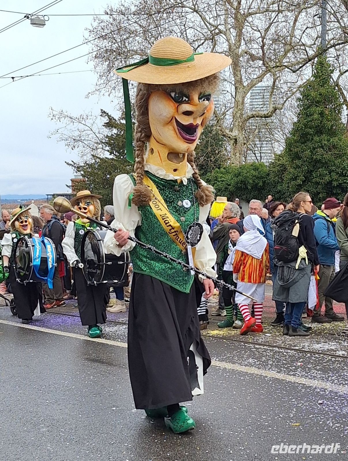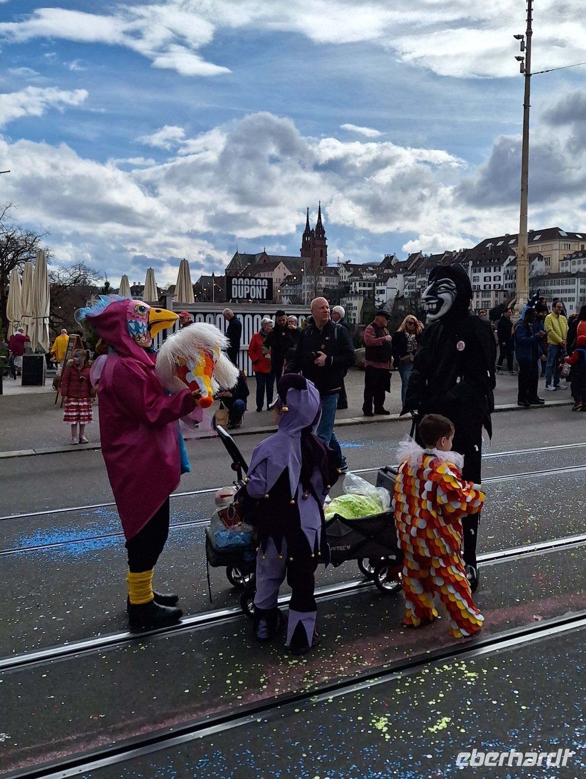 Am Vormittag erwartet uns ein weiterer Höhepunkt. Auf dem Münsterberg vor dem Museum der Kulturen erwartet uns ein leidenschaftlicher Fasnächtler natürlich im Kostüm. Er nimmt uns in der interessanten Ausstellung zur Basler Fasnacht auf besondere Art mit in die Welt und die Faszination der Fasnacht. Gespannt lauschen wir den spannenden Geschichten! Wir erfahren, dass die Kostüme für den Cortegè, den großen Umzug jeder Fasnächtler jedes Jahr neu anfertigt, dass zum Morgenstraich und am Dienstag zur Kinderfasnacht alle in selbst gewählten Kostümen unterwegs sind. Sehr erstaunt sind wir darüber, dass die Fasnacht durch die Cliquen selbst finanziert werden. Der Verkauf der Plaketten ist dabei ein wichtiger Beitrag. Es gibt keinerlei Zuschüsse von der Stadt oder anderen Sponsoren. Deshalb ist es möglich, dass verschiedenste, auch unbequeme Themen als Sujet – Thema durch die Cliquen gewählt werden können. Wir erfahren, wie die Larven – die Masken – hergestellt werden, wie eine Trommel gebaut ist und die Bedeutung der verschiedenen Figuren, die wir immer wieder in den einzelnen Cliquen entdecken. Es war ein sehr kurzweiliger Besuch. Den weitern Tag nutzen wir zum Bummeln durch die engen Gassen der Altstadt. Hier sind heute die unterschiedlichsten Gruppen unterwegs. Überall treffen wir die fröhlichen Fasnächtler. Guggemuusig, Piccollos und Trommler – die ganze Stadt ist erfüllt mit den Fasnachtsklängen und heute voll in der Hand der Familien und Kinder. Sie formieren sich in einen eigenen großen Umzug. Auch dabei bleibt es nicht aus, dass uns die Begeisterung erfasst, mit welcher die Basler ihre Tradition pflegen und schon als Kinder mitwirken dürfen. In viel Liebe und Fantasie oft selbst gestalteten Kostümen und kleinen Wägelchen nehmen sie am Umzug teil. Sie verteilen ihre Dääfeli (Bonbons) und bewerfen sich gegenseitig und manchmal auch die Zuschauer mit Räppli (Konfetti). Es ist einfach herrlich.
