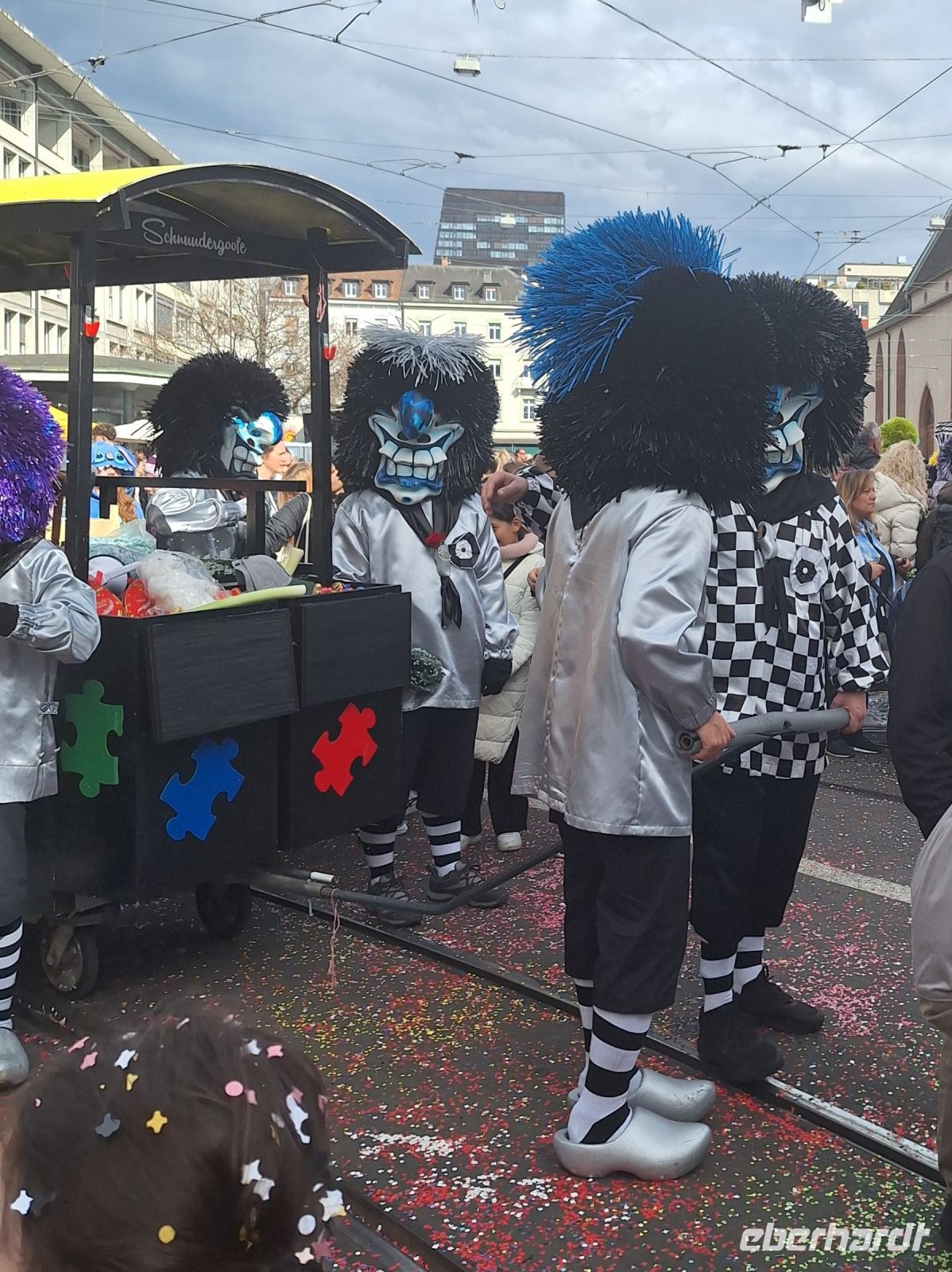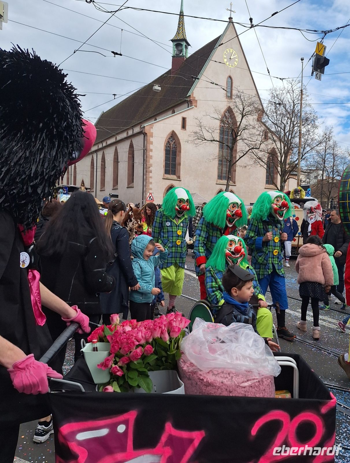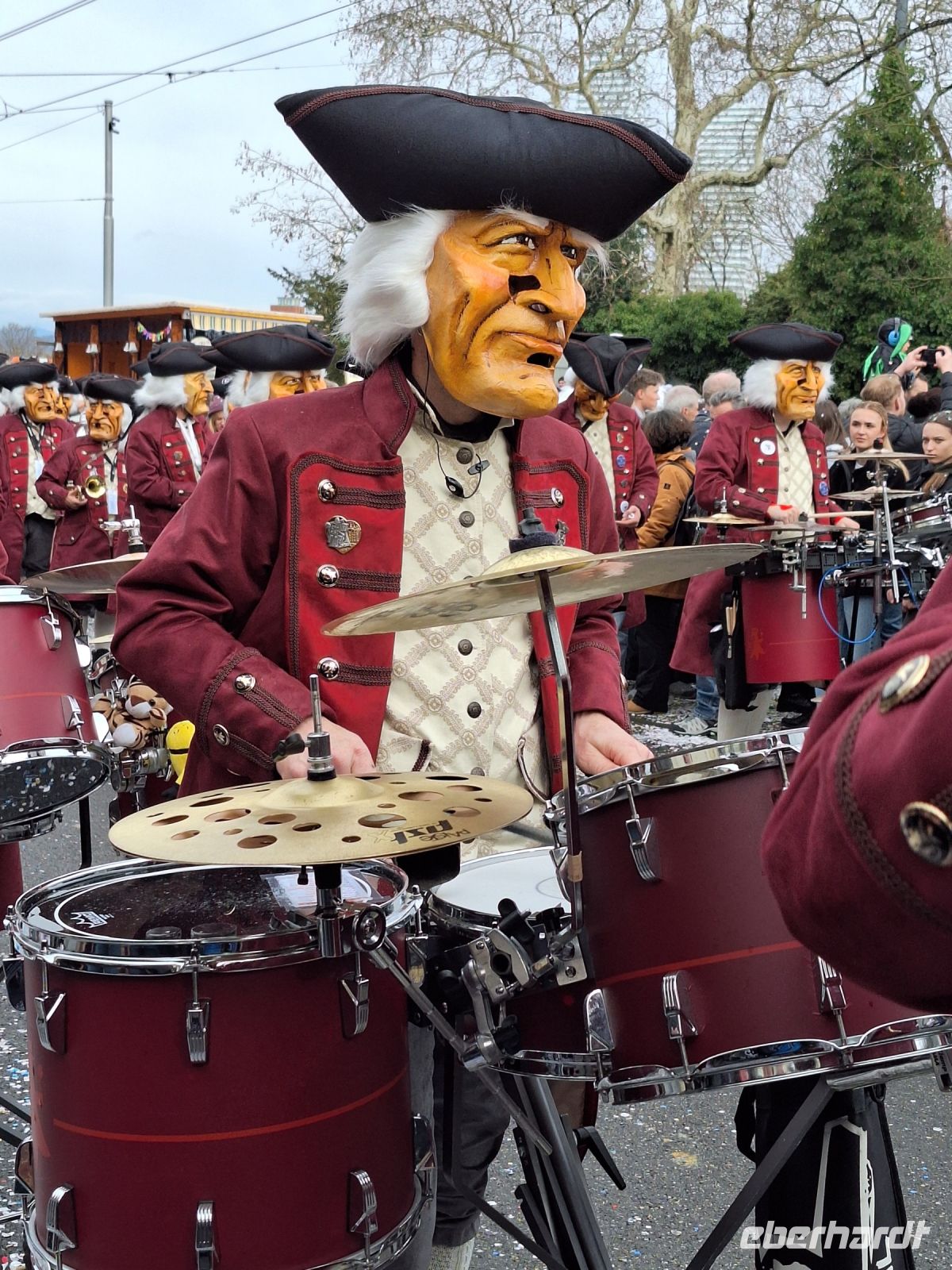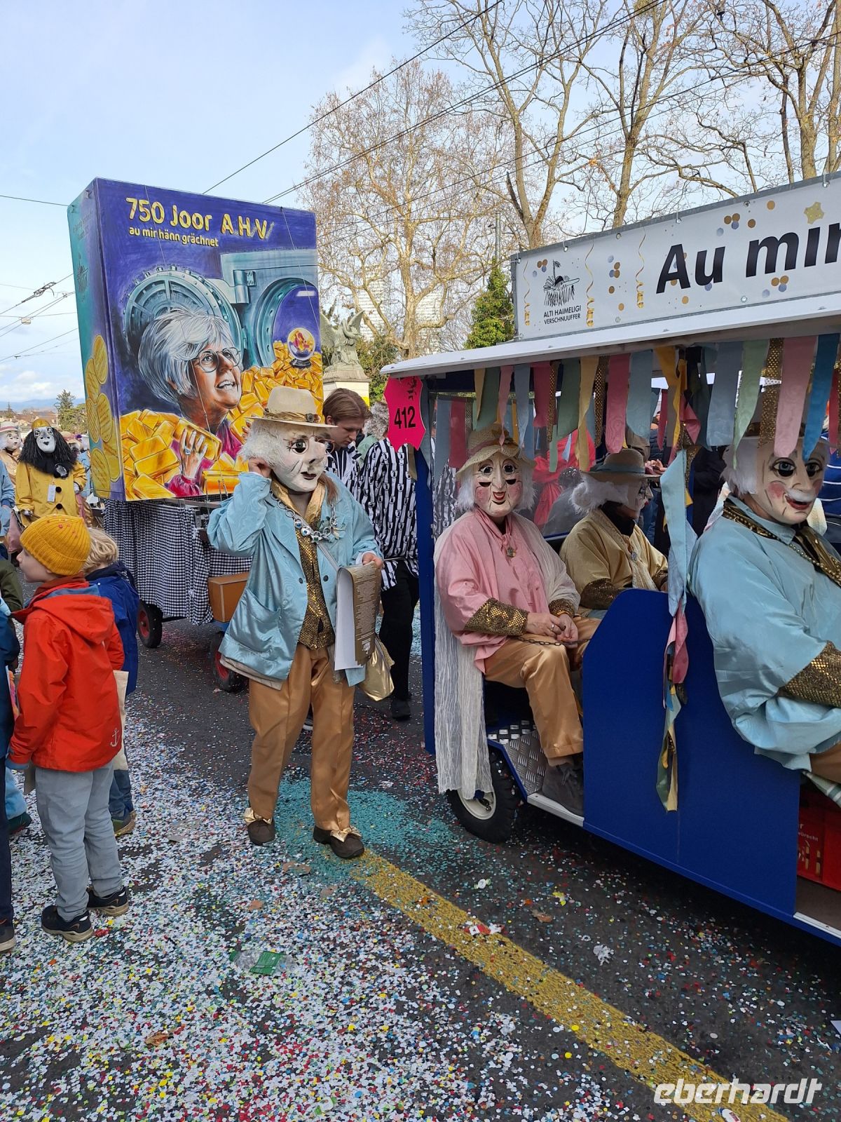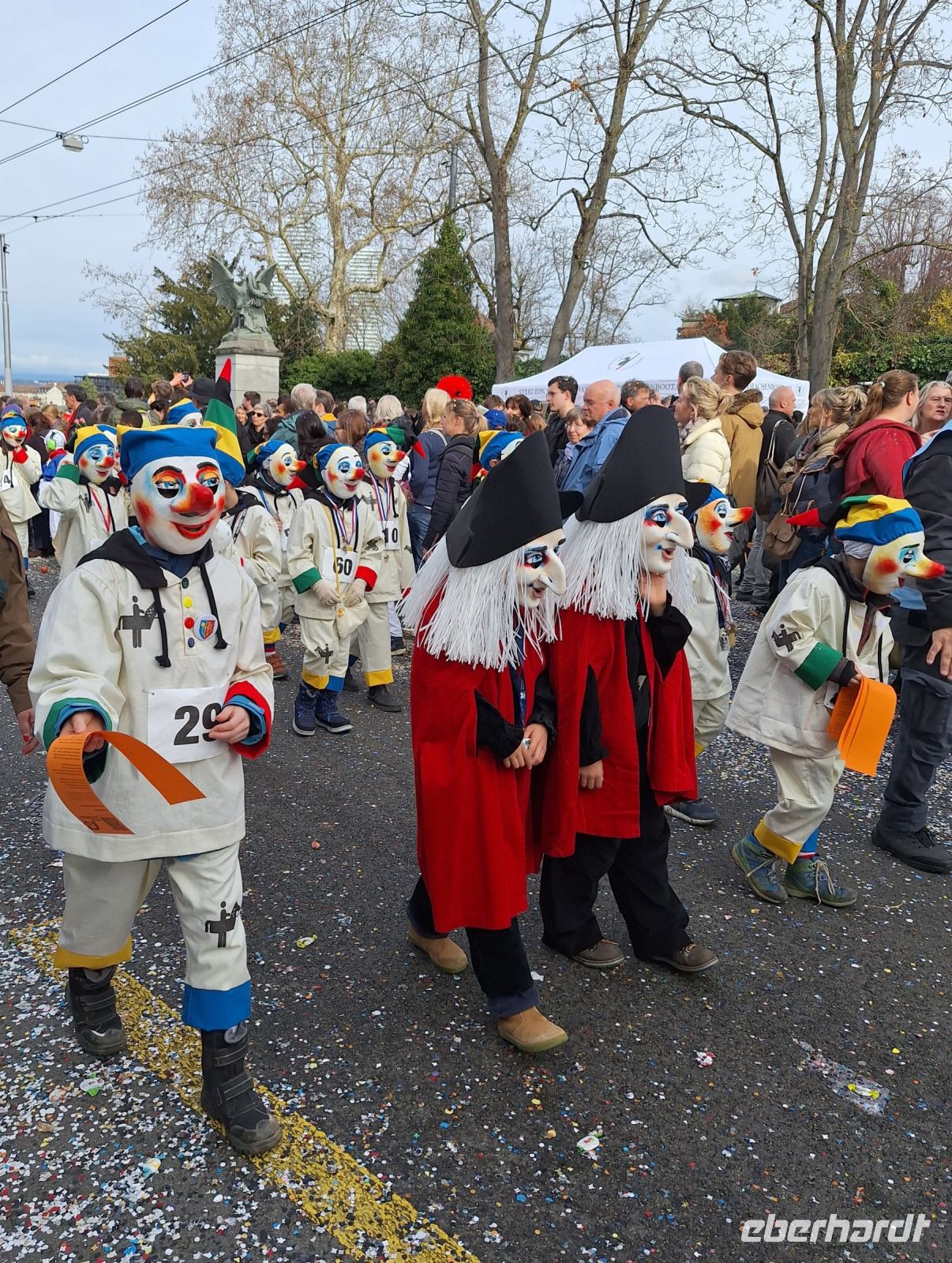 Am Vormittag erwartet uns ein weiterer Höhepunkt. Auf dem Münsterberg vor dem Museum der Kulturen erwartet uns ein leidenschaftlicher Fasnächtler natürlich im Kostüm. Er nimmt uns in der interessanten Ausstellung zur Basler Fasnacht auf besondere Art mit in die Welt und die Faszination der Fasnacht. Gespannt lauschen wir den spannenden Geschichten! Wir erfahren, dass die Kostüme für den Cortegè, den großen Umzug jeder Fasnächtler jedes Jahr neu anfertigt, dass zum Morgenstraich und am Dienstag zur Kinderfasnacht alle in selbst gewählten Kostümen unterwegs sind. Sehr erstaunt sind wir darüber, dass die Fasnacht durch die Cliquen selbst finanziert werden. Der Verkauf der Plaketten ist dabei ein wichtiger Beitrag. Es gibt keinerlei Zuschüsse von der Stadt oder anderen Sponsoren. Deshalb ist es möglich, dass verschiedenste, auch unbequeme Themen als Sujet – Thema durch die Cliquen gewählt werden können. Wir erfahren, wie die Larven – die Masken – hergestellt werden, wie eine Trommel gebaut ist und die Bedeutung der verschiedenen Figuren, die wir immer wieder in den einzelnen Cliquen entdecken. Es war ein sehr kurzweiliger Besuch. Den weitern Tag nutzen wir zum Bummeln durch die engen Gassen der Altstadt. Hier sind heute die unterschiedlichsten Gruppen unterwegs. Überall treffen wir die fröhlichen Fasnächtler. Guggemuusig, Piccollos und Trommler – die ganze Stadt ist erfüllt mit den Fasnachtsklängen und heute voll in der Hand der Familien und Kinder. Sie formieren sich in einen eigenen großen Umzug. Auch dabei bleibt es nicht aus, dass uns die Begeisterung erfasst, mit welcher die Basler ihre Tradition pflegen und schon als Kinder mitwirken dürfen. In viel Liebe und Fantasie oft selbst gestalteten Kostümen und kleinen Wägelchen nehmen sie am Umzug teil. Sie verteilen ihre Dääfeli (Bonbons) und bewerfen sich gegenseitig und manchmal auch die Zuschauer mit Räppli (Konfetti). Es ist einfach herrlich.