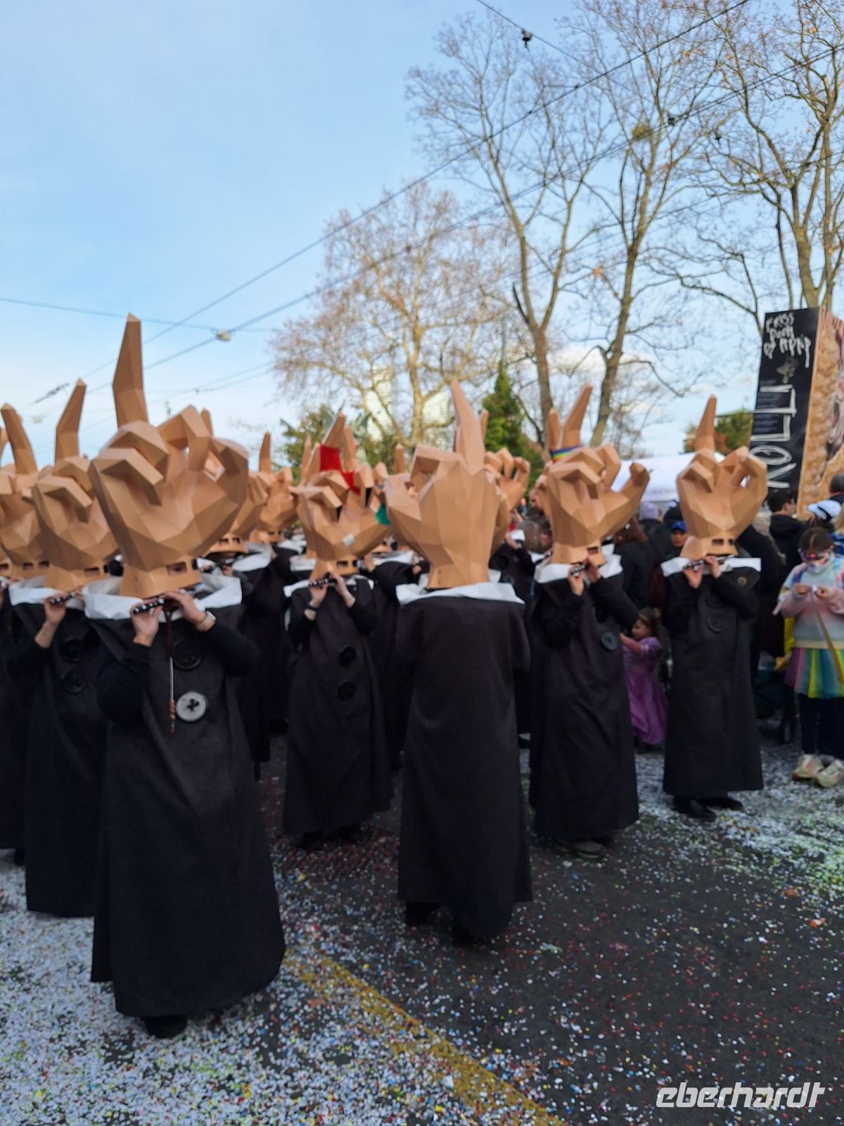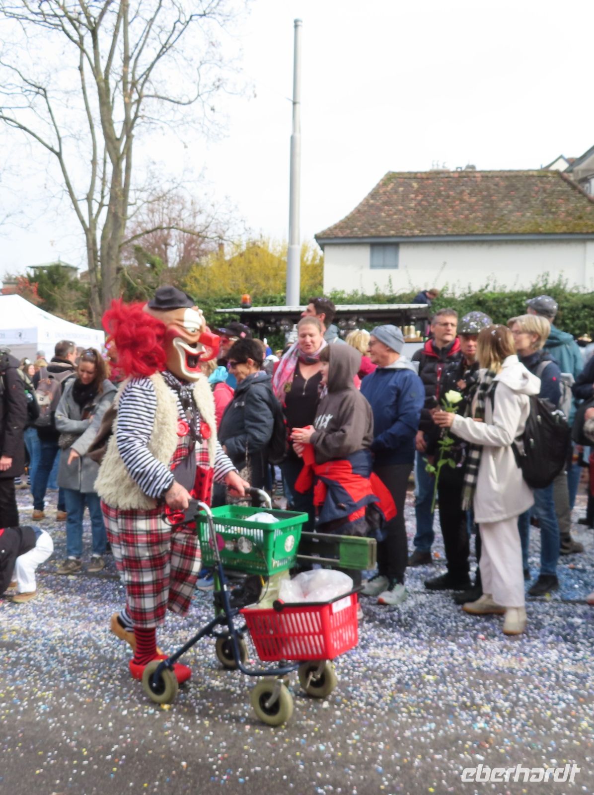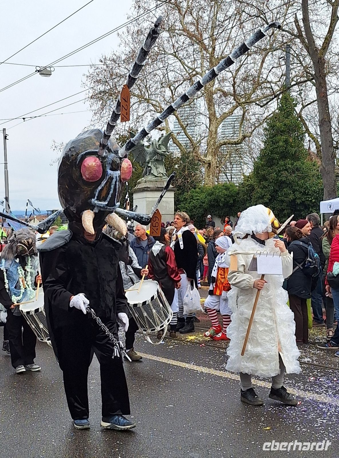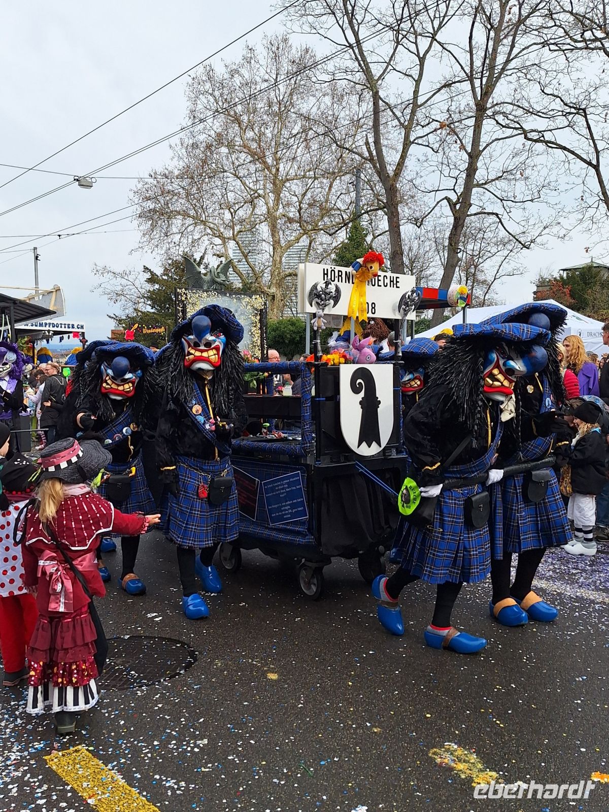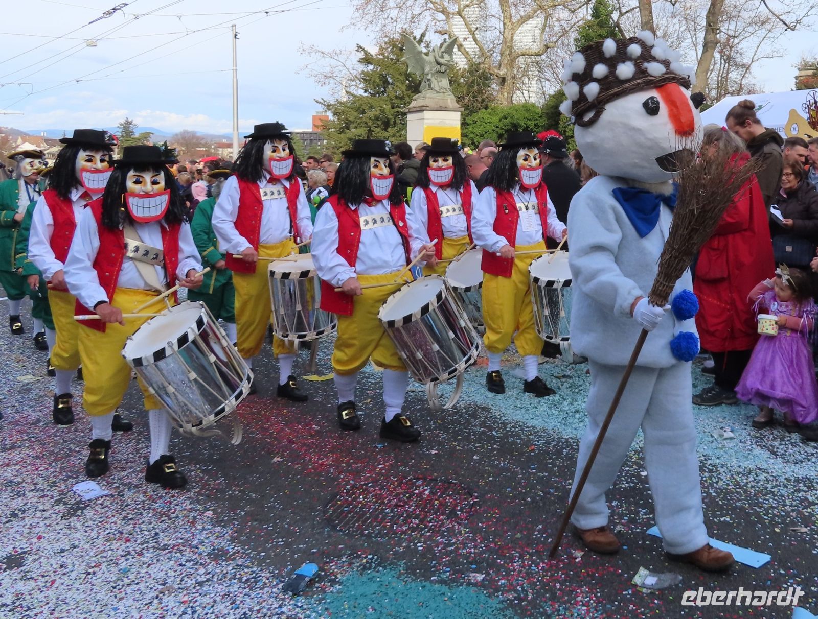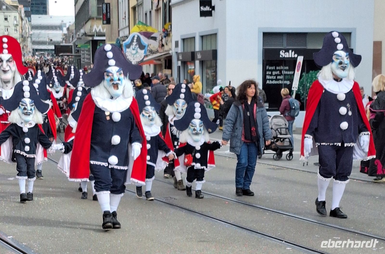 Am Vormittag erwartet uns ein weiterer Höhepunkt. Auf dem Münsterberg vor dem Museum der Kulturen erwartet uns ein leidenschaftlicher Fasnächtler natürlich im Kostüm. Er nimmt uns in der interessanten Ausstellung zur Basler Fasnacht auf besondere Art mit in die Welt und die Faszination der Fasnacht. Gespannt lauschen wir den spannenden Geschichten! Wir erfahren, dass die Kostüme für den Cortegè, den großen Umzug jeder Fasnächtler jedes Jahr neu anfertigt, dass zum Morgenstraich und am Dienstag zur Kinderfasnacht alle in selbst gewählten Kostümen unterwegs sind. Sehr erstaunt sind wir darüber, dass die Fasnacht durch die Cliquen selbst finanziert werden. Der Verkauf der Plaketten ist dabei ein wichtiger Beitrag. Es gibt keinerlei Zuschüsse von der Stadt oder anderen Sponsoren. Deshalb ist es möglich, dass verschiedenste, auch unbequeme Themen als Sujet – Thema durch die Cliquen gewählt werden können. Wir erfahren, wie die Larven – die Masken – hergestellt werden, wie eine Trommel gebaut ist und die Bedeutung der verschiedenen Figuren, die wir immer wieder in den einzelnen Cliquen entdecken. Es war ein sehr kurzweiliger Besuch. Den weitern Tag nutzen wir zum Bummeln durch die engen Gassen der Altstadt. Hier sind heute die unterschiedlichsten Gruppen unterwegs. Überall treffen wir die fröhlichen Fasnächtler. Guggemuusig, Piccollos und Trommler – die ganze Stadt ist erfüllt mit den Fasnachtsklängen und heute voll in der Hand der Familien und Kinder. Sie formieren sich in einen eigenen großen Umzug. Auch dabei bleibt es nicht aus, dass uns die Begeisterung erfasst, mit welcher die Basler ihre Tradition pflegen und schon als Kinder mitwirken dürfen. In viel Liebe und Fantasie oft selbst gestalteten Kostümen und kleinen Wägelchen nehmen sie am Umzug teil. Sie verteilen ihre Dääfeli (Bonbons) und bewerfen sich gegenseitig und manchmal auch die Zuschauer mit Räppli (Konfetti). Es ist einfach herrlich.