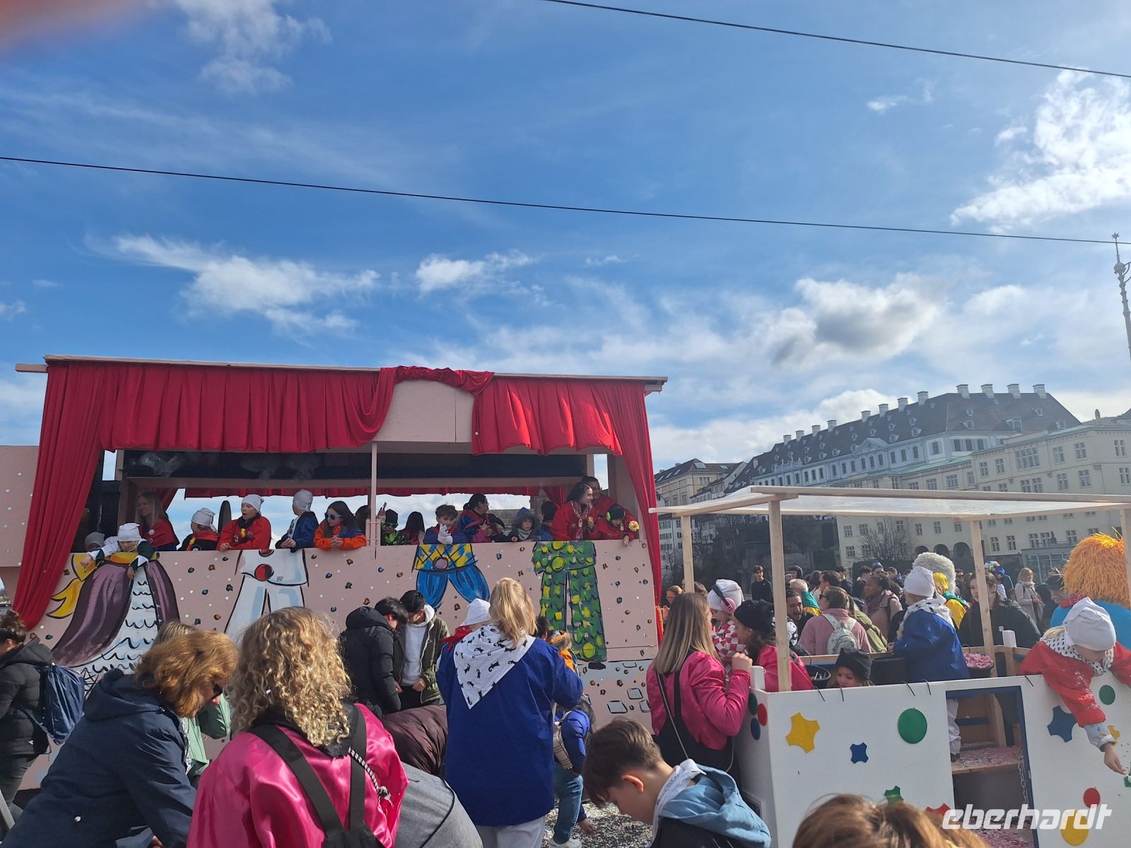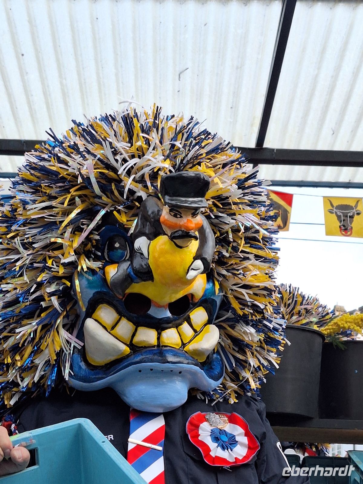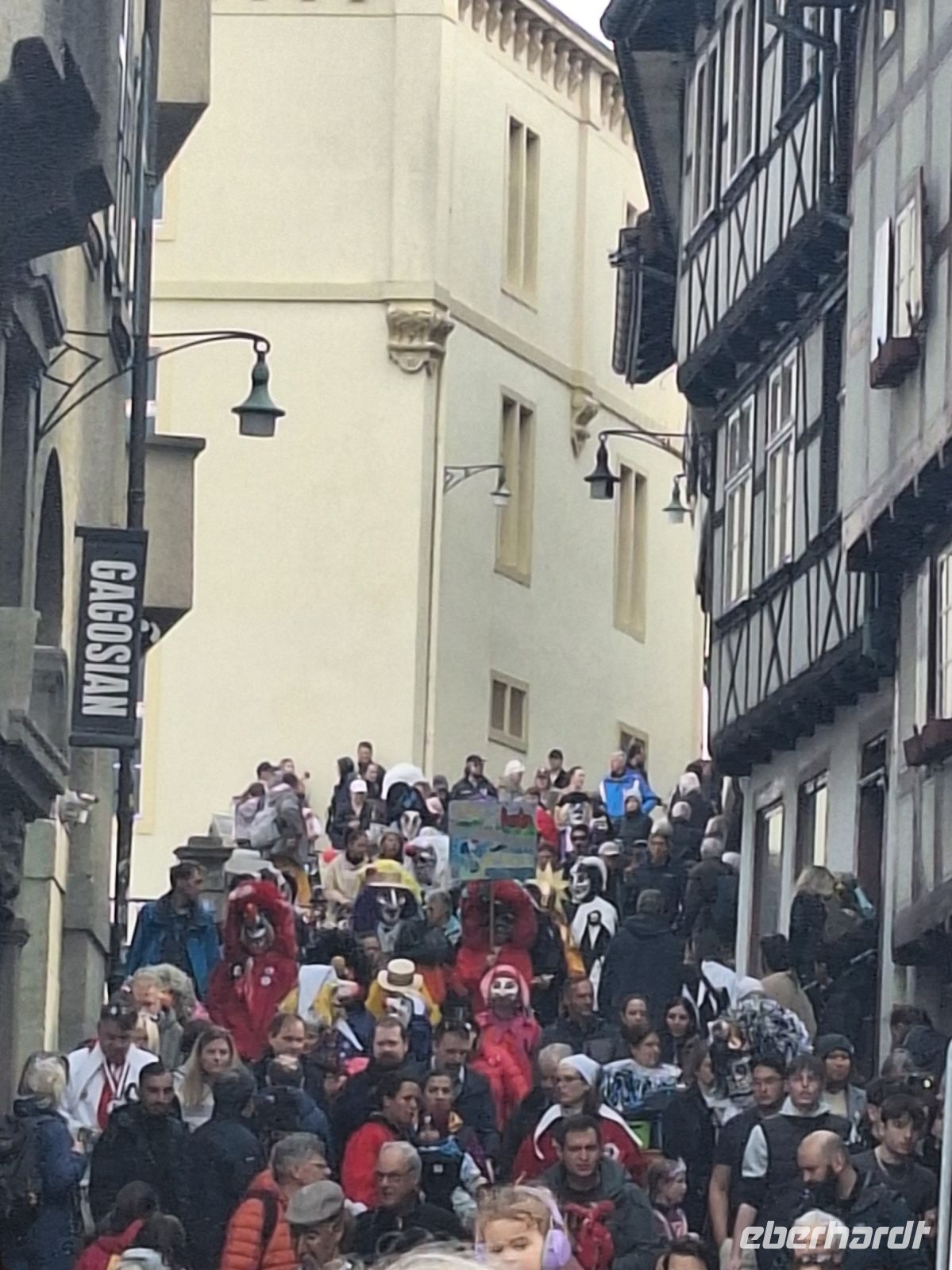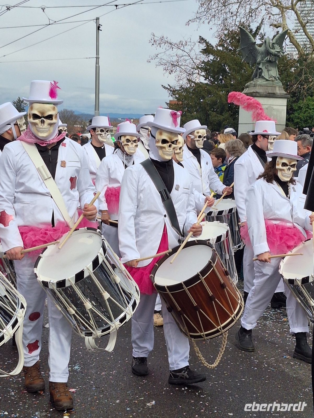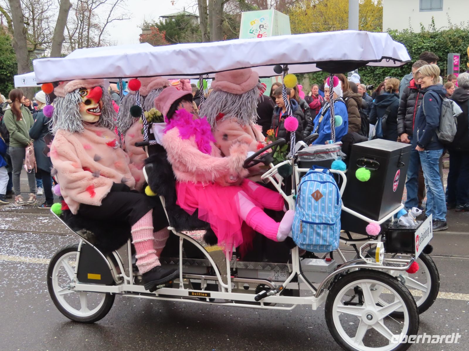 Am Vormittag erwartet uns ein weiterer Höhepunkt. Auf dem Münsterberg vor dem Museum der Kulturen erwartet uns ein leidenschaftlicher Fasnächtler natürlich im Kostüm. Er nimmt uns in der interessanten Ausstellung zur Basler Fasnacht auf besondere Art mit in die Welt und die Faszination der Fasnacht. Gespannt lauschen wir den spannenden Geschichten! Wir erfahren, dass die Kostüme für den Cortegè, den großen Umzug jeder Fasnächtler jedes Jahr neu anfertigt, dass zum Morgenstraich und am Dienstag zur Kinderfasnacht alle in selbst gewählten Kostümen unterwegs sind. Sehr erstaunt sind wir darüber, dass die Fasnacht durch die Cliquen selbst finanziert werden. Der Verkauf der Plaketten ist dabei ein wichtiger Beitrag. Es gibt keinerlei Zuschüsse von der Stadt oder anderen Sponsoren. Deshalb ist es möglich, dass verschiedenste, auch unbequeme Themen als Sujet – Thema durch die Cliquen gewählt werden können. Wir erfahren, wie die Larven – die Masken – hergestellt werden, wie eine Trommel gebaut ist und die Bedeutung der verschiedenen Figuren, die wir immer wieder in den einzelnen Cliquen entdecken. Es war ein sehr kurzweiliger Besuch. Den weitern Tag nutzen wir zum Bummeln durch die engen Gassen der Altstadt. Hier sind heute die unterschiedlichsten Gruppen unterwegs. Überall treffen wir die fröhlichen Fasnächtler. Guggemuusig, Piccollos und Trommler – die ganze Stadt ist erfüllt mit den Fasnachtsklängen und heute voll in der Hand der Familien und Kinder. Sie formieren sich in einen eigenen großen Umzug. Auch dabei bleibt es nicht aus, dass uns die Begeisterung erfasst, mit welcher die Basler ihre Tradition pflegen und schon als Kinder mitwirken dürfen. In viel Liebe und Fantasie oft selbst gestalteten Kostümen und kleinen Wägelchen nehmen sie am Umzug teil. Sie verteilen ihre Dääfeli (Bonbons) und bewerfen sich gegenseitig und manchmal auch die Zuschauer mit Räppli (Konfetti). Es ist einfach herrlich.