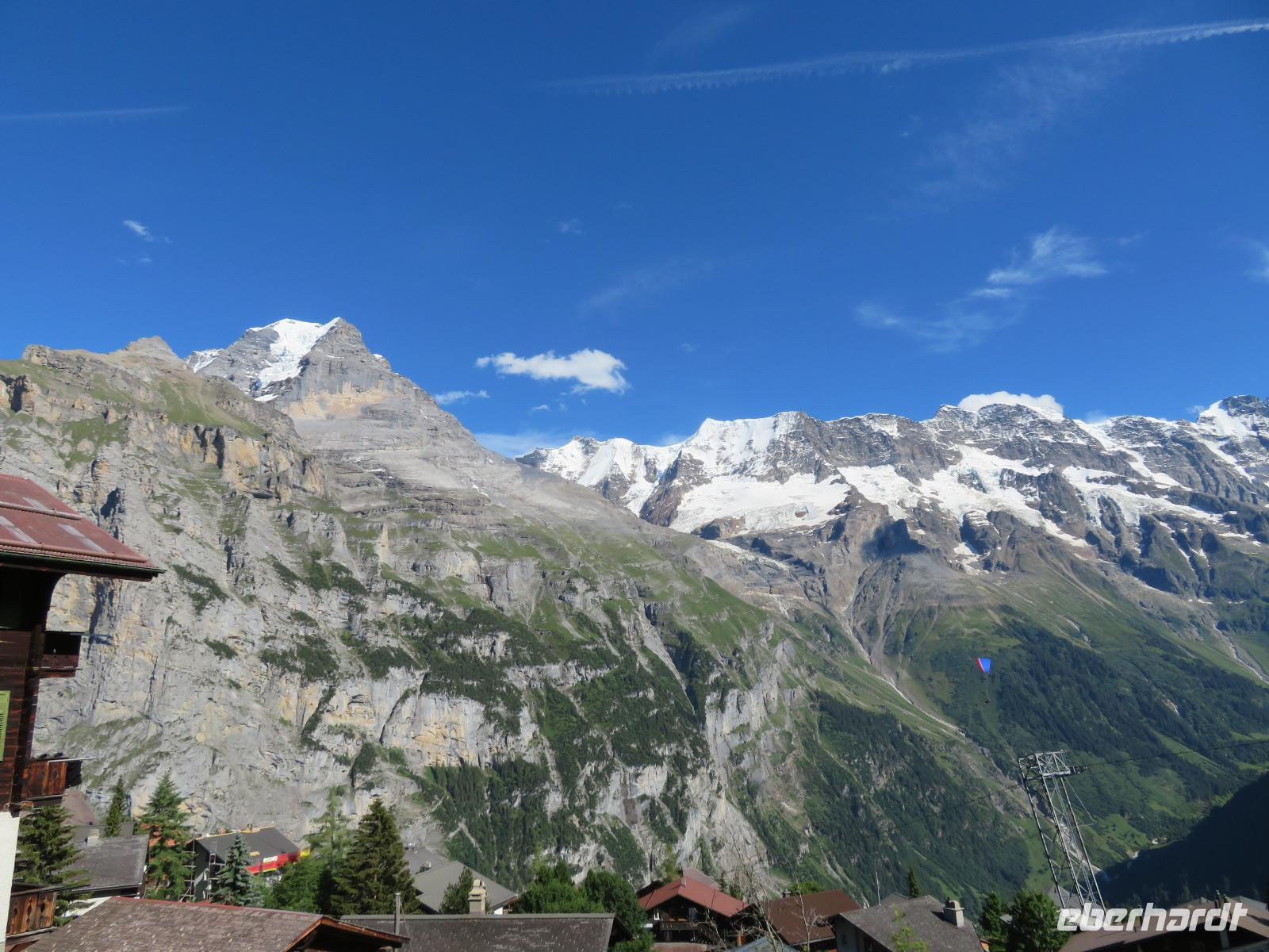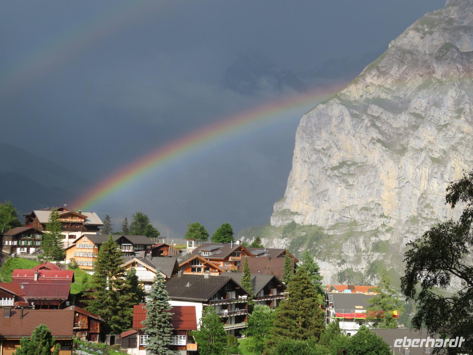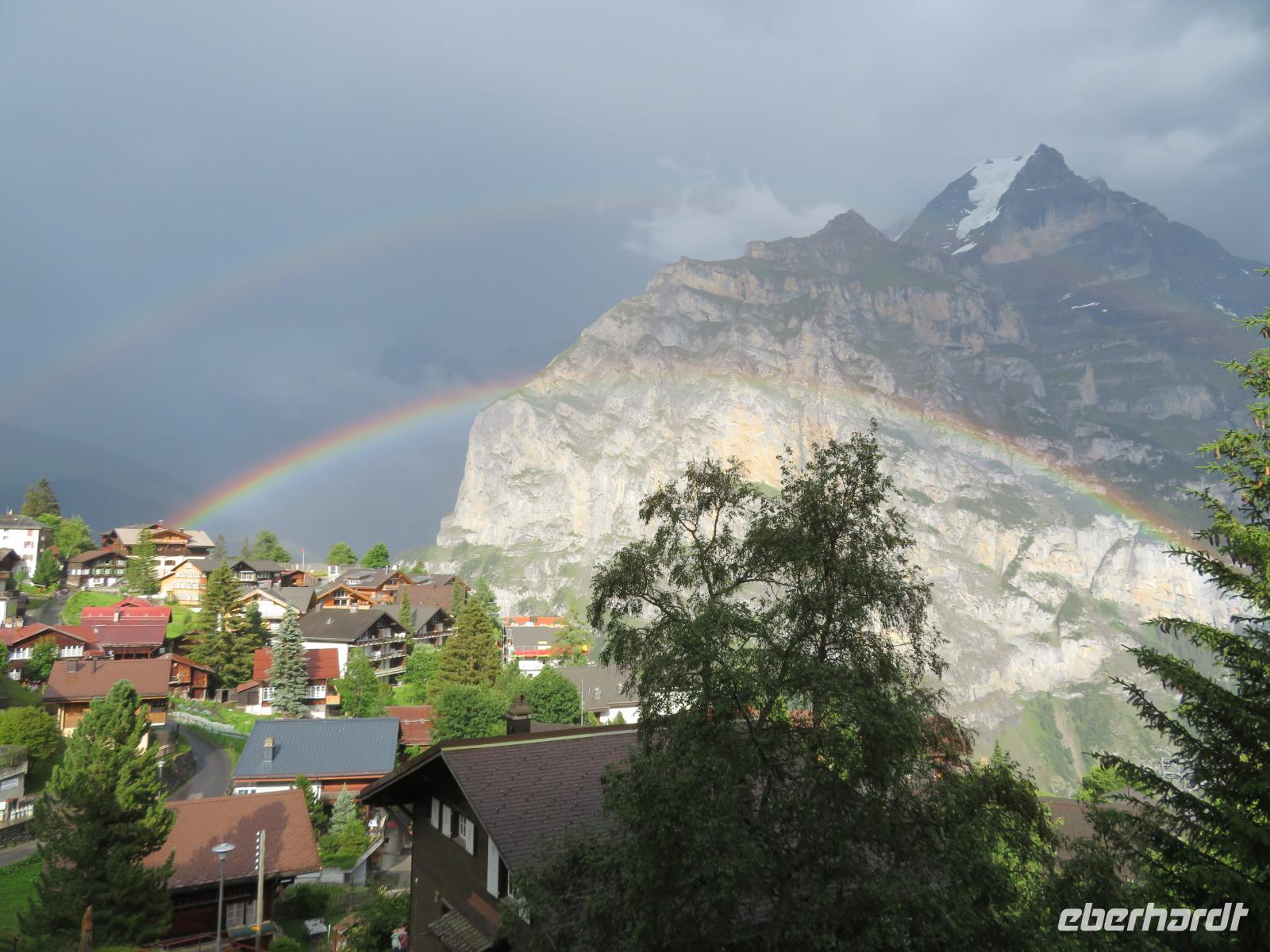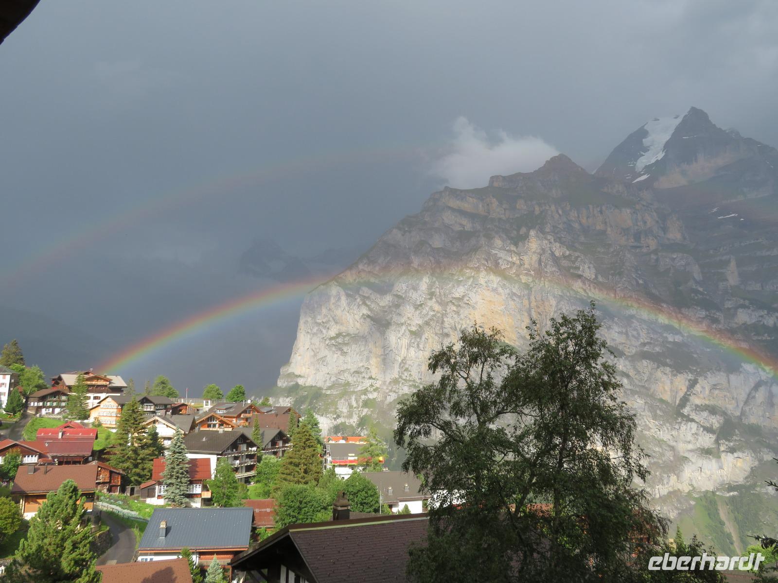 Ein Tag in geheimer Mission erwartet uns. Heute geht es auf das 2.970 Meter hohe Schilthorn, wo vor über 50 Jahren der bekannte James Bond Film „On Her Majesty´s Secret Service" gedreht wurde. Gefrühstückt wird heute auch nicht im Hotel, sondern in dem 360 Grad Panorama Restaurant auf dem Schilthorn. Ein vorzügliches Essen mit einer atemberaubenden Aussicht auf Eiger, Mönch, Jungfrau und sogar auf den Mont Blanc. Wie kann man besser in den Tag starten? Nach dem Frühstück erkunden wir natürlich die „Bond World" und den „007 Walk of Fame". Wir konnten viele interessante Dinge über den Dreh und die Geschichte des Films lernen. Im Kino kann man sich sogar Teile des Filmes anschauen. Bond Aktion, wie sie im Buche steht. Auf den Aussichtspunkten haben wir die Möglichkeit großartige Blicke auf die umliegende Bergwelt der Berner Alpen und das Mittelland zu erhaschen. Wer nach dem Besuch der Bond World Lust auf Aktion und Adrenalin bekommen hat, kann den Thrill Walk gehen. Eine Brücke direkt an der Felswand und unter den Füßen 100 Meter bis zum Boden. Nichts für schwache Nerven. Im Anschluss fahren wir mit der Bahn wieder nach Mürren, wo wir uns eine Stunde von Ausruhen konnten. Danach geht es auf den Allmendhubel auf 1.907 Meter. Hier genießen wir noch einmal die herrliche Aussicht auf die Bergwelt und gehen über den Flower Trail - den Blumenweg. Dieser Weg bietet uns über 150 verschiedene Bergblumenarten. Im Anschluss geht es wieder zurück zum Hotel und wir genießen gemeinsam unser hervorragendes Abendessen. Am Abend bietet sich uns noch ein einmaliges Naturschauspiel. Nach einen starken Regenguß erblicken wir zwei riesige Regenbögen vor der von der Sonne beleuchteten Felswand.
