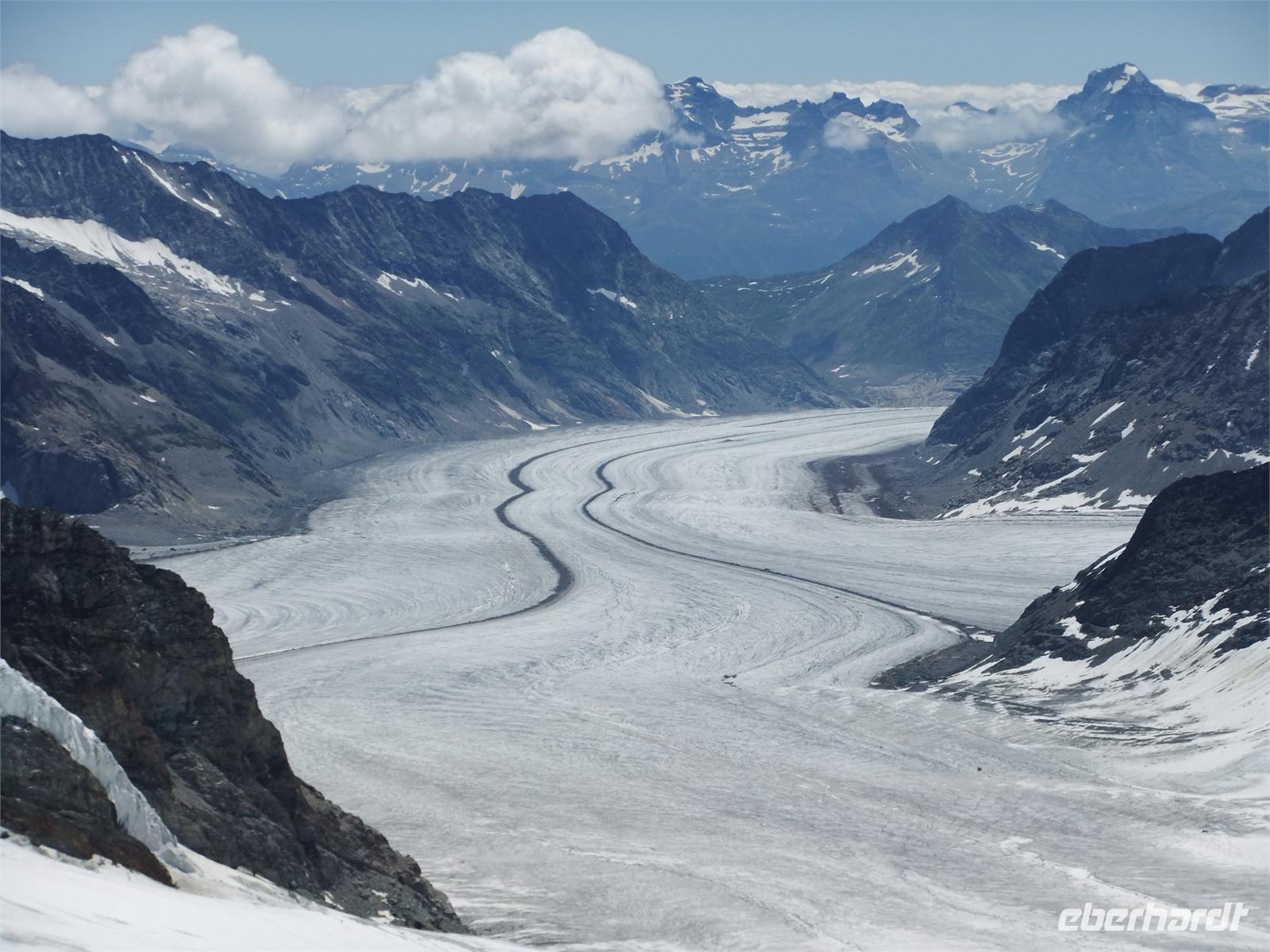 Bei strahlend blauem Himmel genießen wir einen beeindruckenden Blick auf die Bergwelt der Viertausender und auf den mit 24 km längsten Gletscher der Alpen, den Aletschgletscher. Einige Gäste "ergattern" sogar einen Liegestuhl im Schnee und nehmen ein Sonnenbad. Natürlich besuchen wir auch noch den Eispalast mit den Eisskulpturen teif im Gletscher. Nach drei Stunden treffen wir uns alle wieder am Bahnhof und fahren zurück zum Hotel. Nach einem wunderschönen Tag werden wir im Hotel mit einen Gala-Dinner verwöhnt.