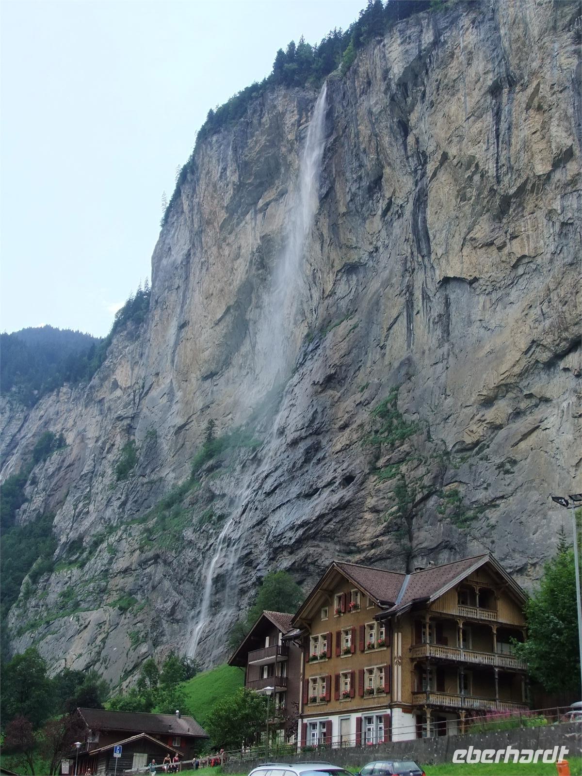 Da der Nieselregen aufgehört hat, besuchen wir den Alpengarten. Er wurde 1927 angelegt und zeigt Pflanzen, die oberhalt der Waldgrenze vorkommen, insgesamt rund 600 Arten. Wir entdecken u.a. Edelweiß, Gelben Enzian, Rote Felsenprimel, Silberdisteln, Alpenanemonen und Alpenrosen. Nach einer Einkehr im Berghotel geht es in gemütlichen Tempo mit der Nostalgie-Bahn wieder nach Wilderswill. Wilfried bringt uns mit dem Bus ins Lauterbrunnental, wo wir noch die Trümmelbachwasserfälle besuchen. Das sind zehn Gletscherwasserfälle im Berginneren, mit einem Tunnellift zugänglich gemacht und beleuchtet. Bis zu 20000 Liter Wasser pro Sekunde stürzen hier herab - ein beeindruckendes Erlebnis.