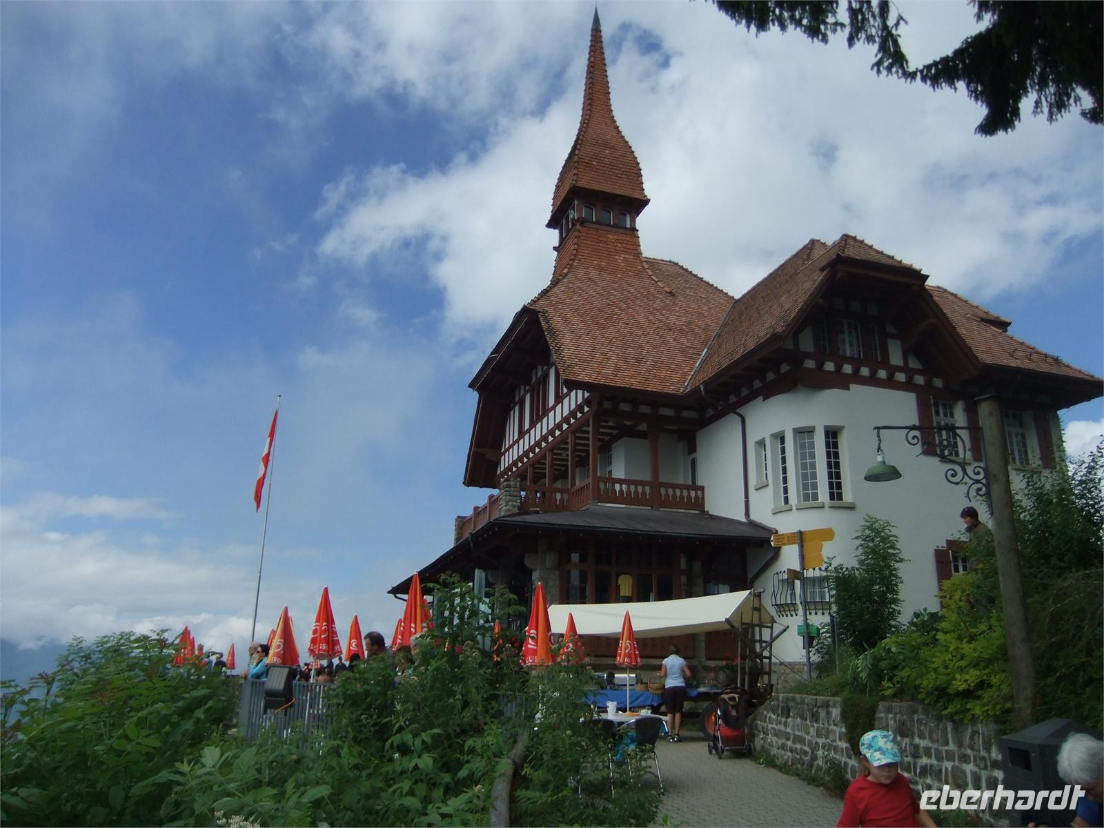 All die Tage hat uns die Sonne sehr verwöhnt, doch heute ist der Himmel wolkenverhangen und es nieselt. Trotzdem machen wir uns auf nach Wilderswill. Von hier unternehmen wir einen "Fahrt in die Vergangenheit". Eine historische Bergbahn bringt uns mit 12 km/h hinauf zur Schynige Platte. Nach genau 7,25 km und einer 52minütigen Fahrt haben wir die Bergstation auf einer Höhe von 1967 m erreicht. Leider ist die Aussicht heute nicht so toll, nur der Thuner See lässt sich ab und an sehen.