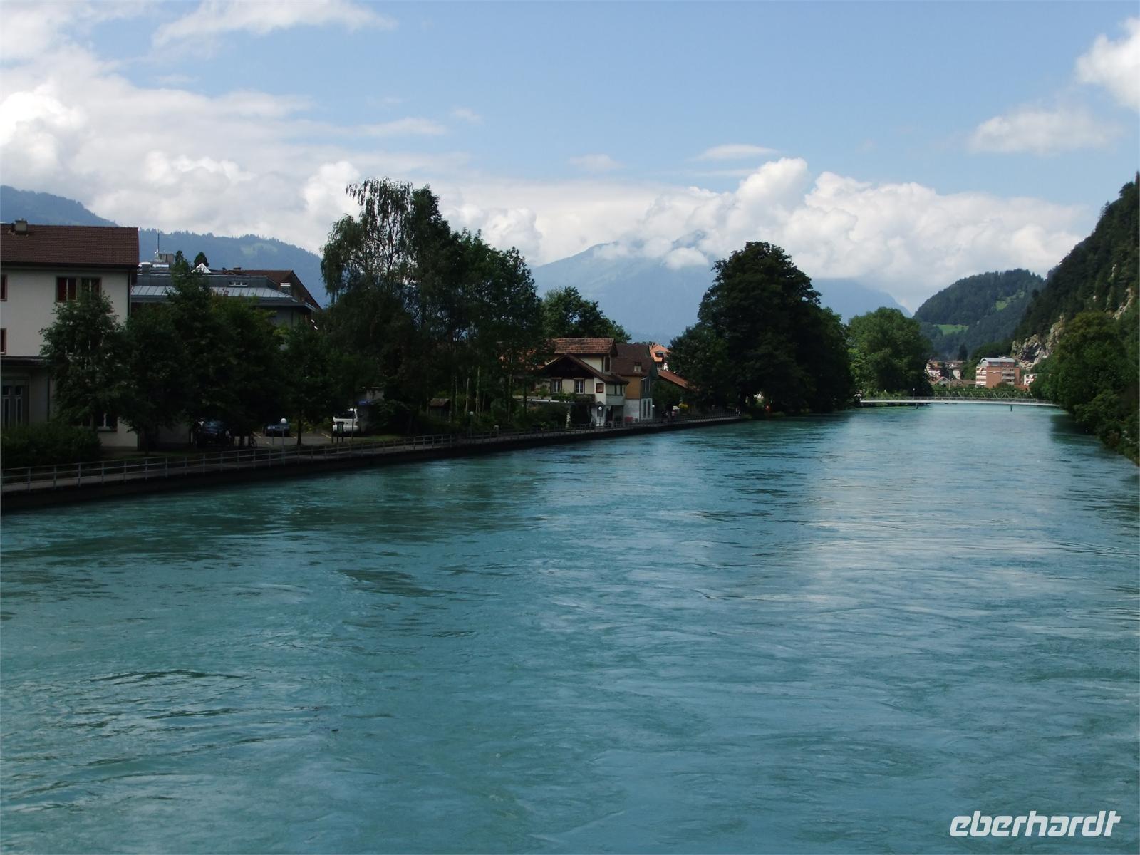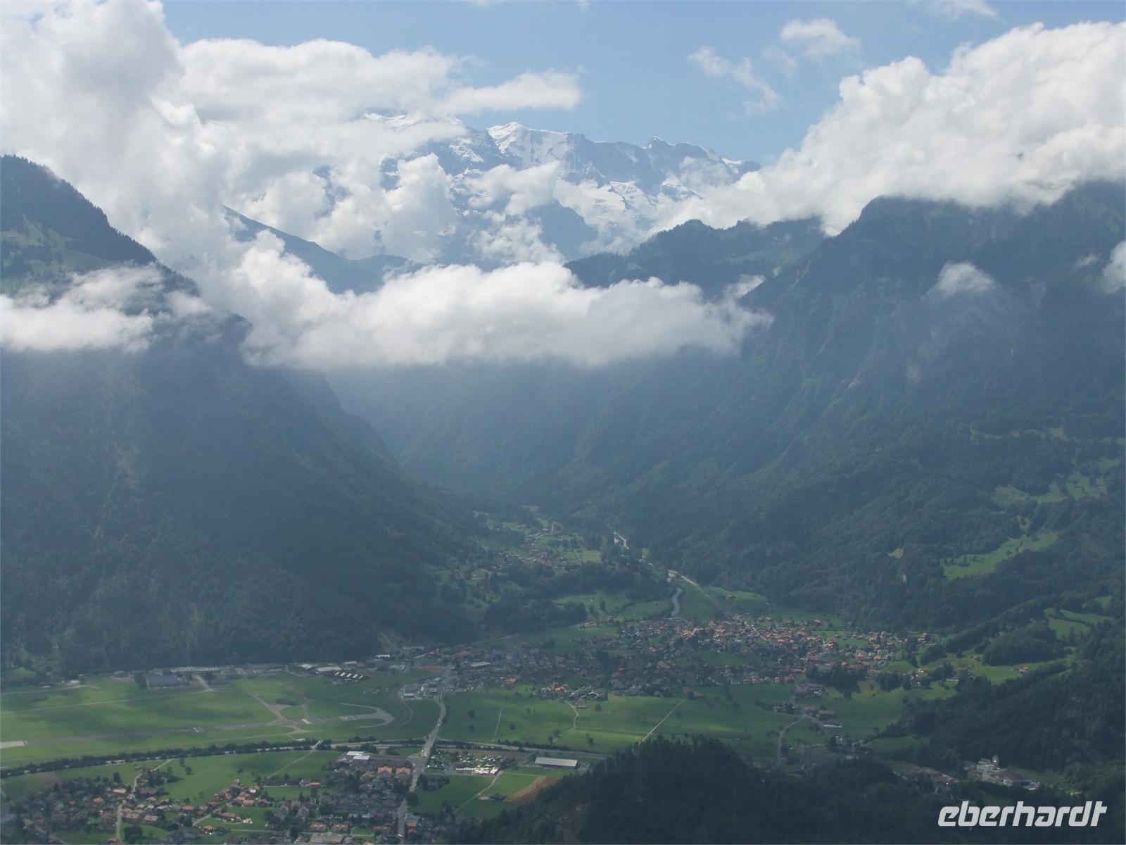 Danach fahren wir mit der Standseilbahn in acht Minuten auf den 1306 m hohen Harder Kulm. Noch hüllt sich die Umgebung in dicke Wolken, doch unsere Geduld wird bald belohnt: Die Wolkendecke reißt auf und wir haben einen schönen Blick auf Interlaken, den Thuner See und das Dreigestirn Eiger, Mönch und Jungfrau. Wieder zurück in Interlaken bleibt noch Zeit für individuelle Erkundungen. Wir spazieren auf dem "Höheweg" und besuchen den Kurpark. Am Nachmittag fahren wir mit dem Bus zurück nach Lauterbrunnen und mit dem Zug weiter nach Wenden. Hier ist heute Dorffest und so können wir vor dem Abendessen noch dem Festumzug, den Alphornbläsern und den Fahnenschwingern zuschauen.