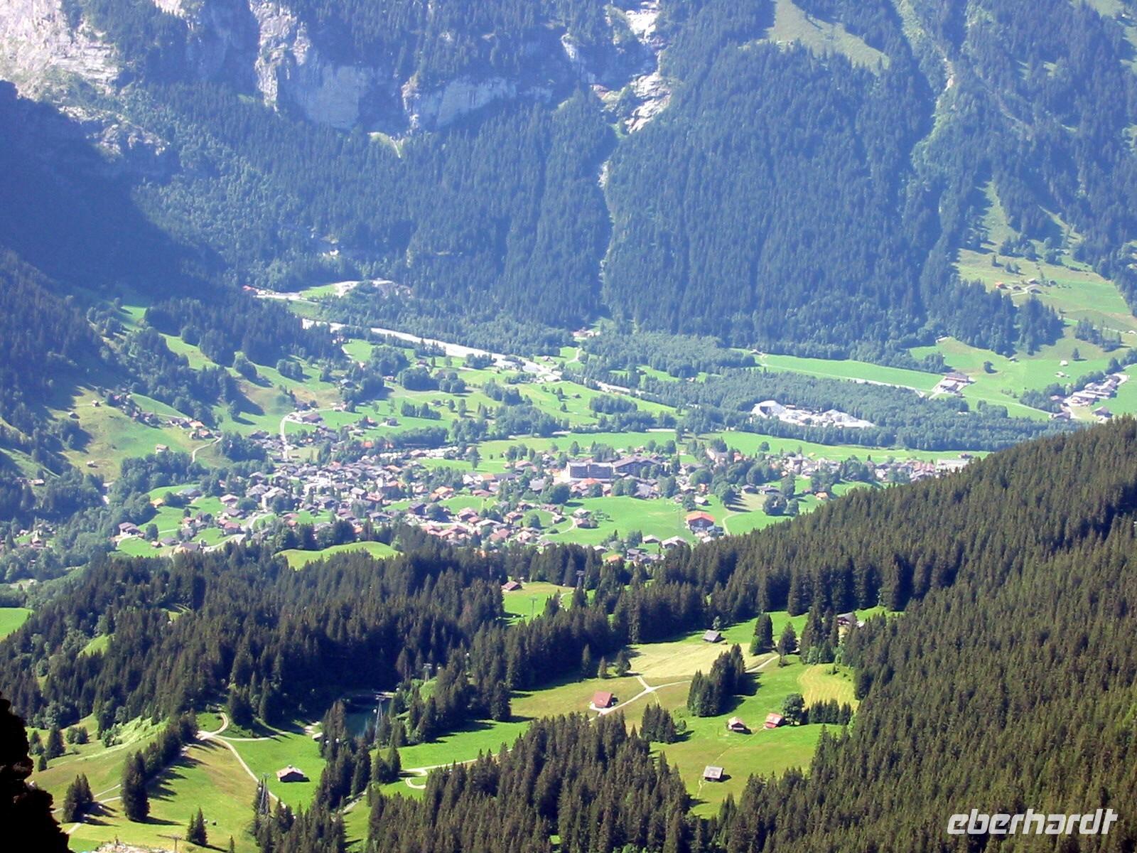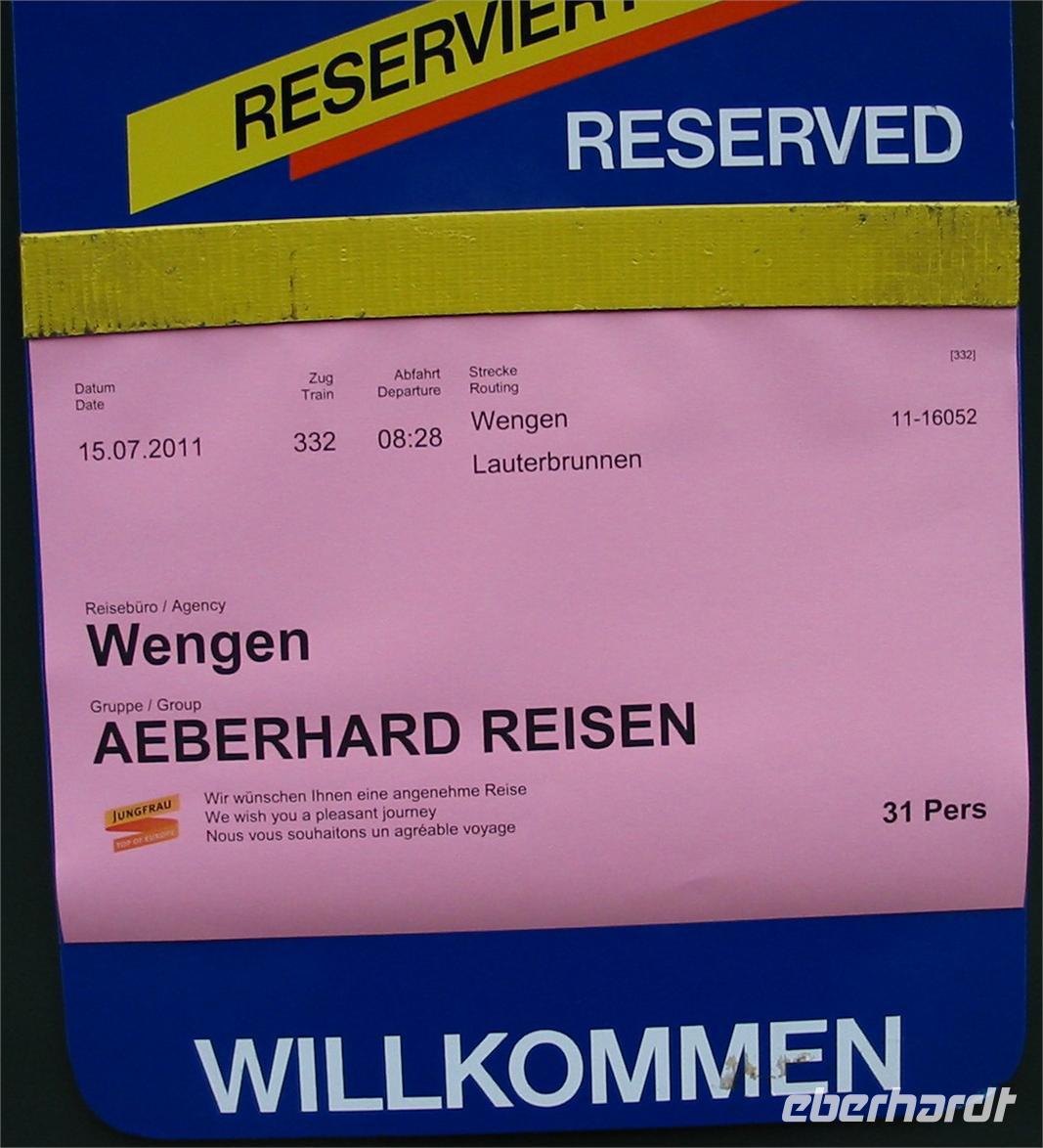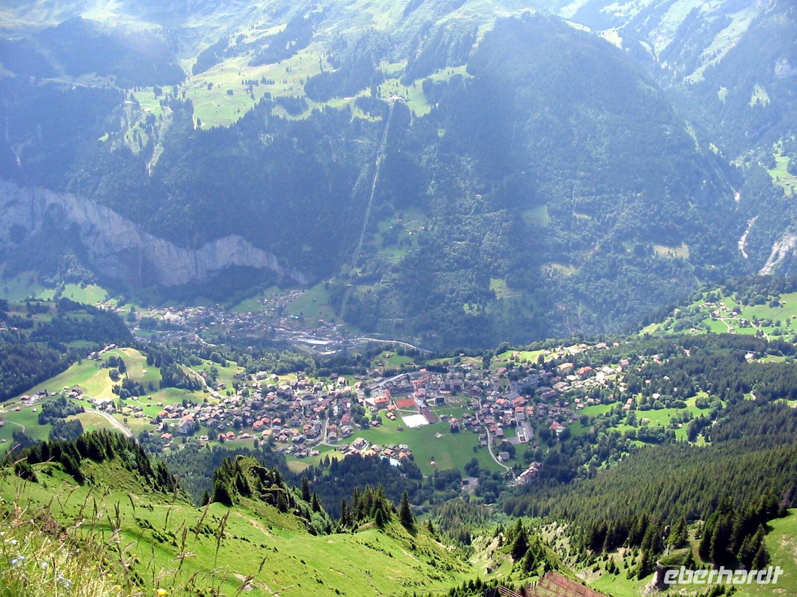 Jungfraubahnen-Pass und mit der örtlichen Wanderleiterin Doris wurden alle Termine abgestimmt. Unser heutiges Ziel ist Interlaken mit dem Harder Kulm. Der Zug bringt uns wieder bis Lauterbrunnen und hier wartet Bernd bereits mit seinem Bus auf uns. Wir haben Sonnenschein, wolkenlosen Himmel und schon früh ziemliche Hitze.