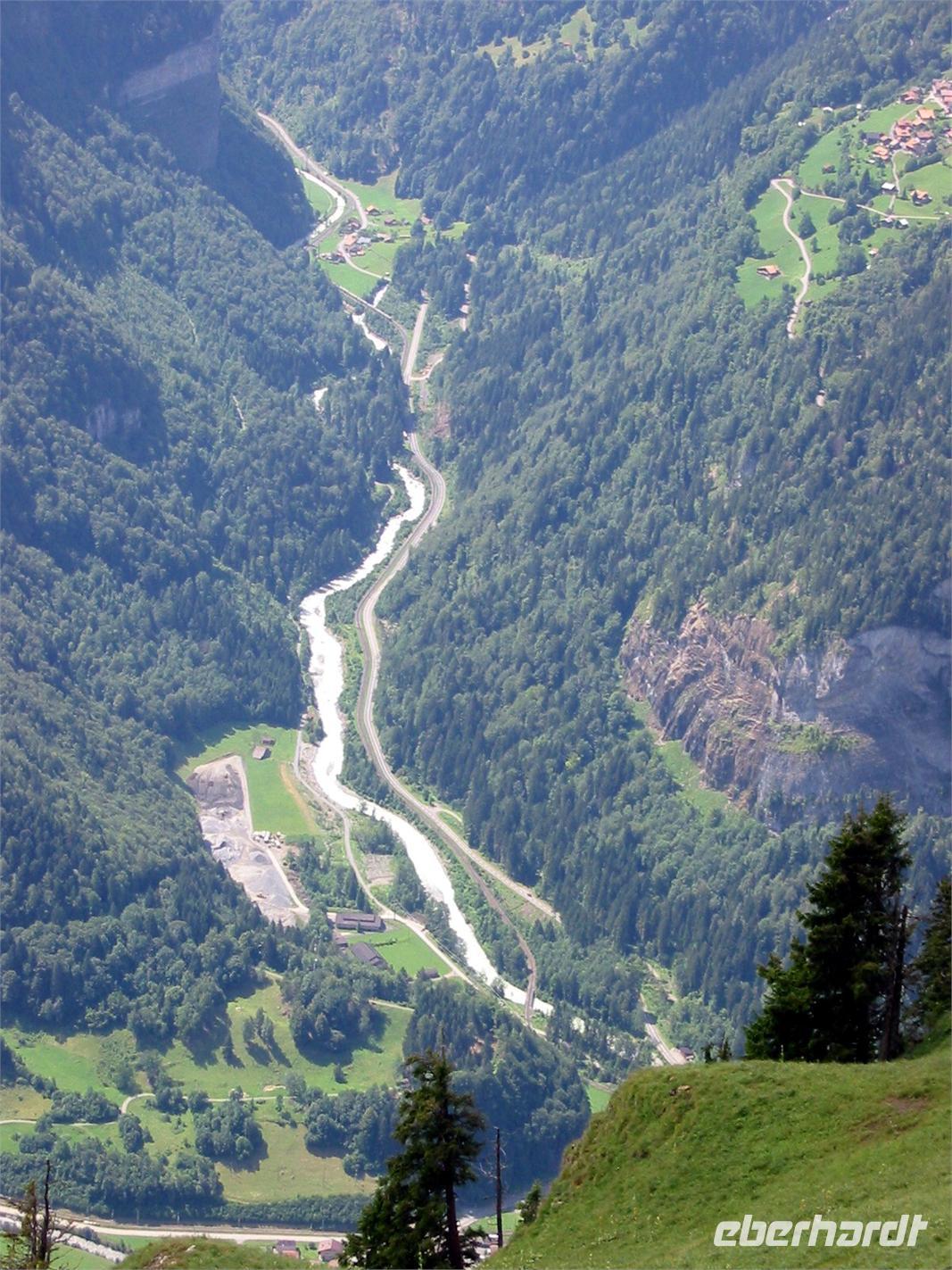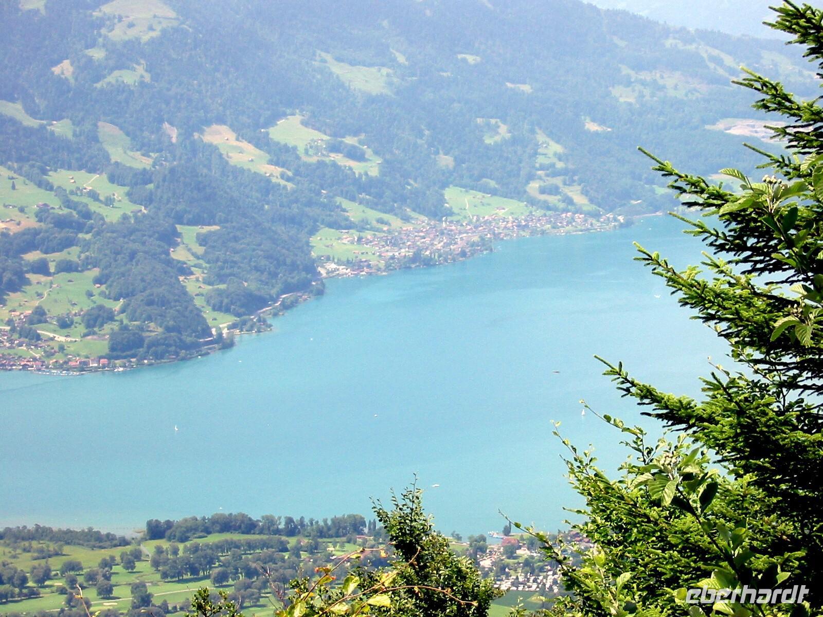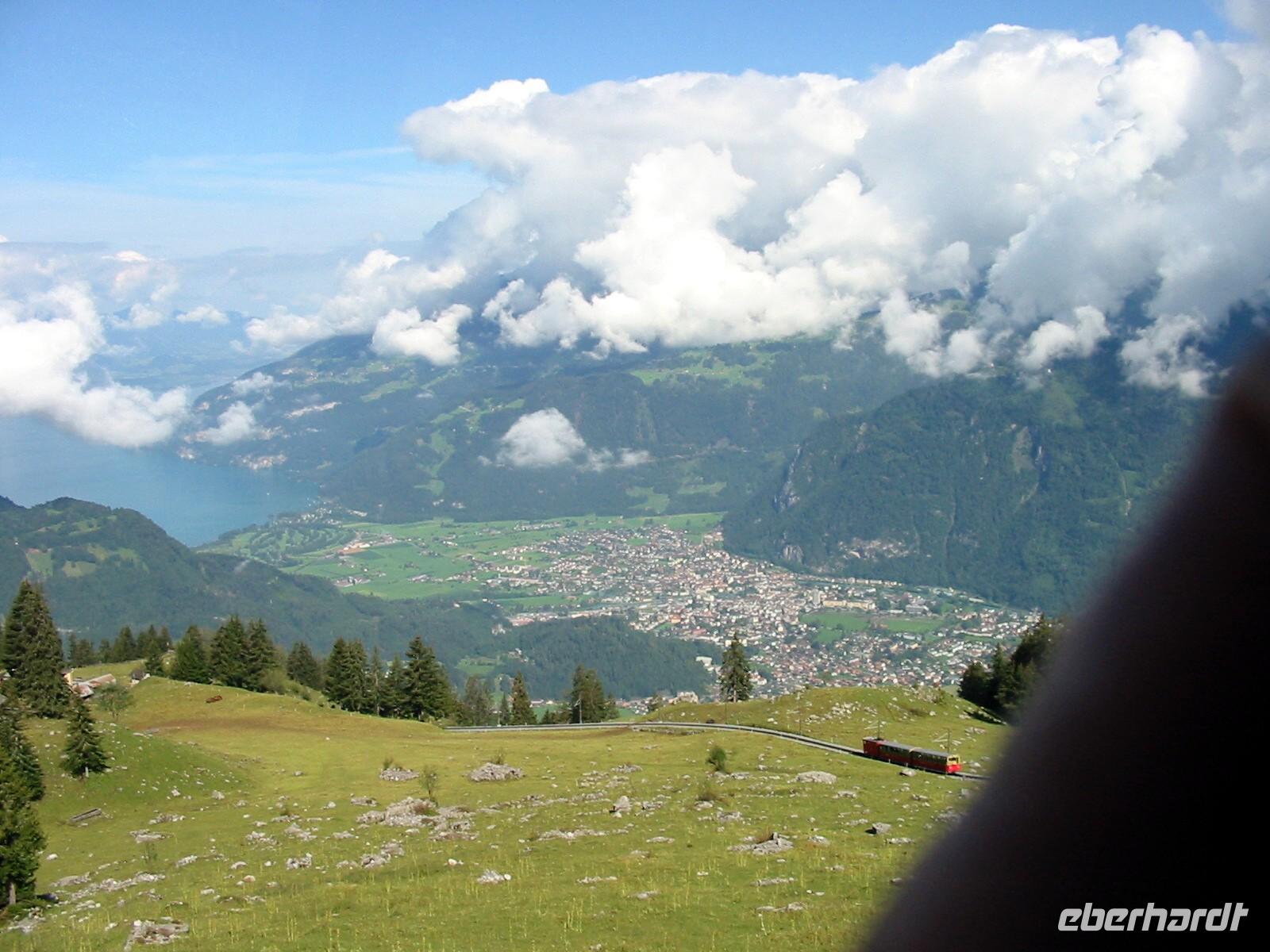 In Interlaken-West steigen wir aus und da wir bis zur Abfahrt der Harder-Kulm-Bahn noch Zeit hatten, spazierten wir an der Aare entlang über ein Wehr bis nach Interlaken-Ost zur Talstation der Bahn. 10 Minuten dauert die Fahrt mit der Standseilbahn. Auf den Harder Kulm. Schon während der Fahrt lag Interlaken und zu Füßen und wurde immer kleiner, je höher wir kamen. Auch den Brienzer- und den Thuner See konnten wir von oben bewundern. Aber den schönsten Anblick boten uns Eiger, Mönch und Jungfrau mit ihren schneebedeckten Gipfeln.