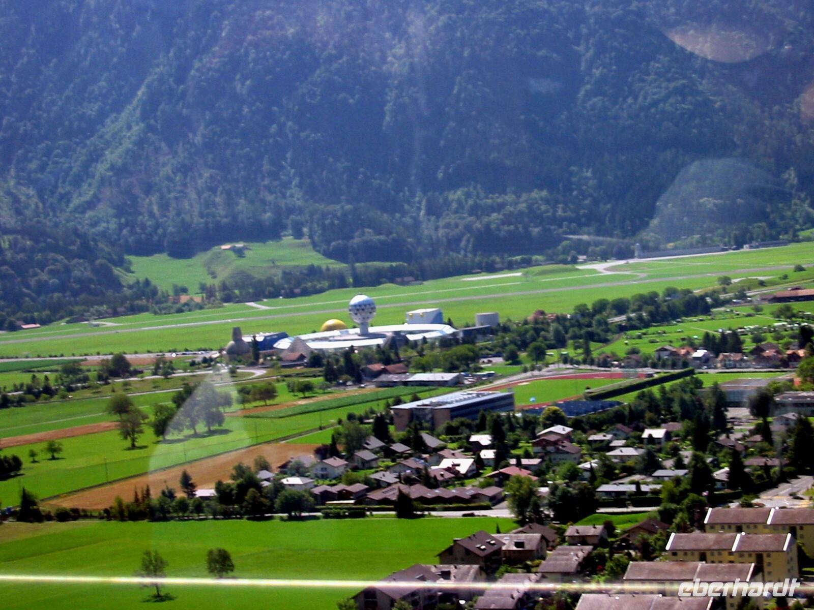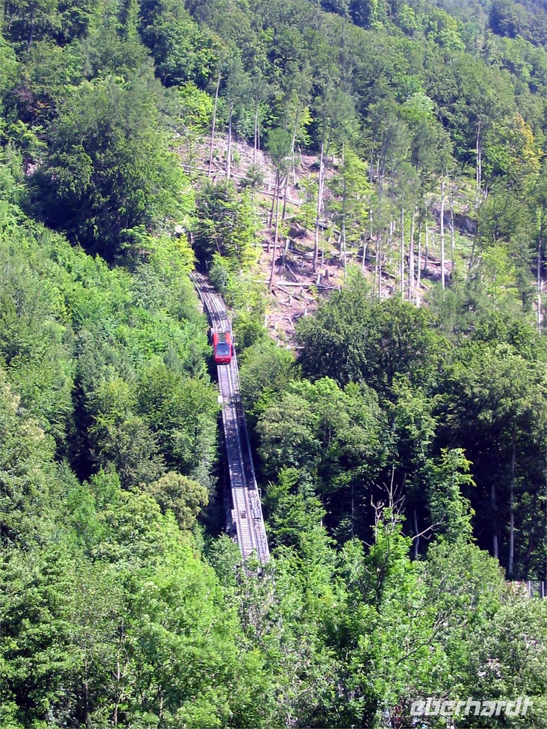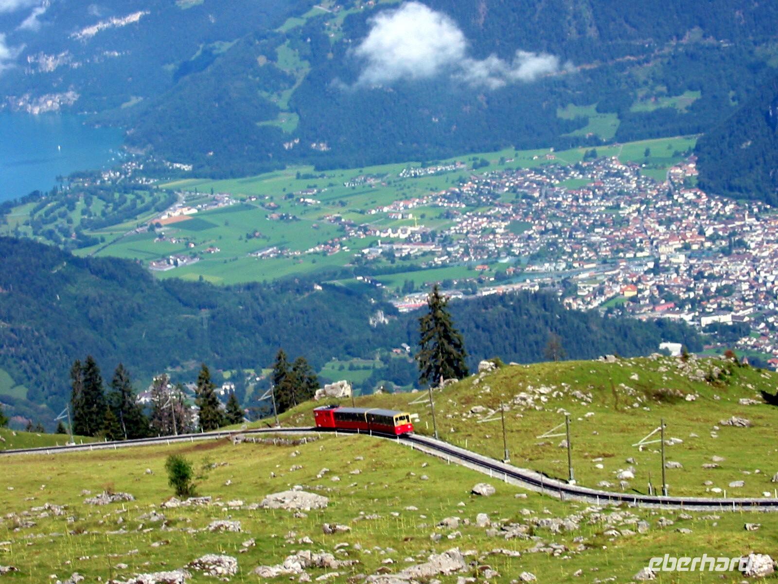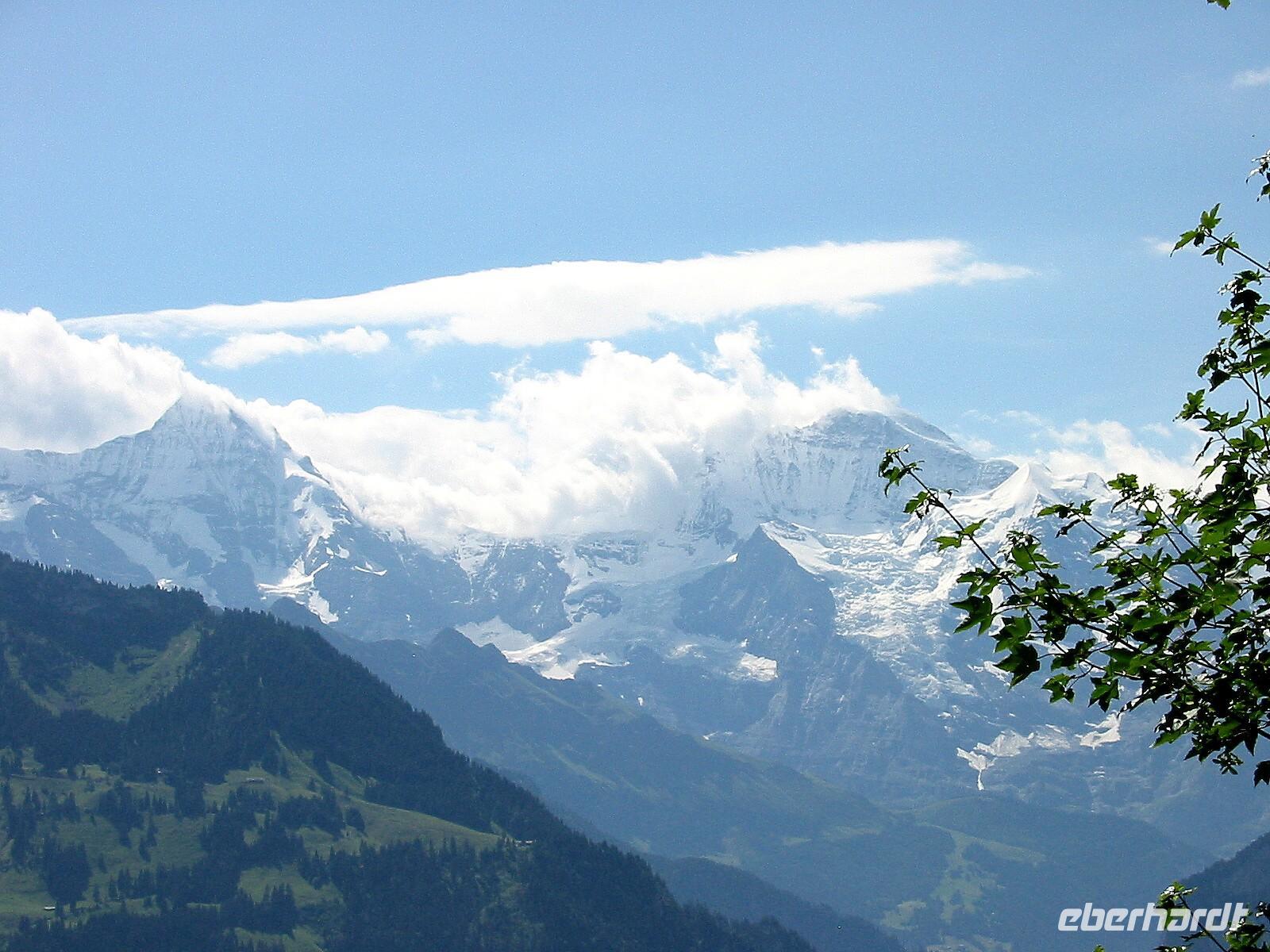 In Interlaken-West steigen wir aus und da wir bis zur Abfahrt der Harder-Kulm-Bahn noch Zeit hatten, spazierten wir an der Aare entlang über ein Wehr bis nach Interlaken-Ost zur Talstation der Bahn. 10 Minuten dauert die Fahrt mit der Standseilbahn. Auf den Harder Kulm. Schon während der Fahrt lag Interlaken und zu Füßen und wurde immer kleiner, je höher wir kamen. Auch den Brienzer- und den Thuner See konnten wir von oben bewundern. Aber den schönsten Anblick boten uns Eiger, Mönch und Jungfrau mit ihren schneebedeckten Gipfeln.