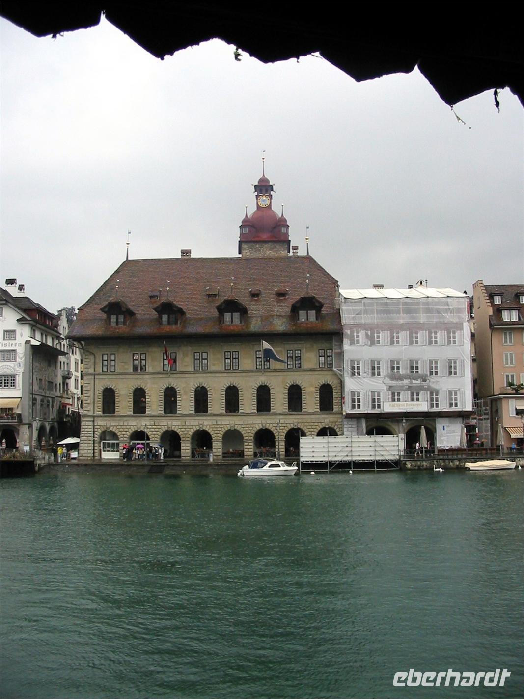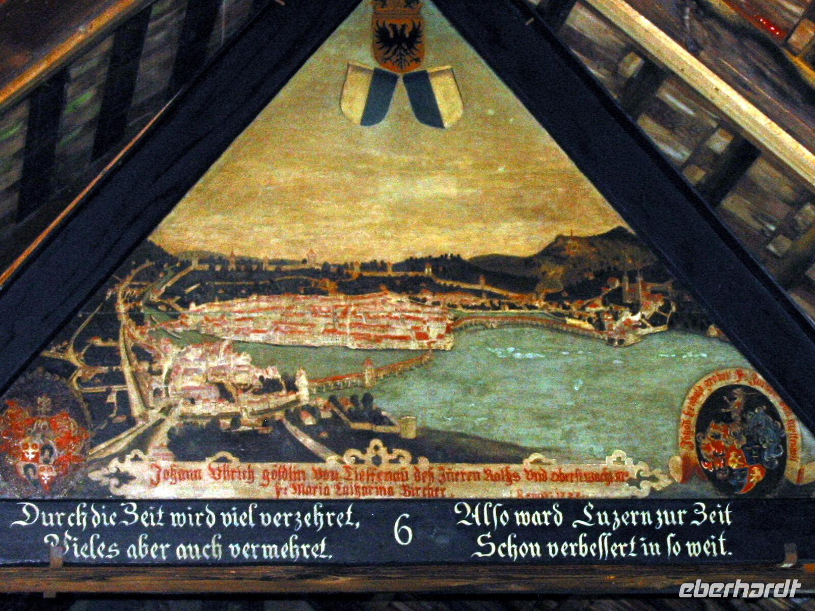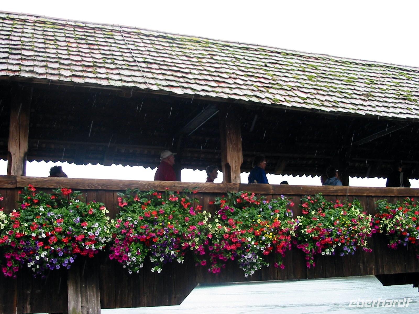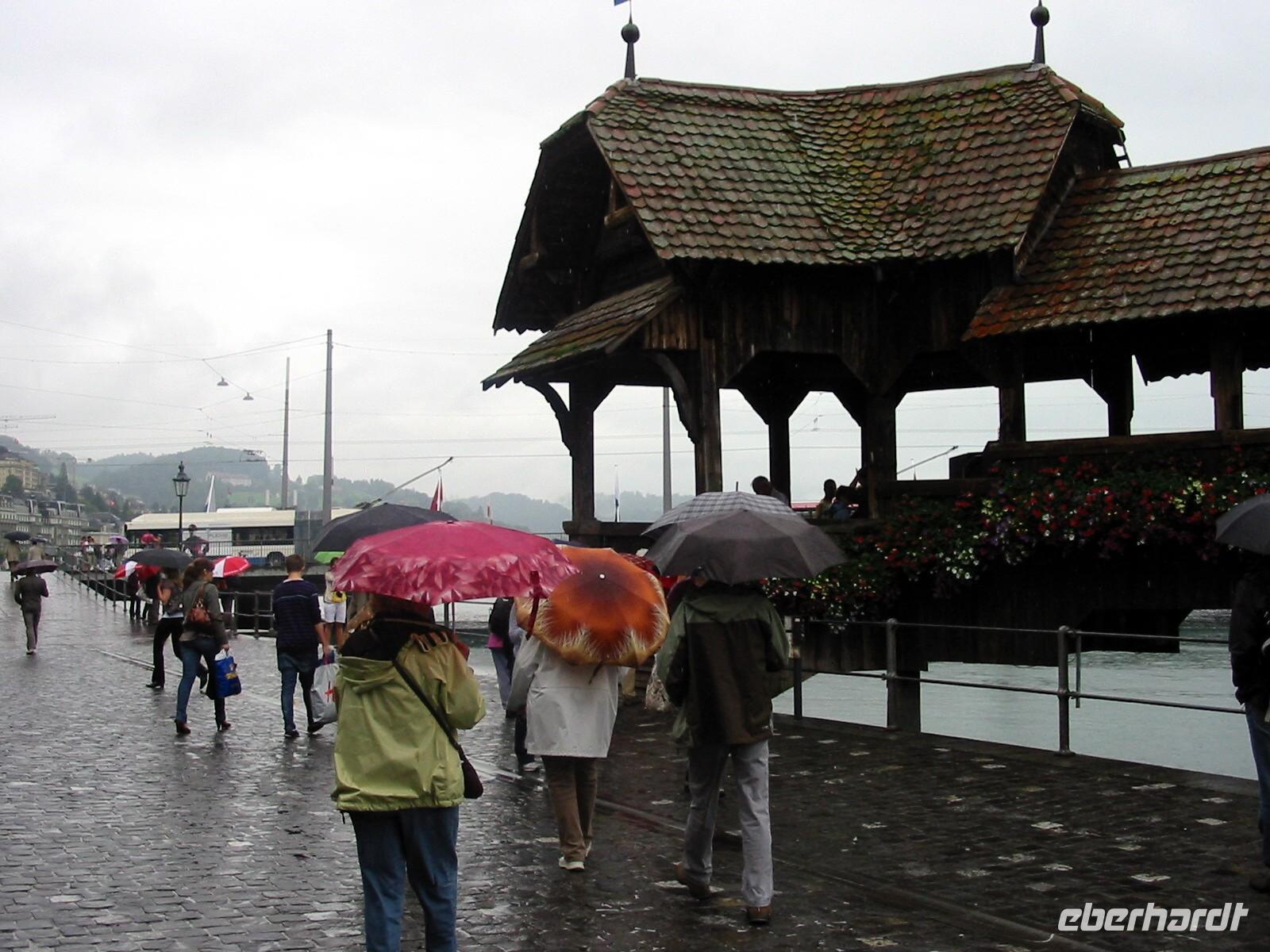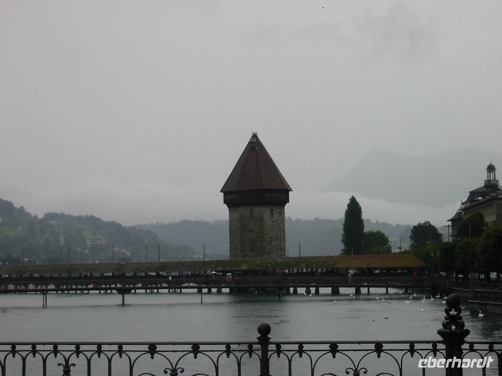 Nach der Besichtigung der Altstadt kamen wir zur Kappelbrücke, dem Wahrzeichen von Luzern. Die Brücke selbst brannte 1993 nieder und wurde nachher komplett wiederaufgebaut. Allerdings sind die bekannten Malereien innerhalb der Brücke verloren gegangen. In der Mitte der Brücke thront der Wasserturm.