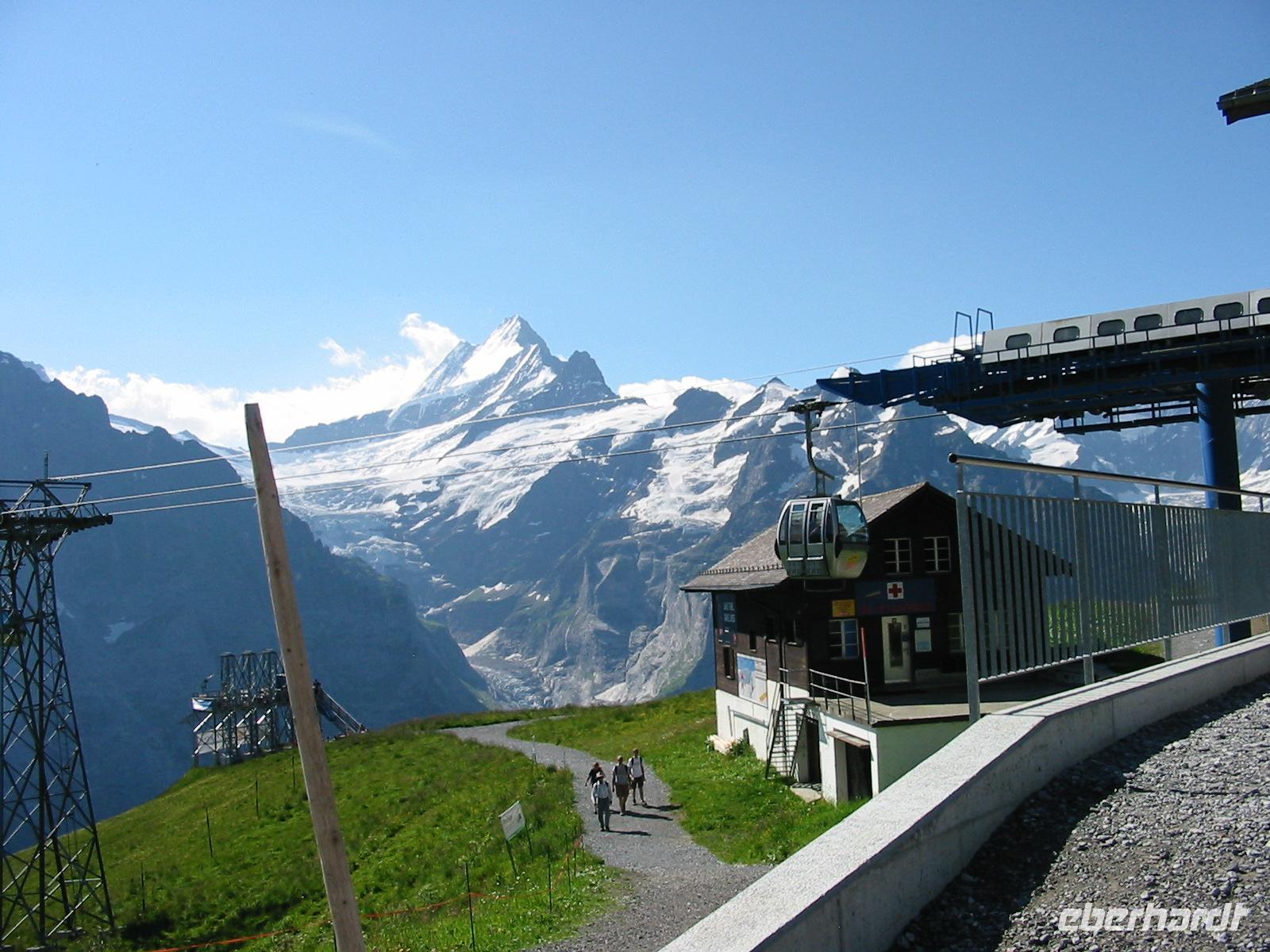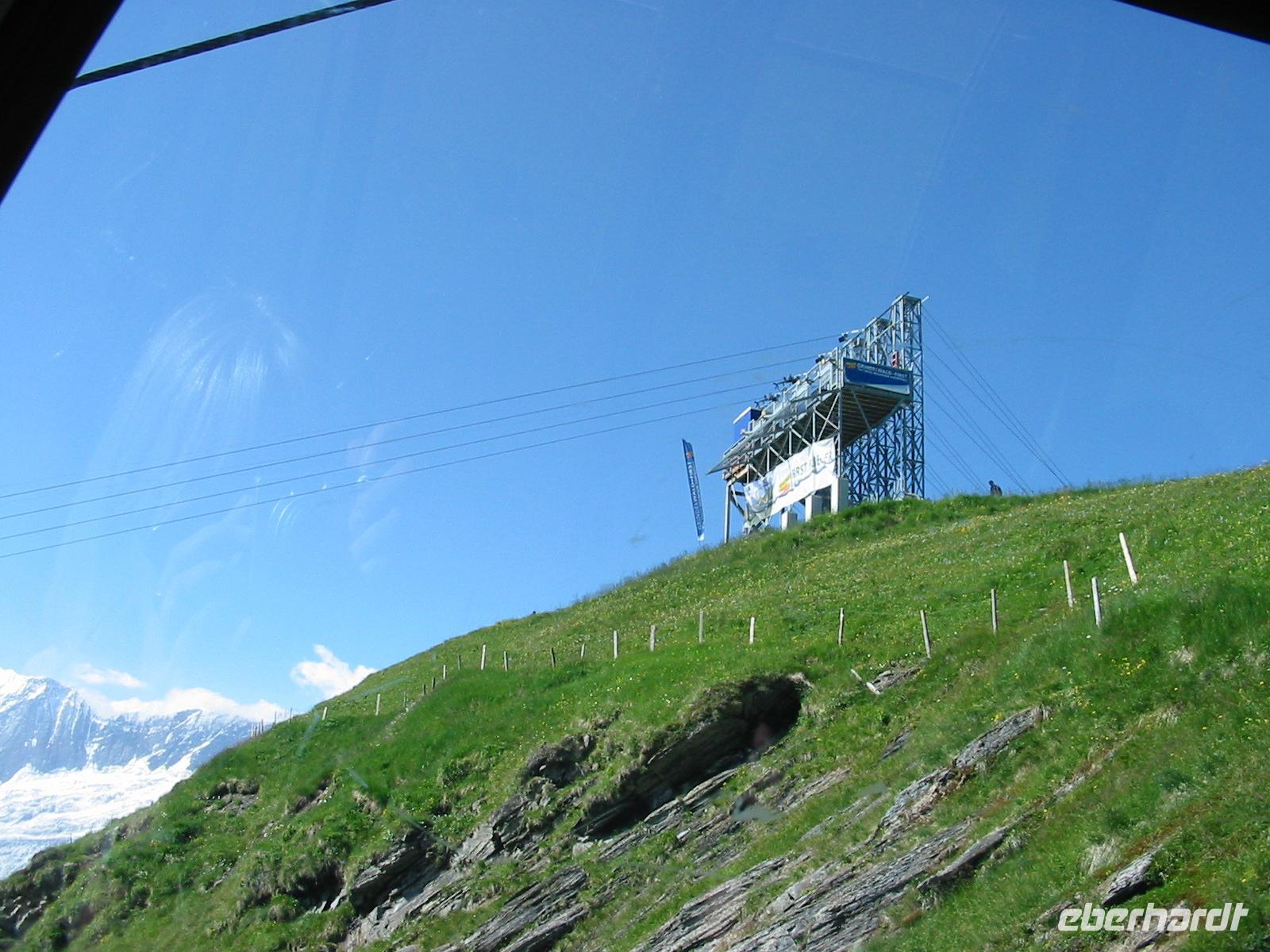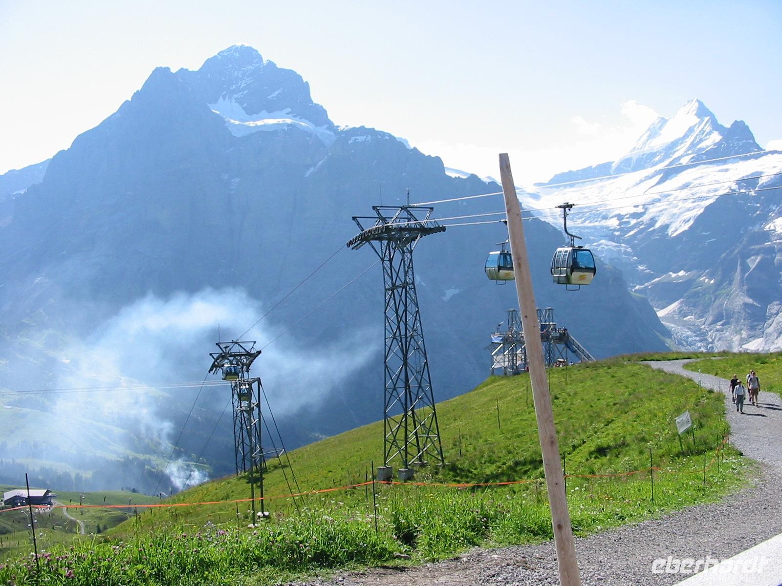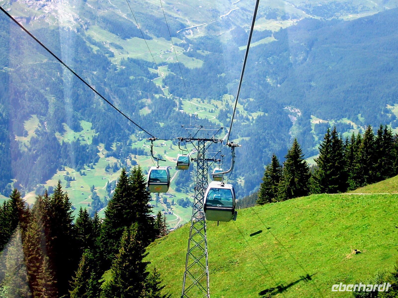 Von Grindelwald aus, kann man bequem hinauf zum First (2168 m) schweben. Mit einer Sechsergondelbahn, die über Bort und Schreckfeld zum First fährt, werden während der 25-minütigen Fahrt 5226 m Streckenlänge und 1100 Höhenmeter überwunden. Oben angekommen schweifte unser Blick über ein atemberaubendes Bergpanorama mit einigen der berühmtesten Berge der Welt. Sieben Viertausender, vom Schreckhorn bis zu Eiger, Mönch und Jungfrau begeisterten uns alle. Der First ist zu Recht als einer der schönsten Aussichtspunkte Europas bekannt und ein beliebter Startort für Paraglider und Deltasegler.