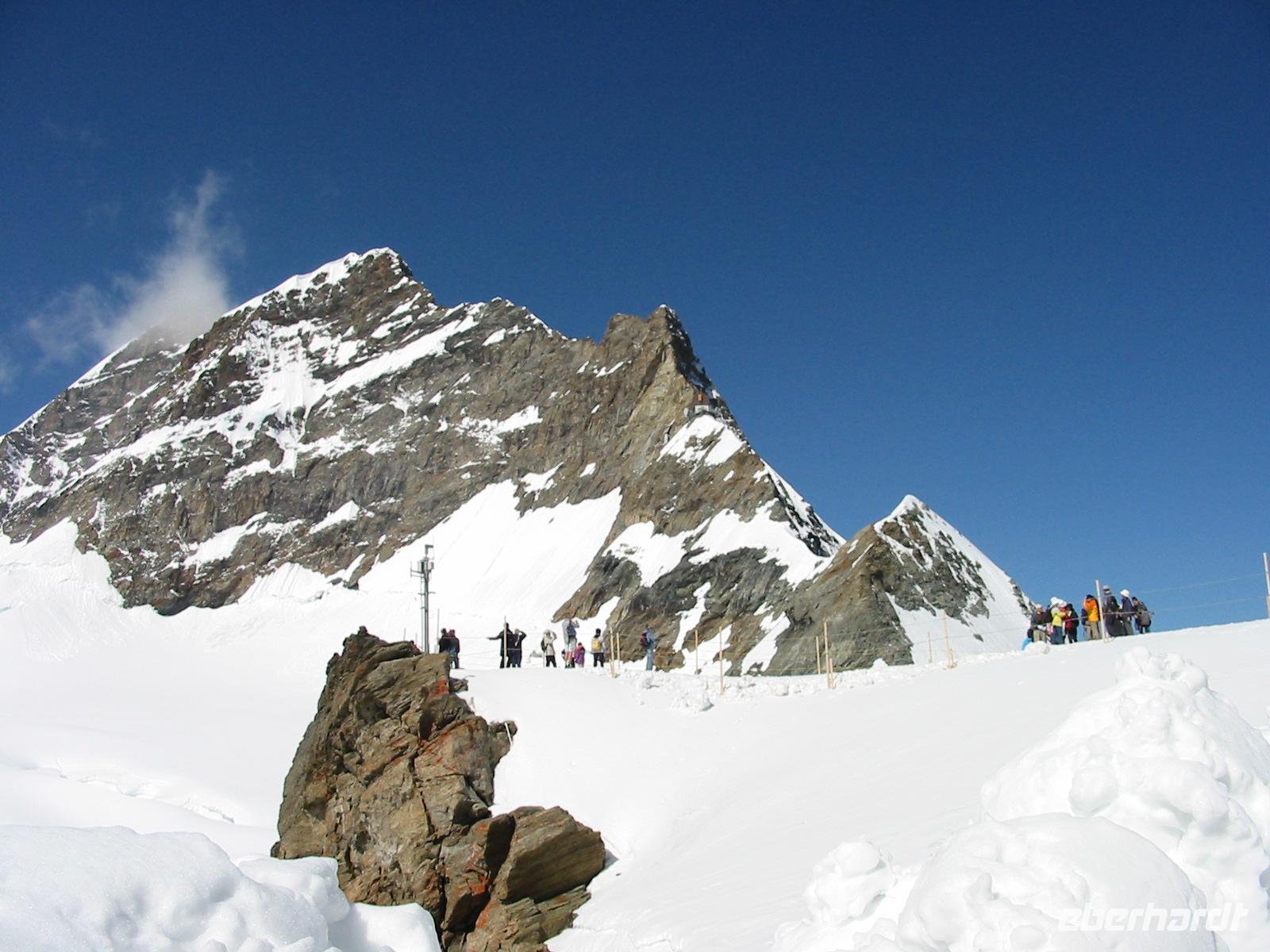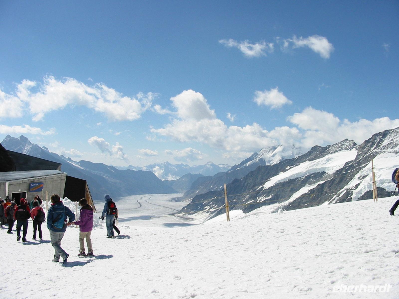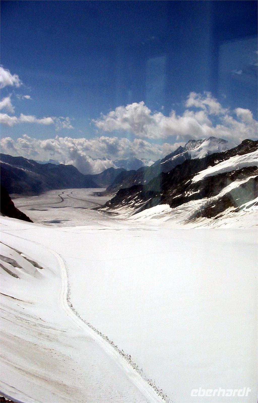 Mit einem Lift fuhren wir noch einmal 100 Meter höher zur Sphinx-Terrasse. Bei herrlichstem Sonnenschein erschloss sich uns von hier eine Welt aus Eis und Schnee, angefangen mit dem herrlichen Ausblick auf den Aletschgletscher.