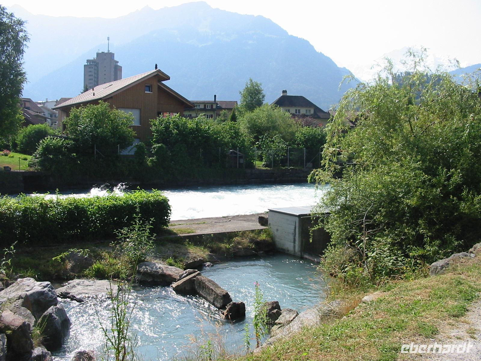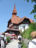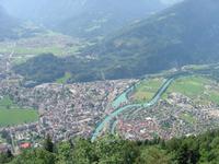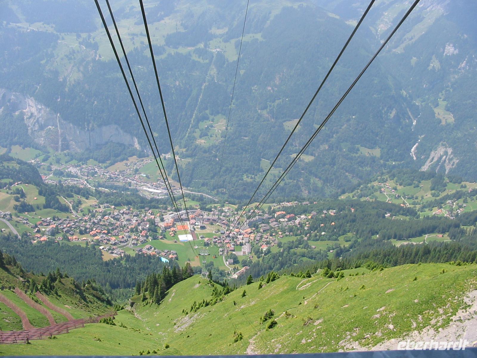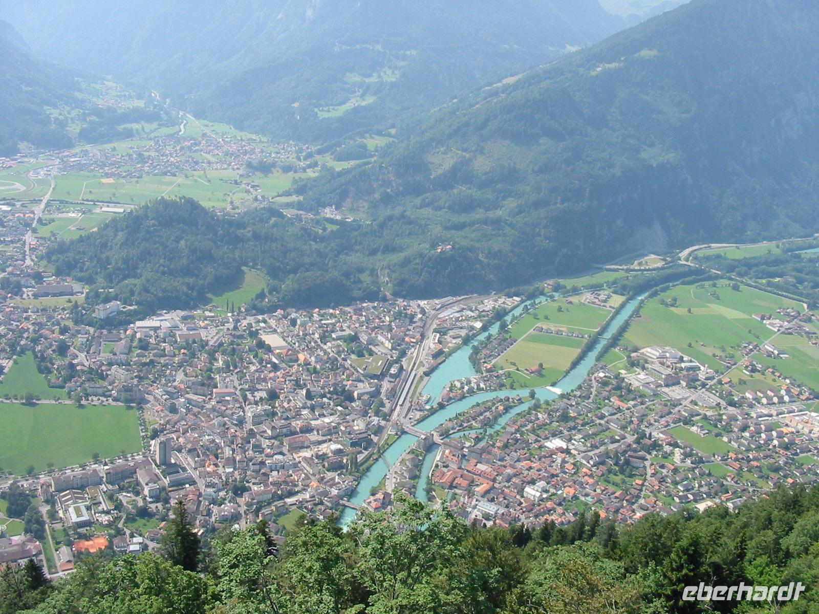 In Interlaken- West steigen wir aus und da wir bis zur Abfahrt der Harder- Kulm- Bahn noch Zeit hatten, spazierten wir an der Aare entlang , über ein Wehr , bis nach Interlaken- Ost zur Talstation der Bahn. 10 Minuten dauert die Fahrt mit der Standseilbahn. Schon während der Fahrt lag Interlaken uns zu Füßen und wurde immer kleiner, je höher wir kamen. Auch den Brienzer- und den Thuner See konnten wir von oben bewundern. Jeder traute sich auch auf den neu erbauten Zwei- Seen. Steg. Aber den schönsten Anblick boten uns Eiger, Mönch und Jungfrau mit ihren schneebedeckten Gipfeln.