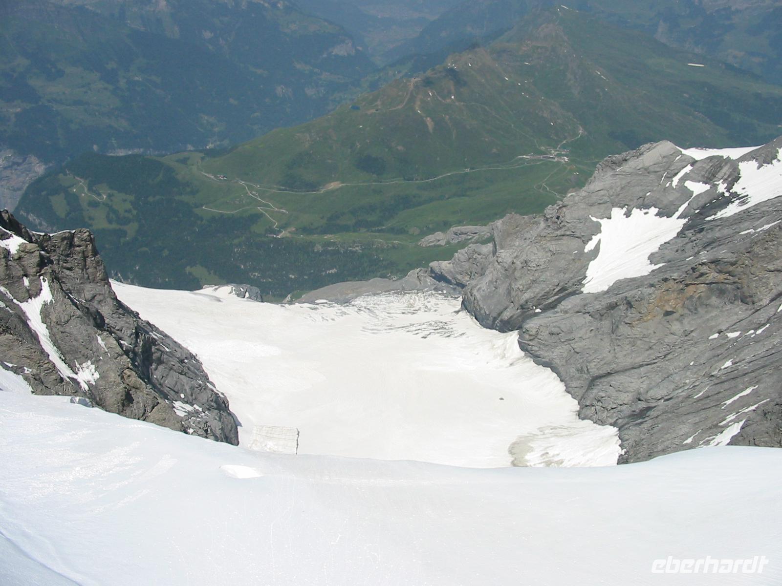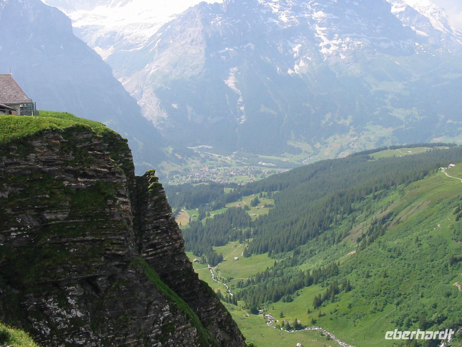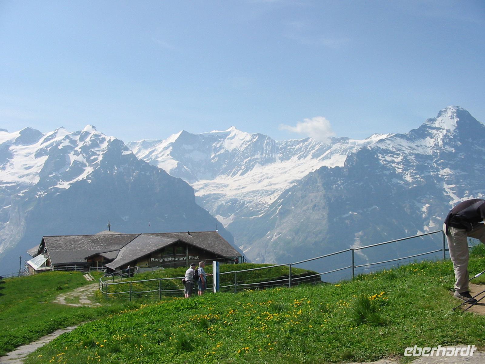 Von Grindelwald aus, kann man bequem hinauf zum First (2168 m) schweben. Mit einer Sechsergondelbahn, die über Bort und Schreckfeld zum First fährt, werden während der 25-minütigen Fahrt 5226 m Streckenlänge und 1100 Höhenmeter überwunden Oben angekommen schweifte unser Blick über ein atemberaubendes Bergpanorama mit einigen der berühmtesten Berge der Welt. Sieben Viertausender, vom Schreckhorn bis zu Eiger, Mönch und Jungfrau begeisterten uns alle. Der First ist zu Recht als einer der schönsten Aussichtspunkte Europas bekannt und ein beliebter Startort für Paragleider und Deltasegler.