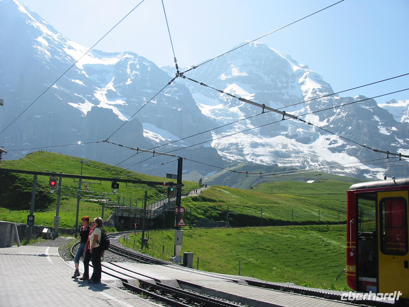 Die Jungfraubahn ist eine Zahnradbahn, die von der Kleinen Scheidegg durch Eiger und Mönch bis aufs Jungfraujoch führt. Sie überwindet dabei auf einer Länge von rund 9 Kilometer fast 1400 Höhenmeter. Etwas mehr als 7 Kilometer der Strecke liegen im Tunnel. Eine Fahrt dauert rund 50 Minuten. Aus Sicherheitsgründen verläuft ein großer Teil der Strecke im Fels. Bei den Zwischenstationen Eigerwand und Eismeer hielt der Zug fünf Minuten lang. Große Aussichtsfenster boten bereits ein unvergleichliches Panorama. Die Station Jungfraujoch ist die höchstgelegene Bahnstation Europas (Top of Europe).