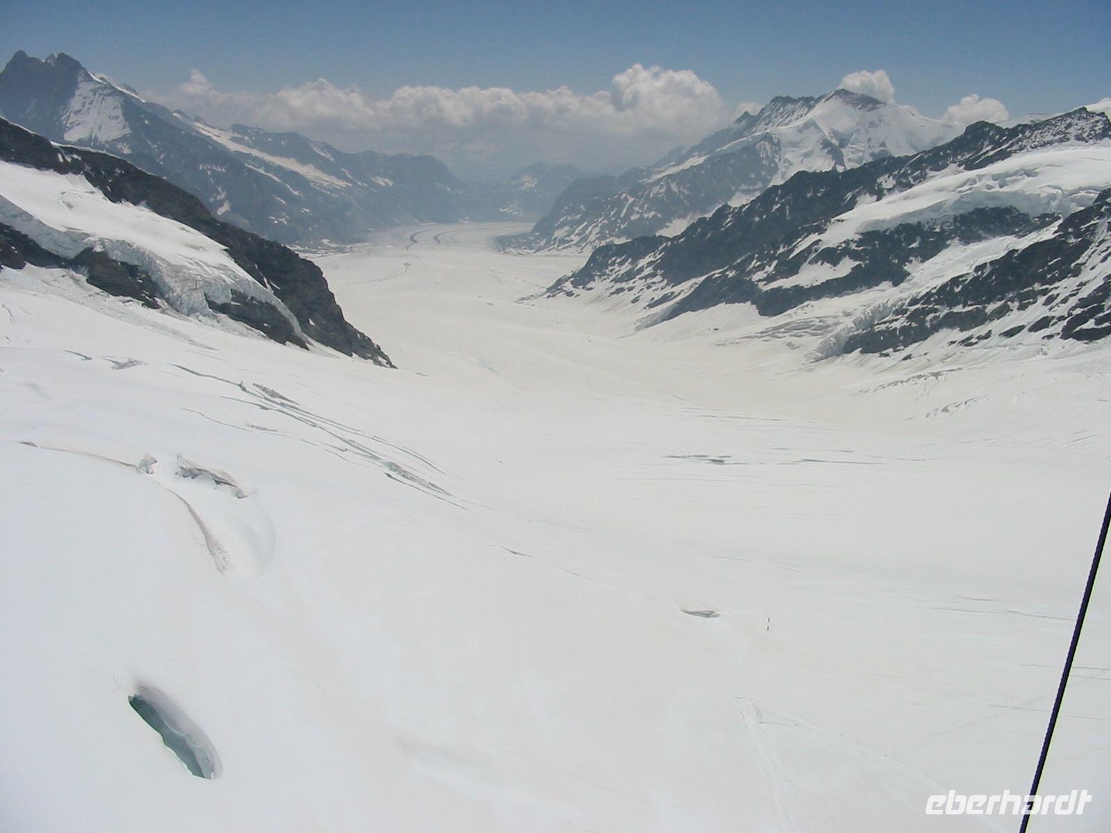 Mit einem Lift fuhren wir noch einmal 100 Meter höher zur Sphinx-Terasse. Bei herrlichstem Sonnenschein erschloss sich uns von hier eine Welt aus Eis und Schnee, angefangen mit dem herrlichen Ausblick auf den Aletschgletscher.